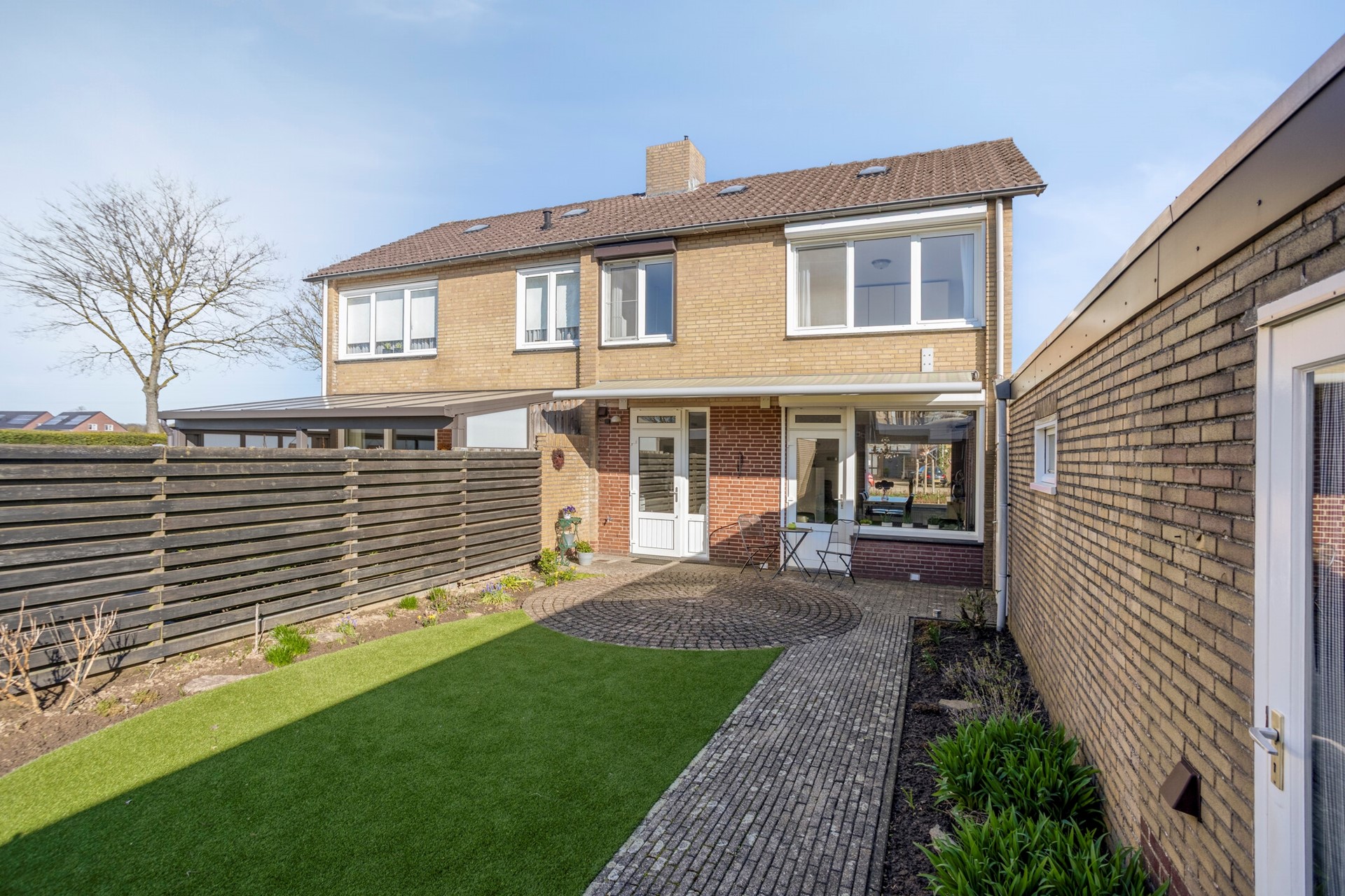 De woning is gelegen op een fijn perceel met aan de voorzijde een oprit met toegang tot de garage en de achterzijde van de woning. De garage (ca. 13 m²) en de berging (ca. 16 m²) zijn voorzien van een tegelvloer, de garage van een elektrisch bedienbare sectionaalpoort en de berging van een loopdeur. De onderhoudsvriendelijke achtertuin is gelegen op het zuiden en is voorzien van een terras met zonnescherm, kunstgras en borders met beplanting.