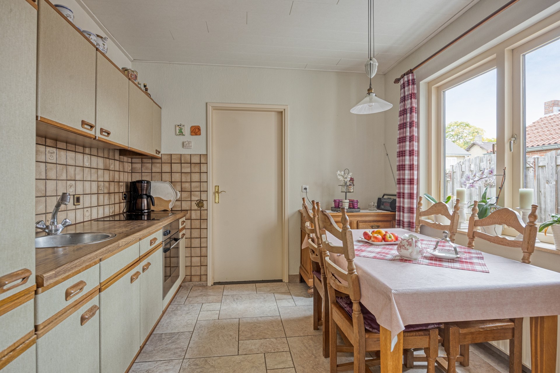 De keuken (ca. 9 m²) is eveneens voorzien van een tegelvloer met vloerverwarming en een keukenopstelling met apparatuur (elektrische kookplaat, afzuigkap, oven, koelkast) en beschikt over voldoende werk- en kastruimte. Aansluitend aan de keuken is de bijkeuken (ca. 6 m²) gesitueerd. Deze is voorzien van een tegelvloer, de witgoedaansluitingen en loopdeuren naar de oprit en naar de tuin. Hier bevindt zich ook de toiletruimte welke voorzien is van een wandcloset met fonteintje.