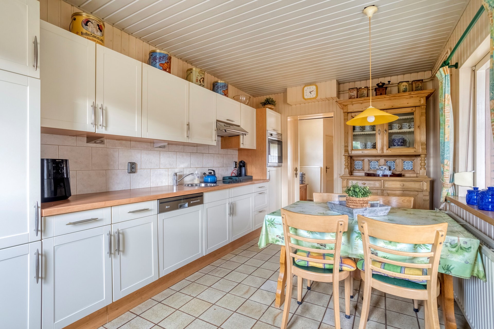 De keuken (ca. 13 m²) is voorzien is van een tegelvloer en een keukenopstelling met apparatuur (elektrische kookplaat, afzuigkap, oven, vaatwasser en koelkast) en beschikt over voldoende werk- en kastruimte. Vanuit de keuken is er toegang tot de serre (ca. 11 m²). De serre is voorzien van een inbouwkast en een loopdeur naar de tuin.