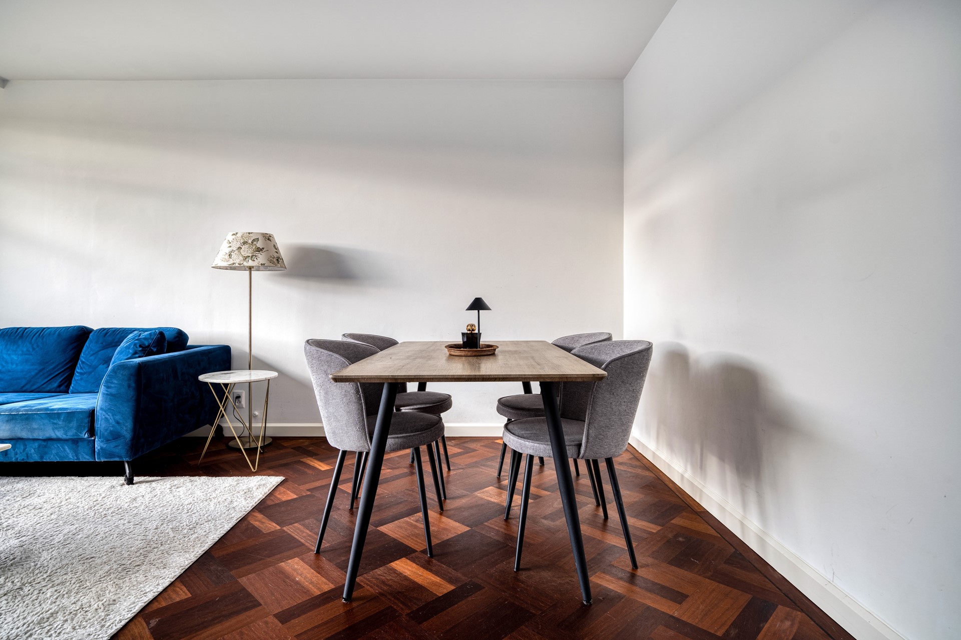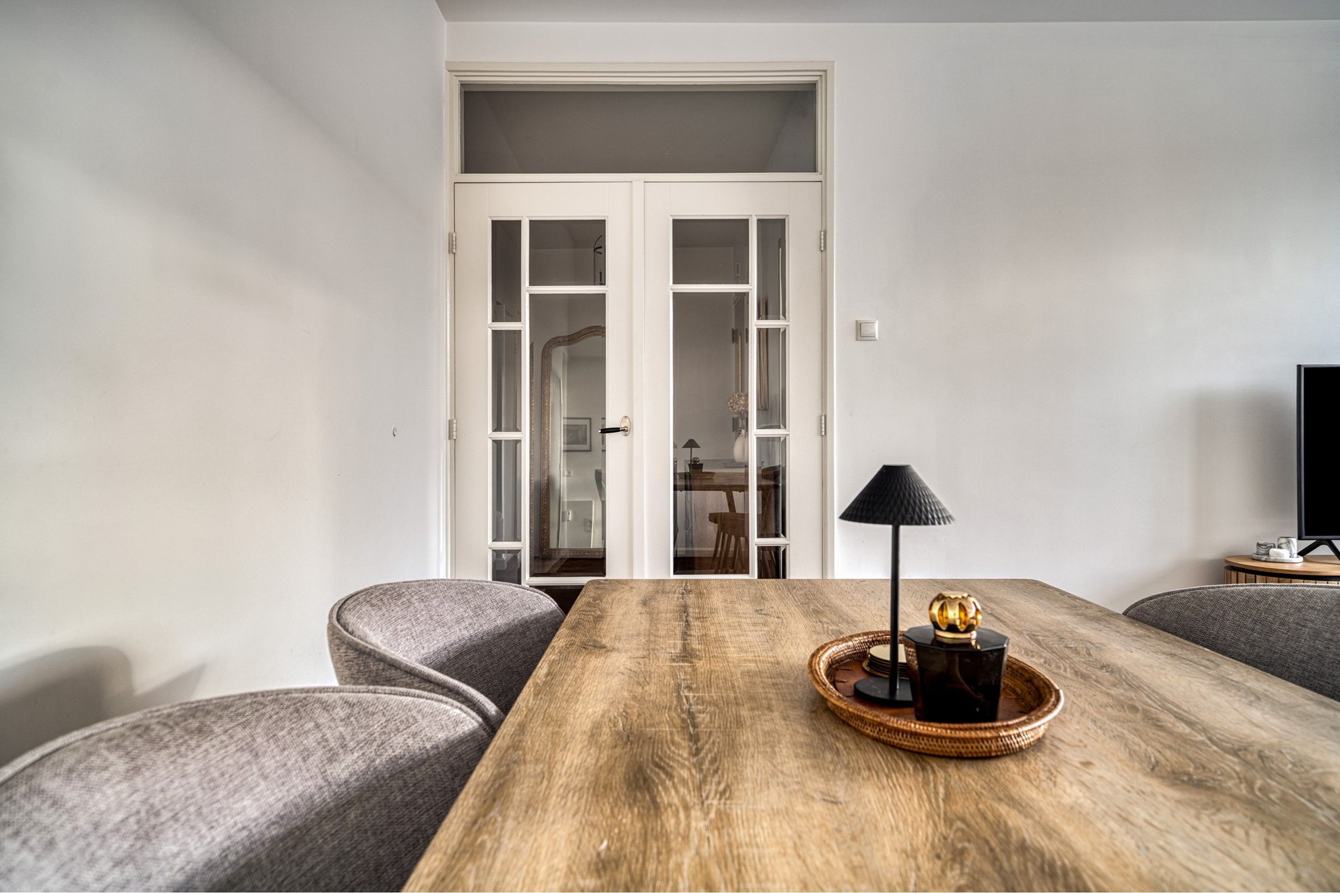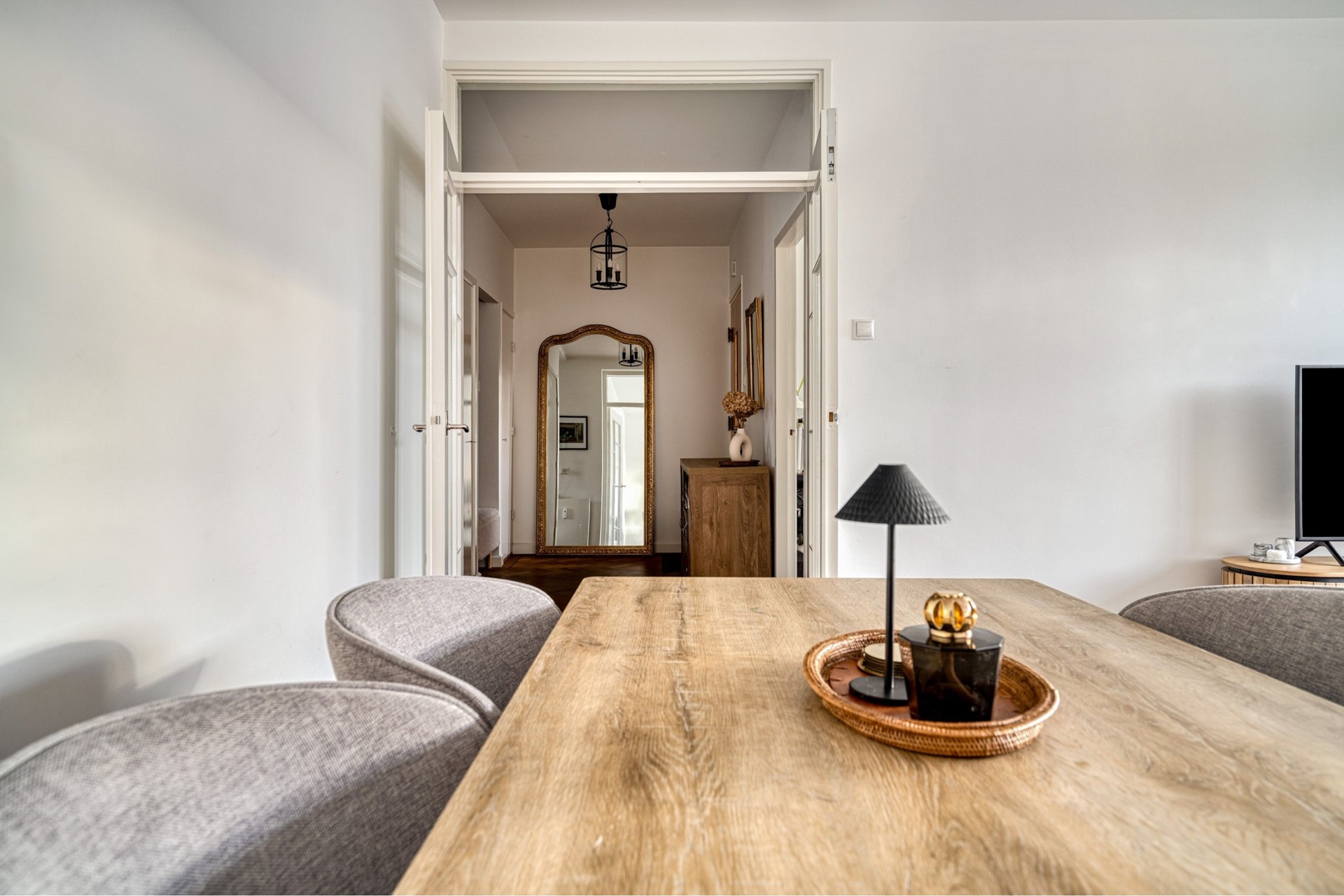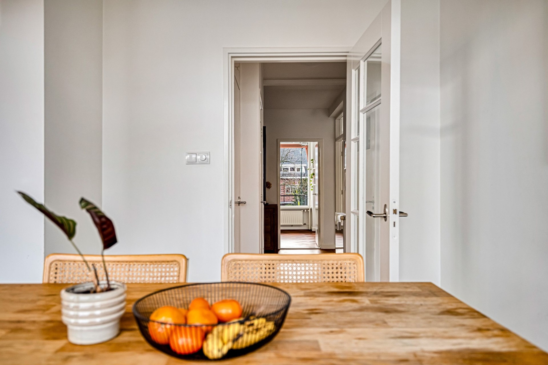 From the hallway you walk straight into the living room, which is southwest-facing. This spacious and bright living area forms the heart of the home and offers a comfortable living environment with ample space for a generous seating area as well as a dining table. Thanks to the large windows, the living room enjoys plenty of natural light and an open view. From the living room there is direct access to the front-facing balcony, where you can sit outside in peace while enjoying views of the green surroundings.