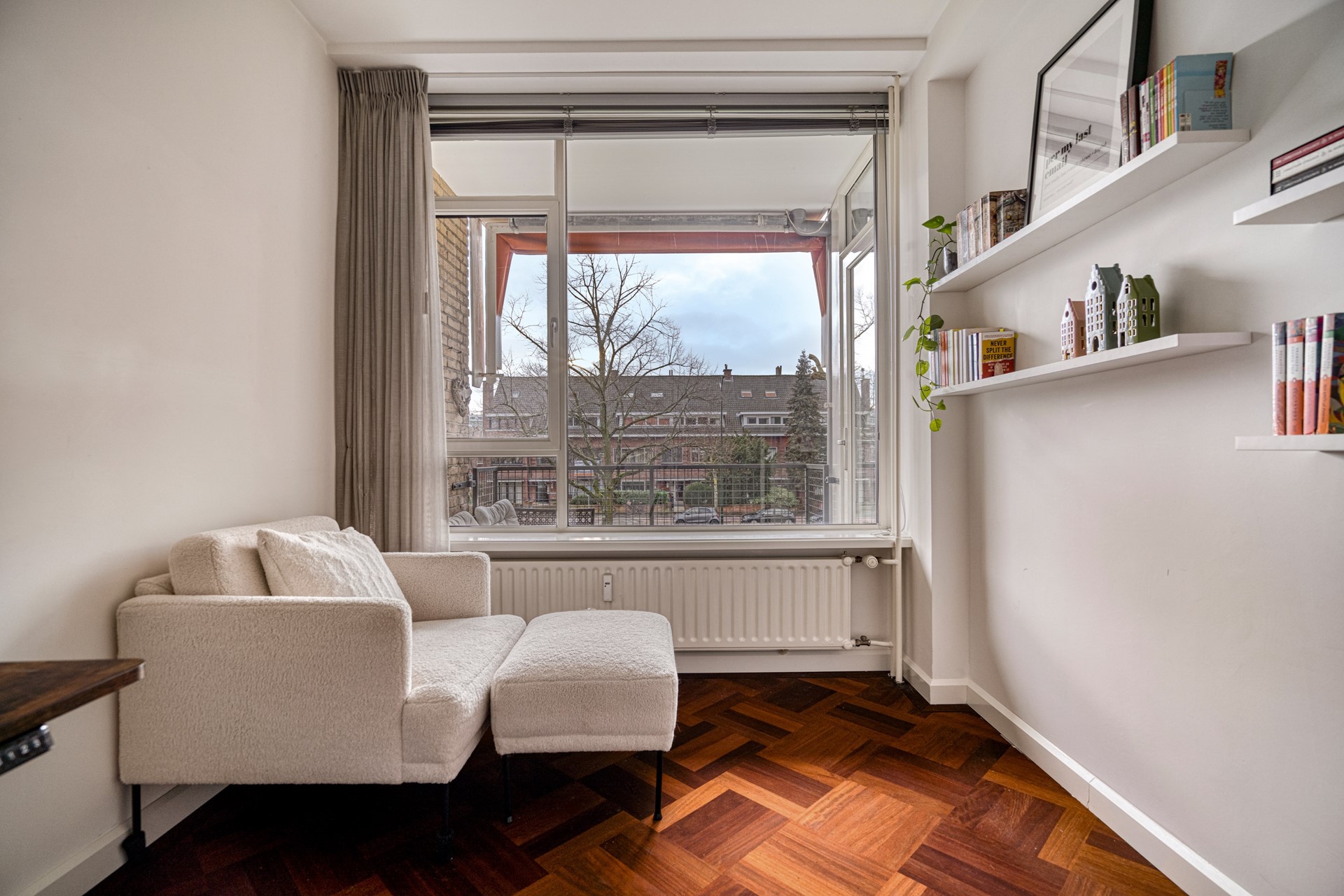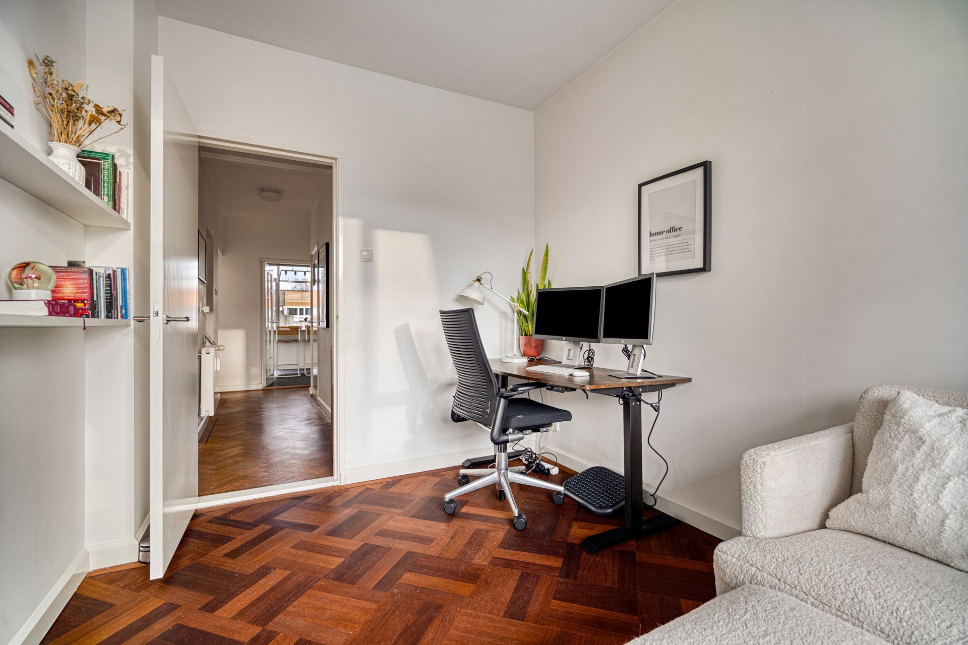 Aangrenzend aan de woonkamer bevindt zich een extra kamer die momenteel is ingericht als studeerkamer. Deze ruimte leent zich uitstekend als thuiswerkplek, logeerkamer of hobbyruimte en biedt daarmee flexibiliteit in gebruik.