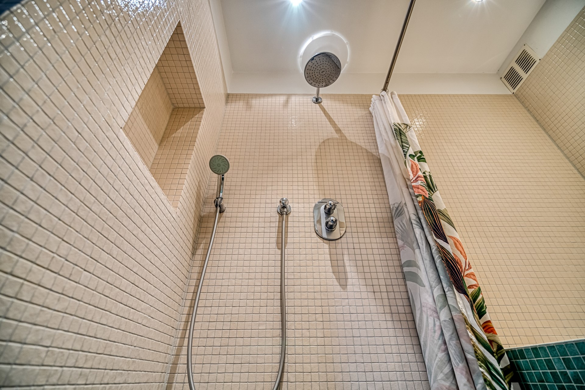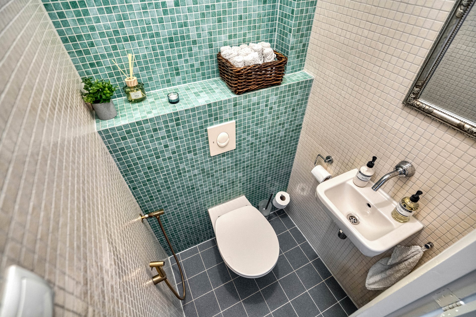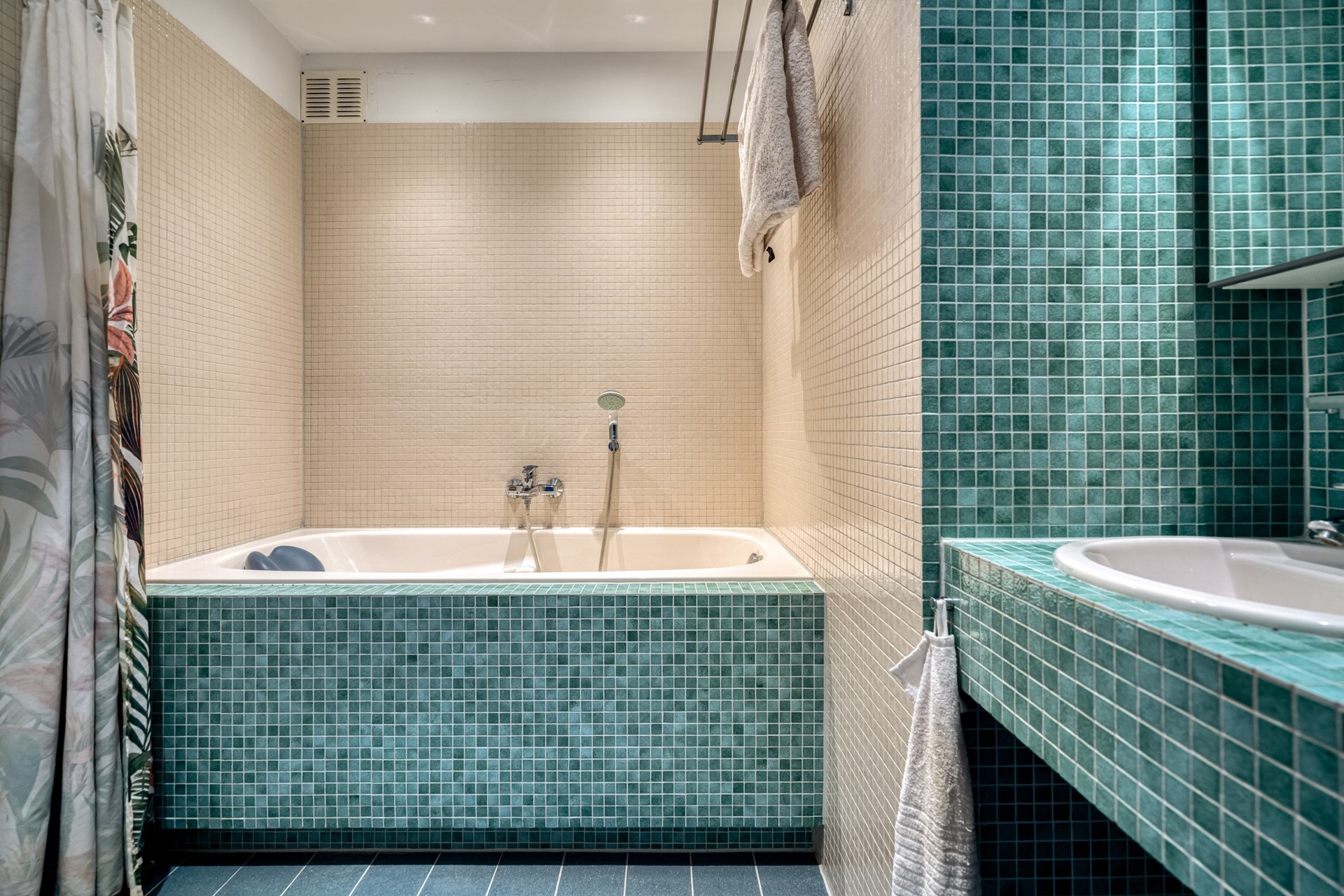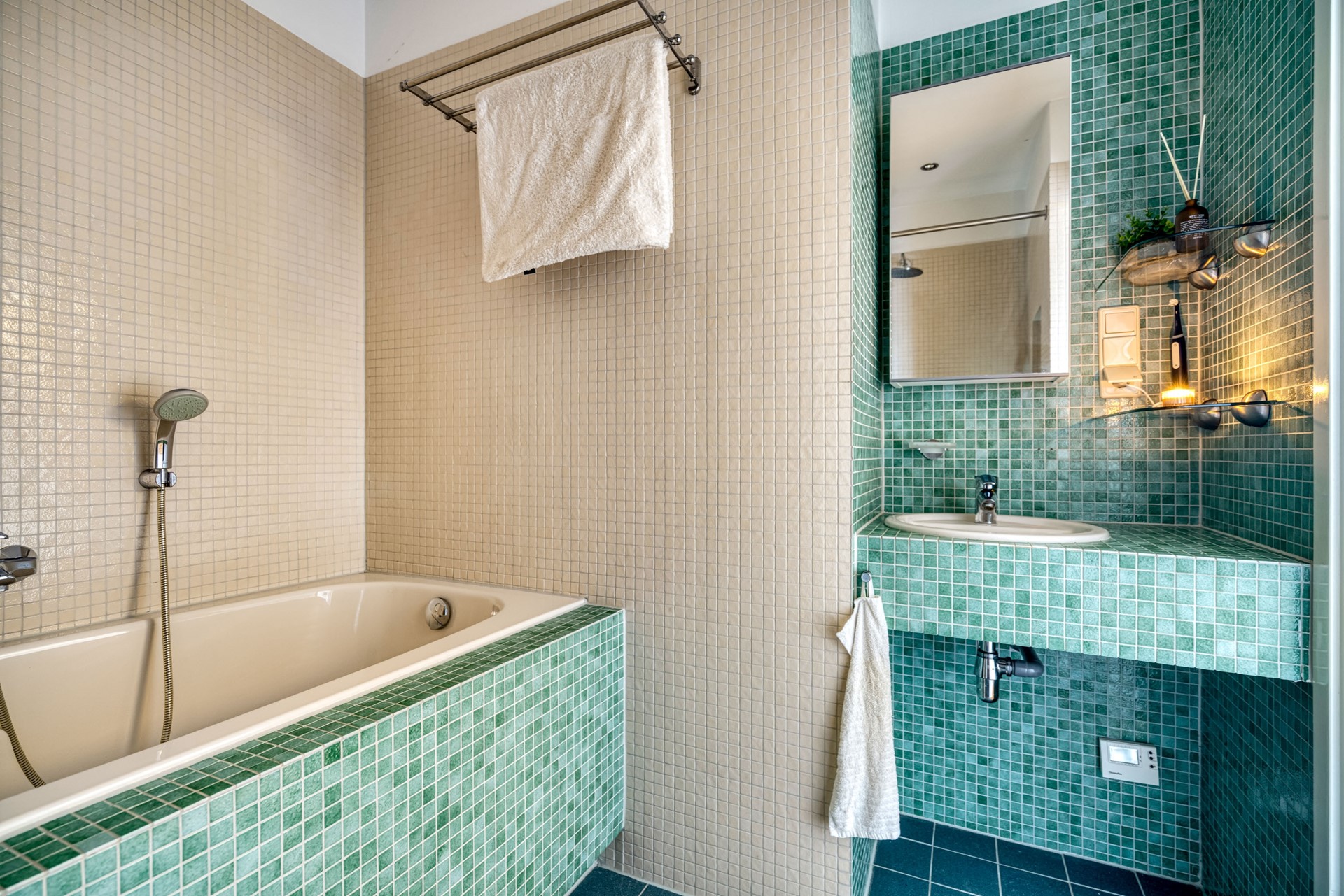 Grenzend aan de hal bevindt zich de badkamer, zonder twijfel de parel van de woning. Deze unieke badkamer heeft een uitgesproken karakter en een tijdloze uitstraling. De combinatie van handgevormde mozaïektegels in zachte zandtinten en diep groenblauwe kleur creëert een warme, bijna spa-achtige sfeer. De badkamer is voorzien van een ligbad met daarboven een praktisch handdoekenrek en een comfortabele douche met ingebouwde douchenis, ideaal voor het opbergen van toiletartikelen.