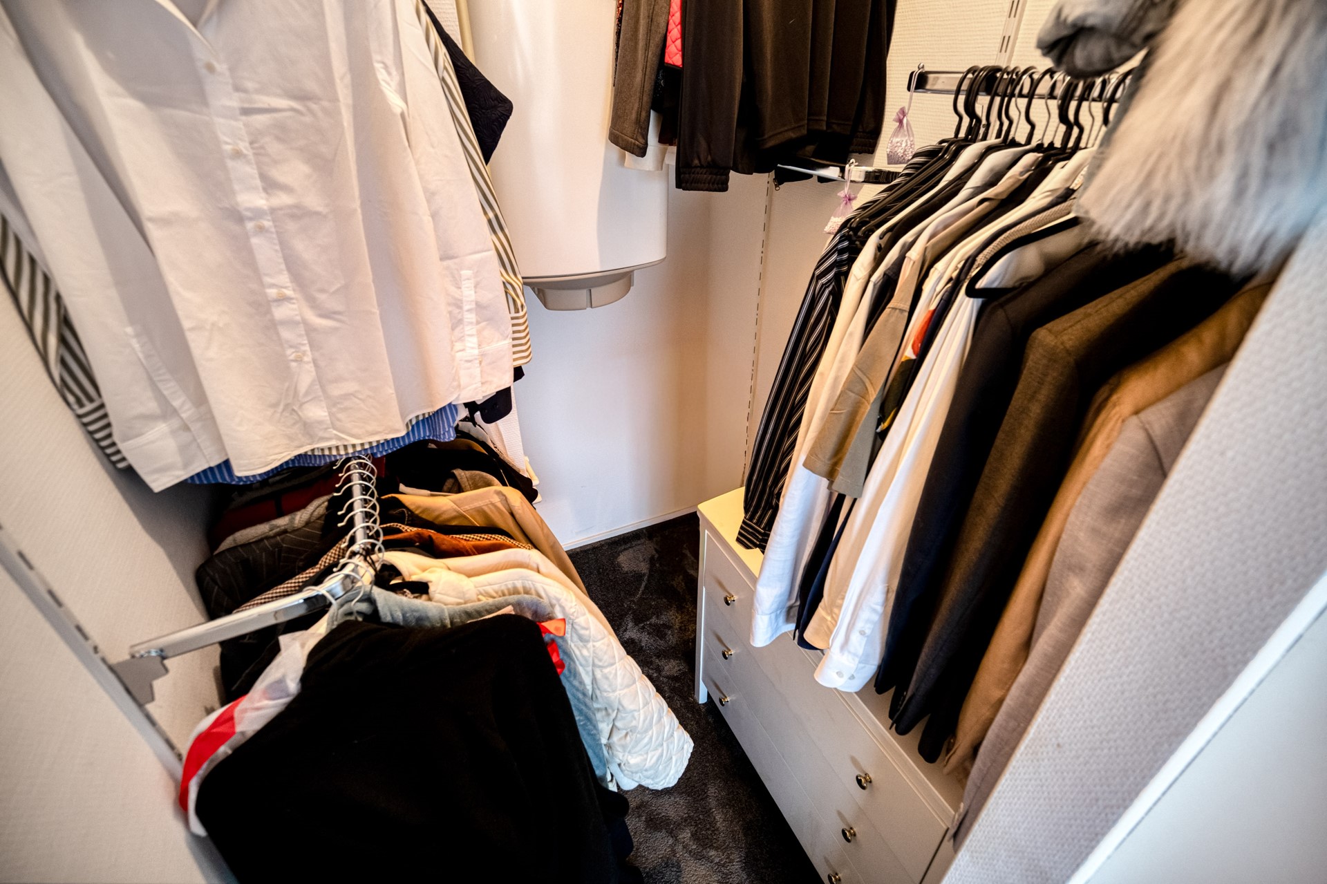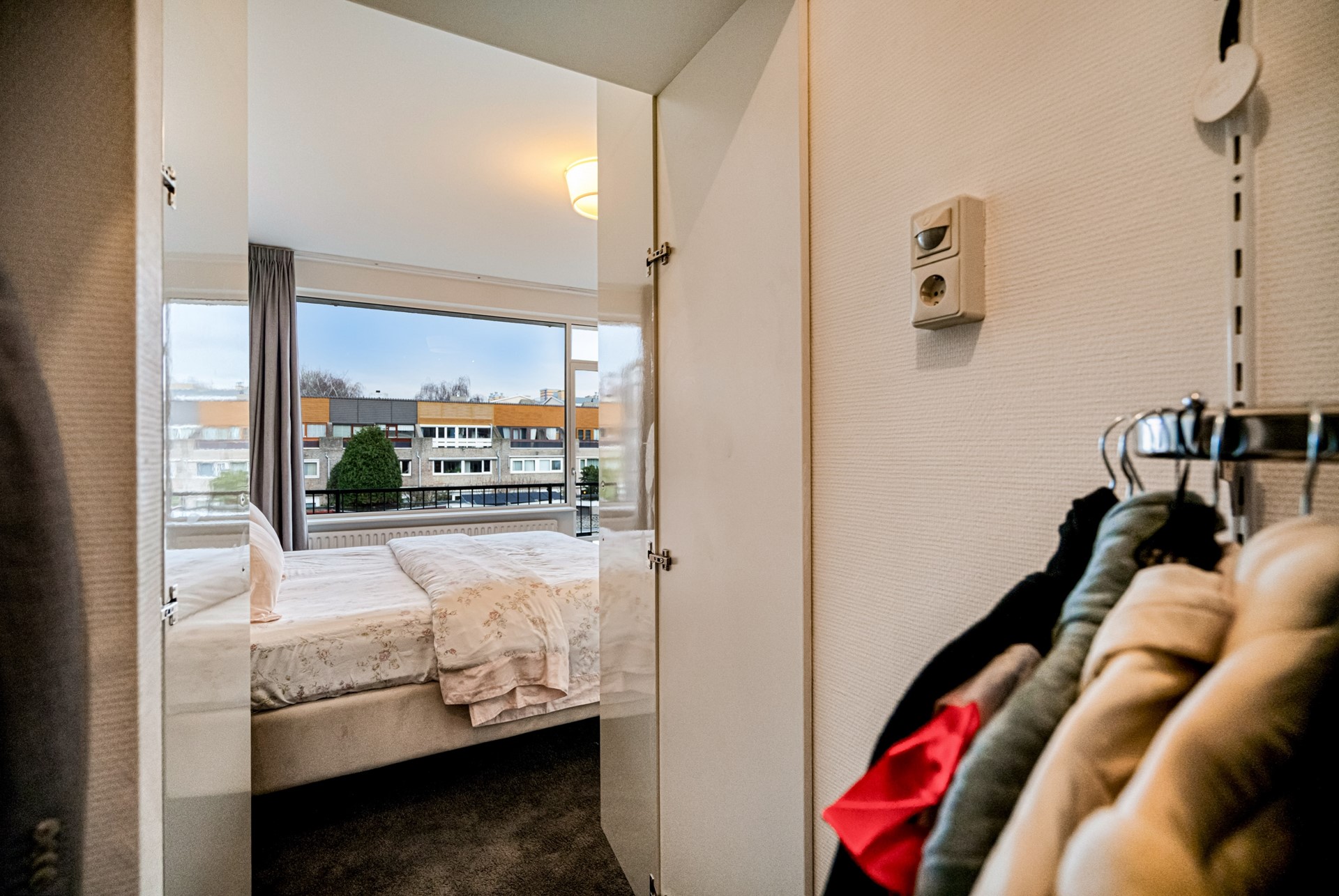 Via de keuken is het ruime balkon aan de achterzijde bereikbaar. Dit balkon is gelegen op het noordoosten en biedt aangename ochtend- en middagzon, wat zorgt voor een frisse en comfortabele buitenruimte, ideaal voor een ontbijt of rustige start van de dag. Het balkon loopt door naar de master bedroom. De master bedroom is ruim van opzet en voorzien van een ingebouwde kledingkast en een separate inloopkast, wat zorgt voor veel praktische bergruimte en wooncomfort.