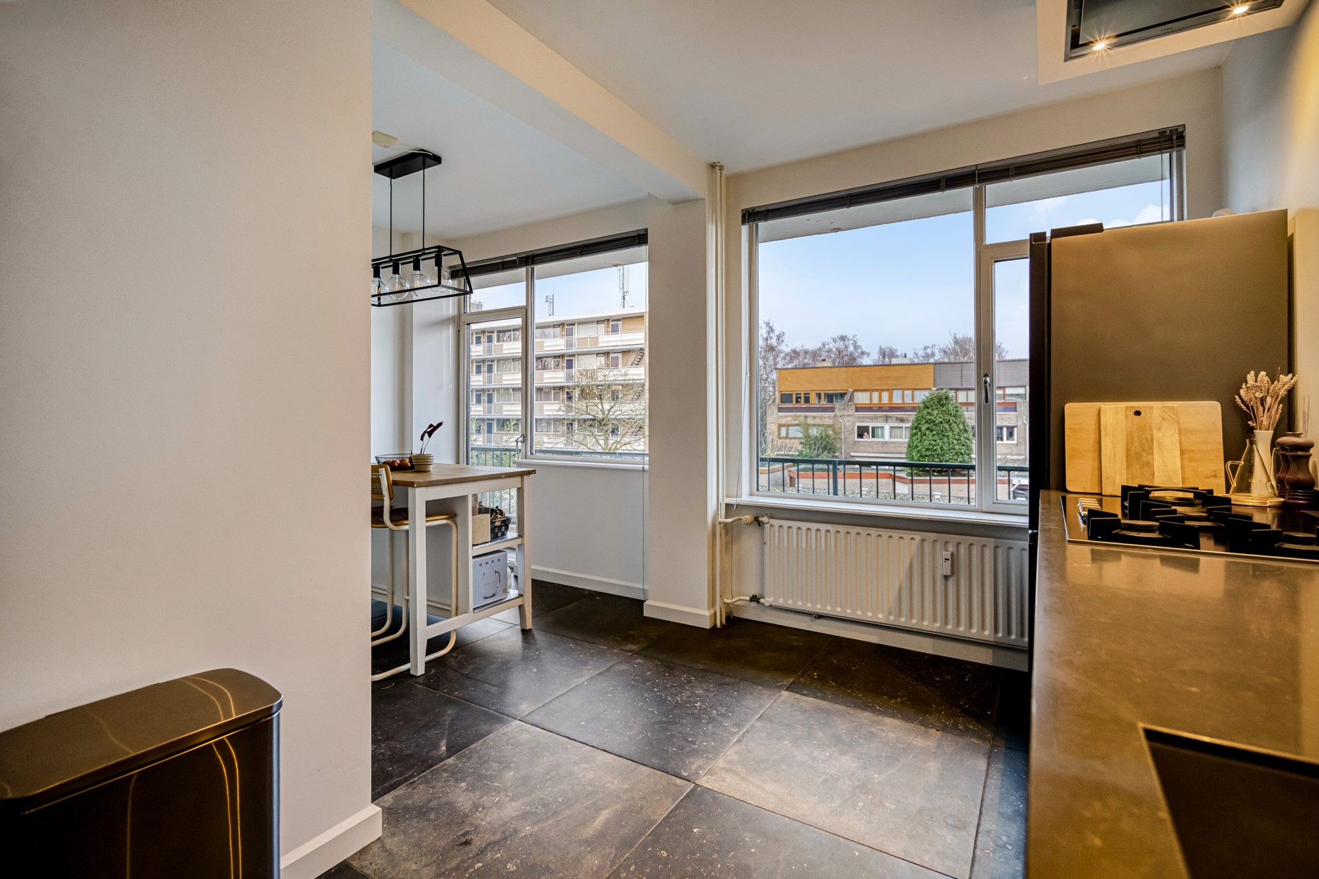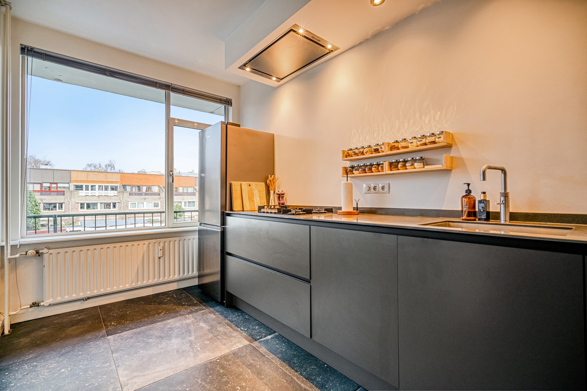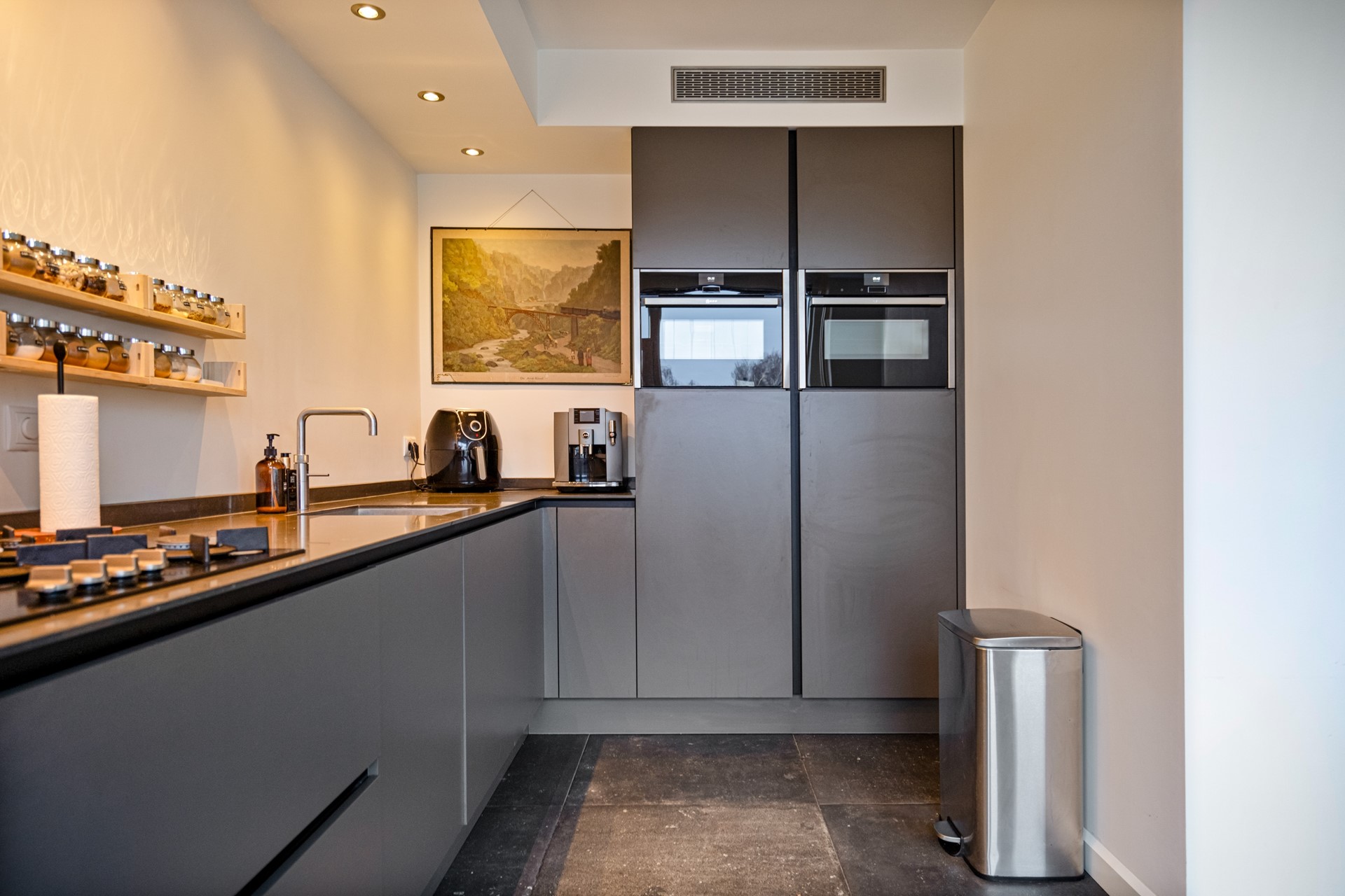 On the other side of the apartment is the spacious and modern open kitchen. The kitchen is sleekly designed and equipped with high-quality built-in appliances, including a four-burner gas hob, integrated extractor hood, dishwasher, double combi oven, and a Quooker. The kitchen features modern recessed lighting and also offers sufficient space for a dining table, making it a pleasant area for cooking and dining together.