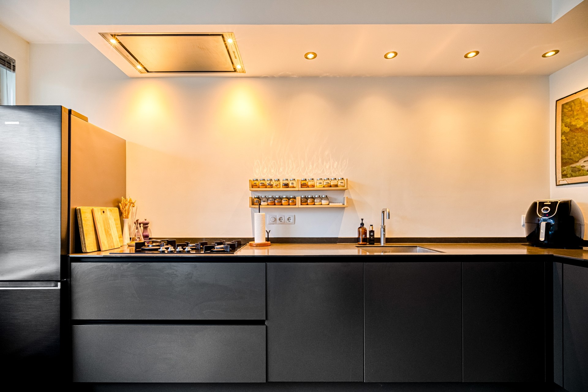 Aan de andere zijde van de woning bevindt zich de ruime en moderne open keuken. De keuken is strak uitgevoerd en voorzien van diverse hoogwaardige inbouwapparatuur, waaronder een vierpits gaskookplaat, ingebouwde koelkast, ingebouwde afzuigkap, vaatwasser, dubbele combi-oven en een Quooker. De keuken beschikt over moderne inbouwspots en biedt bovendien voldoende ruimte voor het plaatsen van een eettafel, waardoor dit een prettige plek is om samen te koken en te eten.