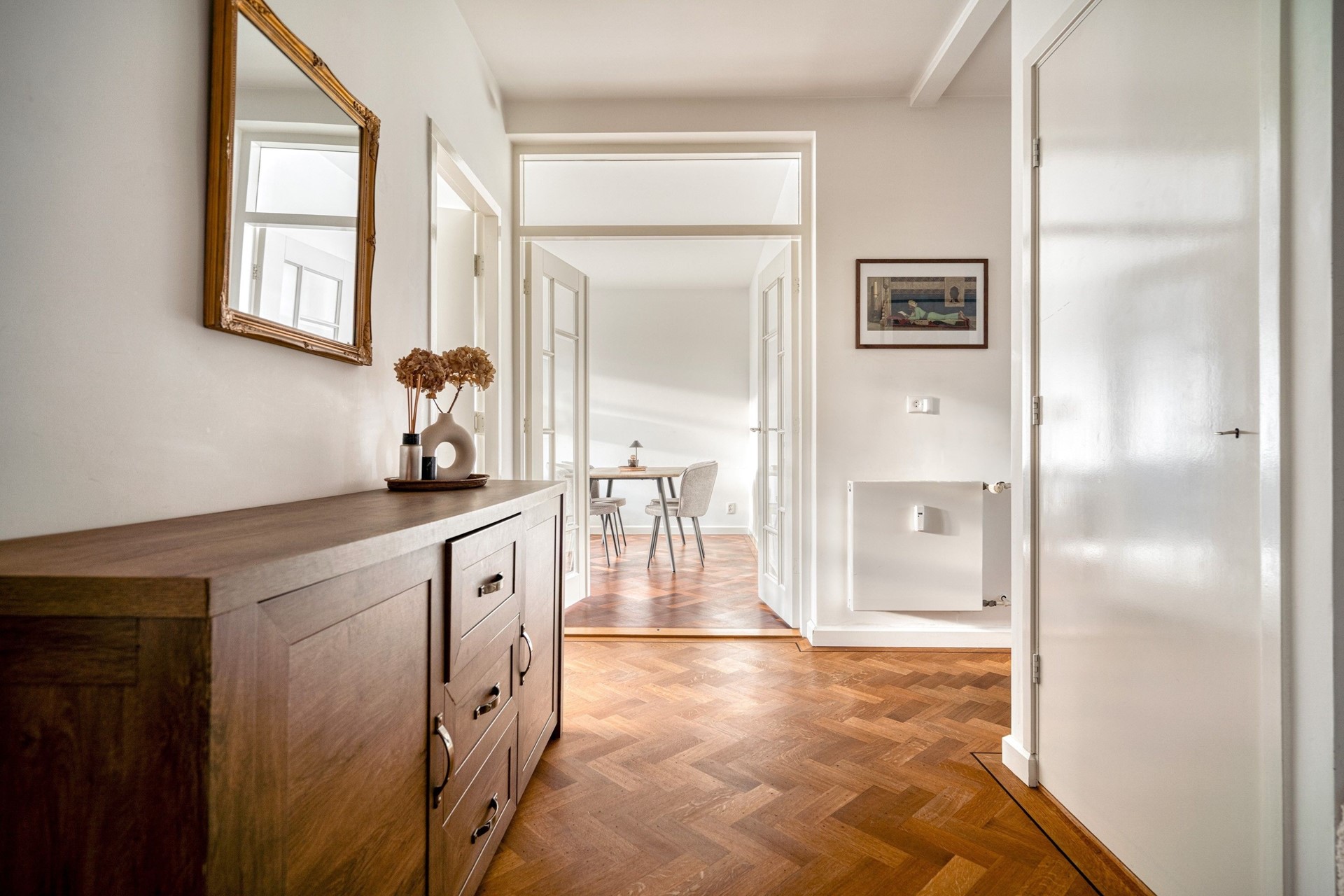 Through the entrance you enter the hallway, which provides access to all rooms in the apartment. The hallway is spacious and offers practical storage space, ideal for neatly storing coats, shoes, and other everyday items. The toilet is also located here. The mosaic tiles in soft sand tones and deep green-blue colors give this space a well-finished and luxurious appearance.