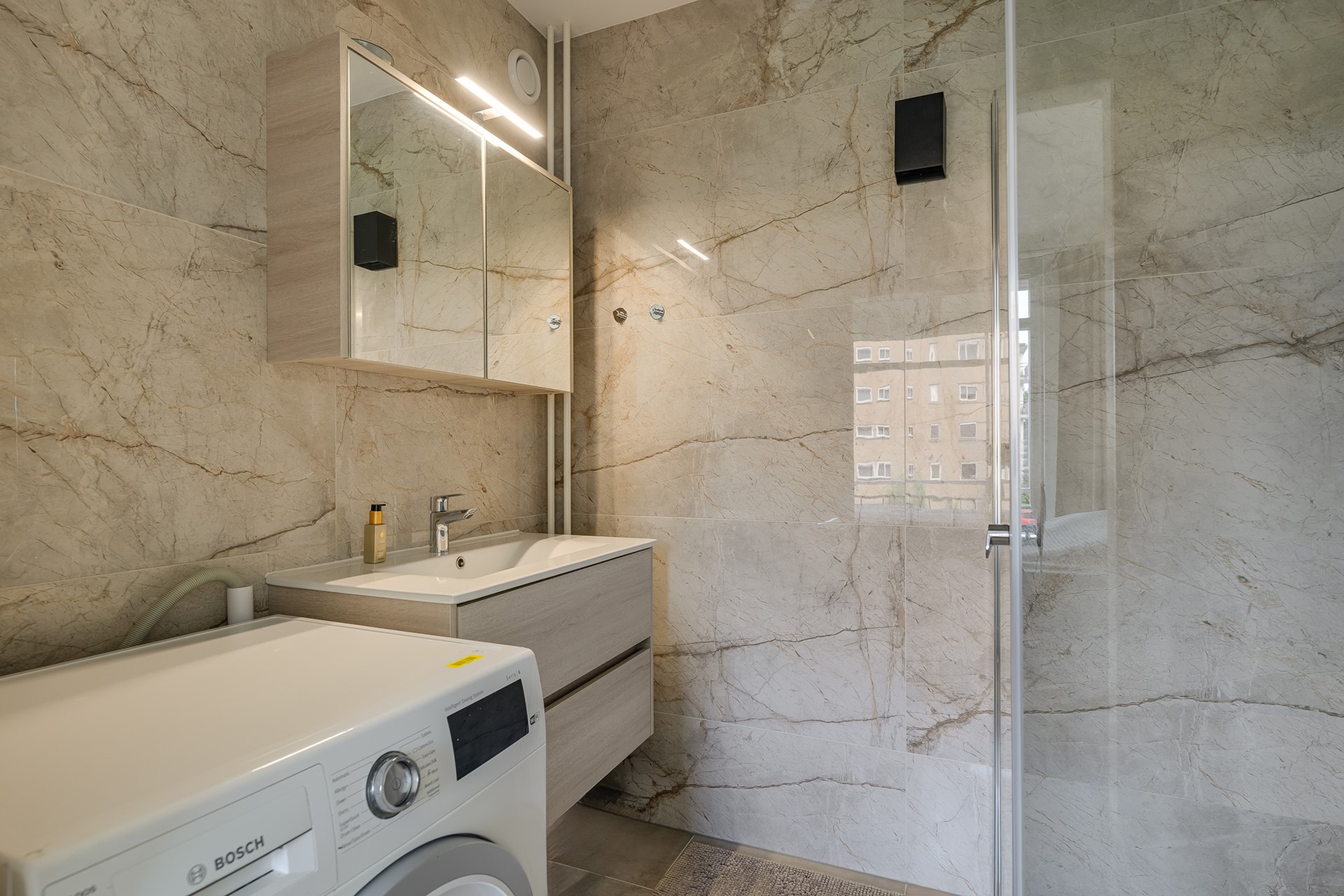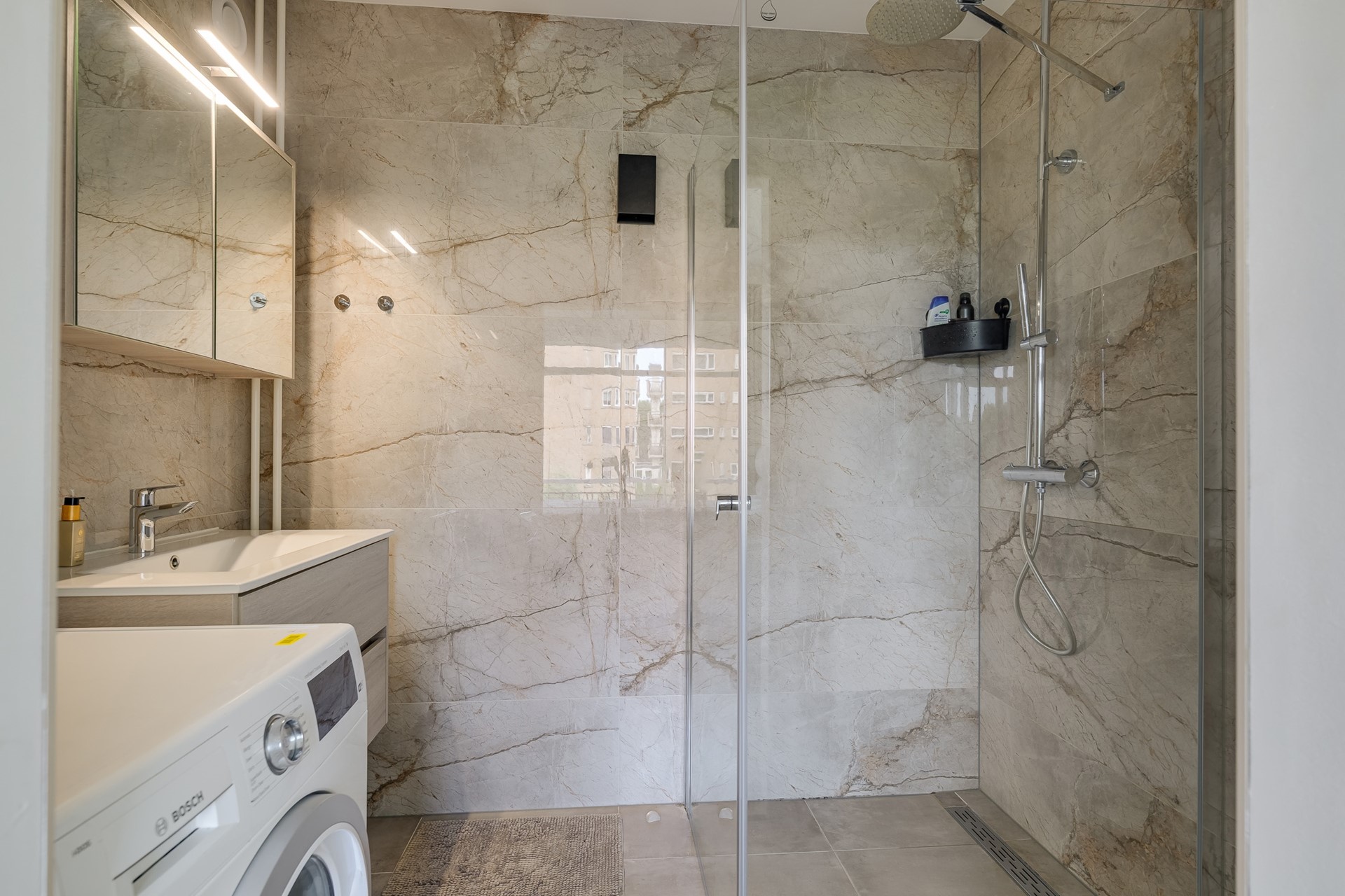 • Hotel-chique badkamer met inloopdouche, stijlvol wastafelmeubel en wasmachineaansluiting