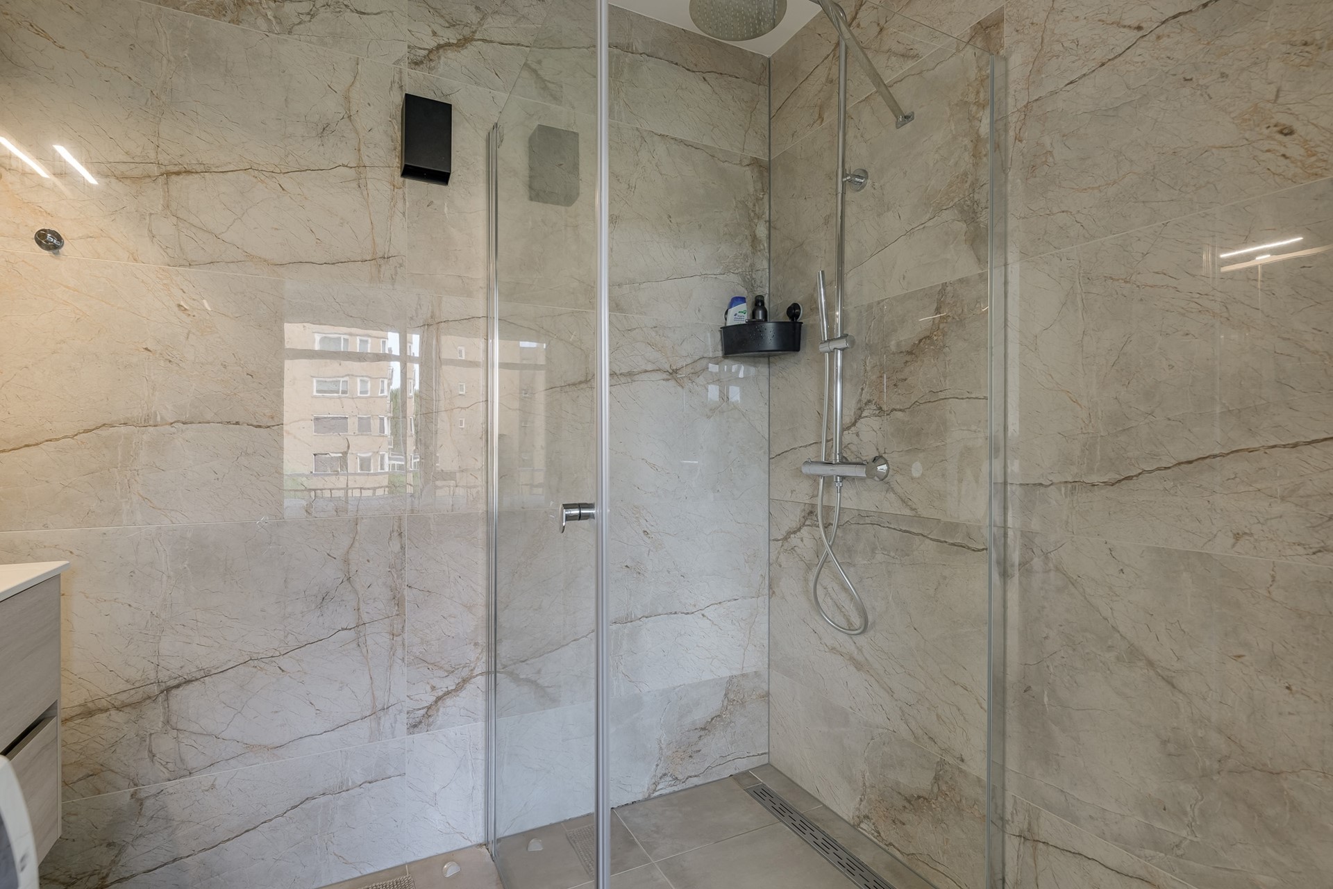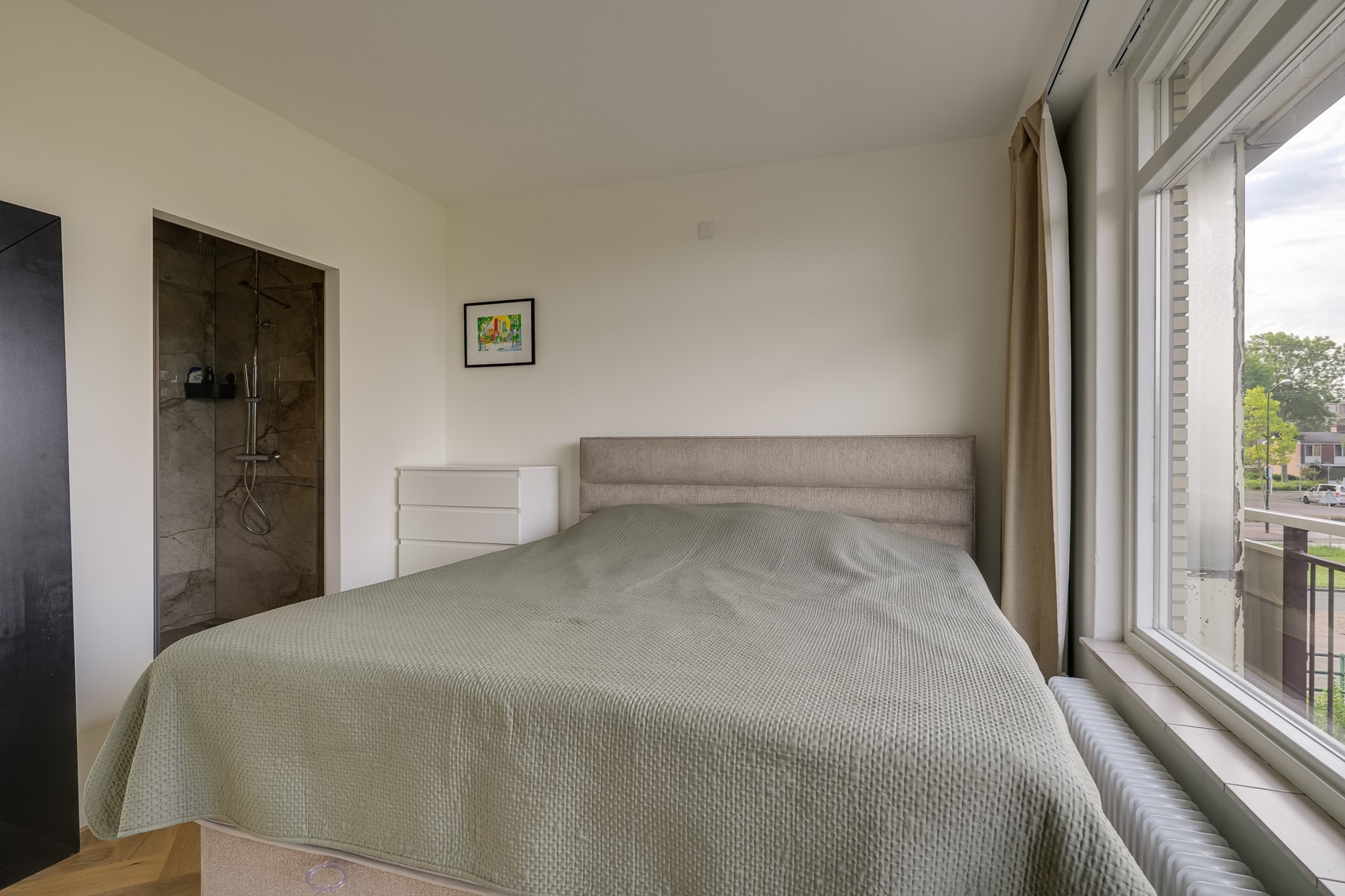 De woonkamer is licht en luchtig dankzij de brede glazen pui. Vanuit hier loop je zo het balkon op. Zet een kop koffie neer, zak onderuit en voel hoe de avondzon je gezicht verwarmt – jouw eigen buitenplek midden in de stad. De slaapkamer ligt rustig en biedt genoeg ruimte voor een comfortabel bed én een kast. Via hier stap je direct de badkamer in: een inloopdouche waar de warme straal je welkom heet, terwijl de moderne tegels een vleugje luxe hotelgevoel geven.
