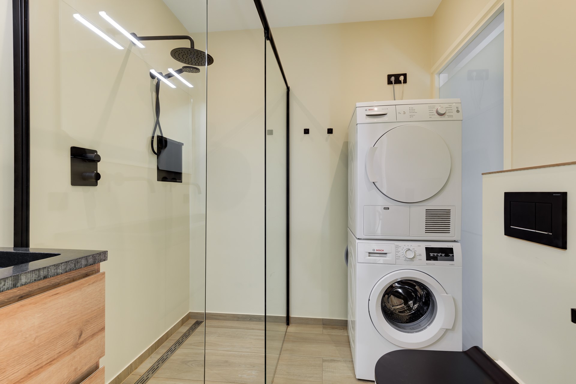 De woning beschikt over twee goed bemeten slaapkamers. De moderne badkamer is stijlvol afgewerkt en voorzien van een ruime inloopdouche, dubbele wastafel en vloerverwarming. Daarnaast is hier een praktische opstelling voor wasmachine en droger gerealiseerd.