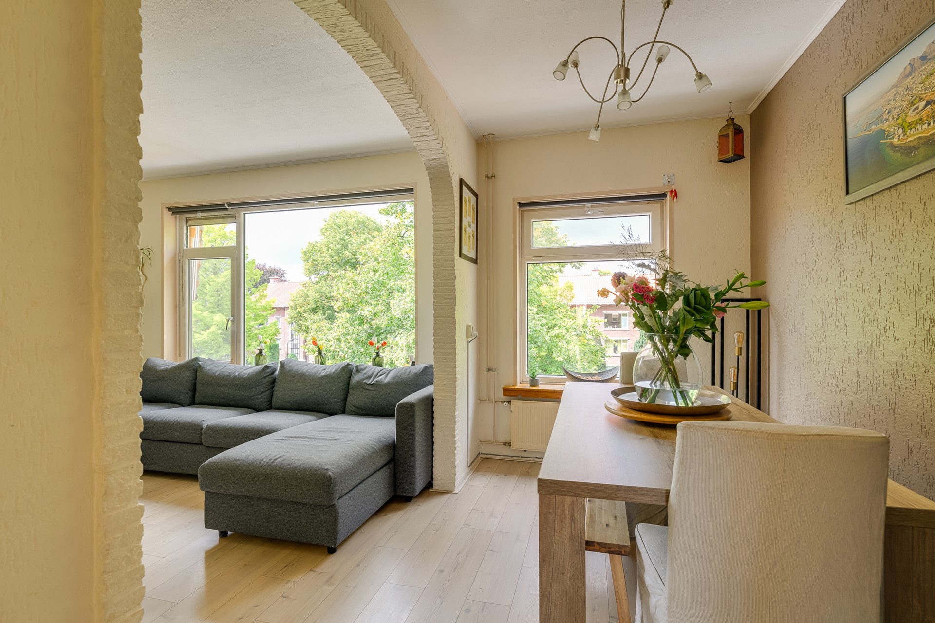 Stap binnen in de hal en voel meteen de ruimte om je heen. De woonkamer baadt in het licht dankzij de brede ramen en biedt volop plek voor een royale zithoek en een gezellige eettafel. Je kijkt uit over groene boomtoppen en ervaart hier elke dag dat gevoel van rust midden in de stad.