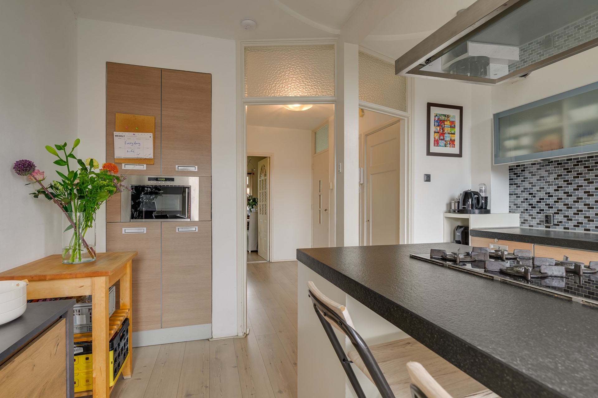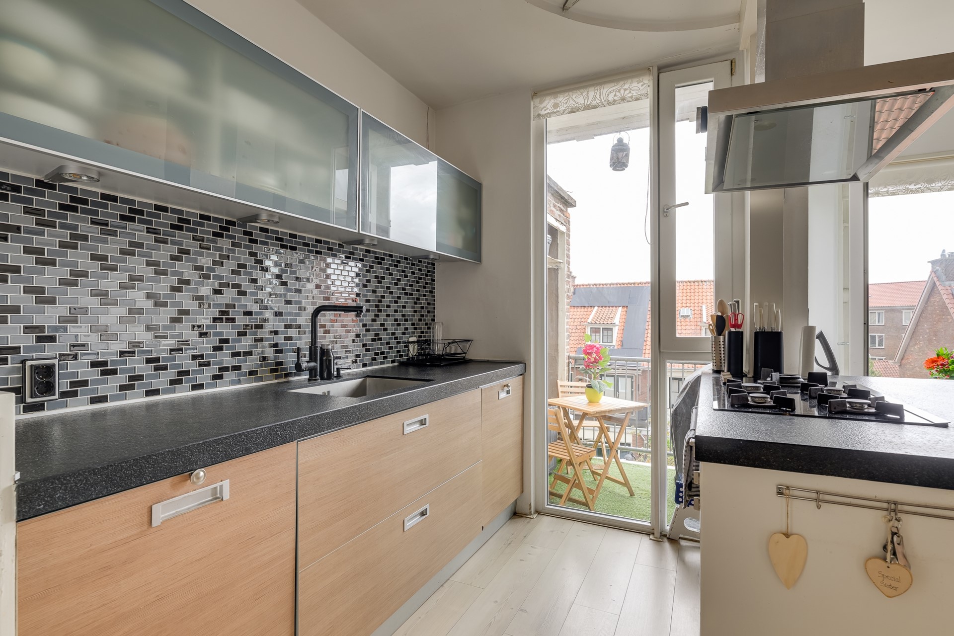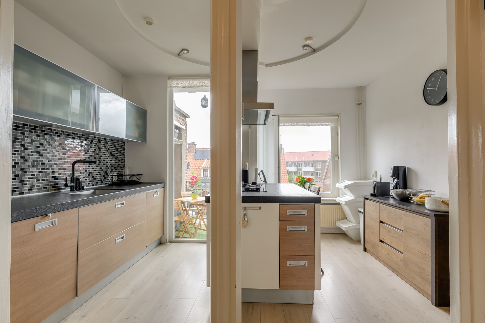 De moderne keuken is een echte eyecatcher: voorzien van kookeiland, strak werkblad, inbouwapparatuur en veel kastruimte. De openslaande deuren leiden je naar het balkon, waar je geniet van de ochtendzon en een kop koffie met uitzicht op de daken van Voorburg.