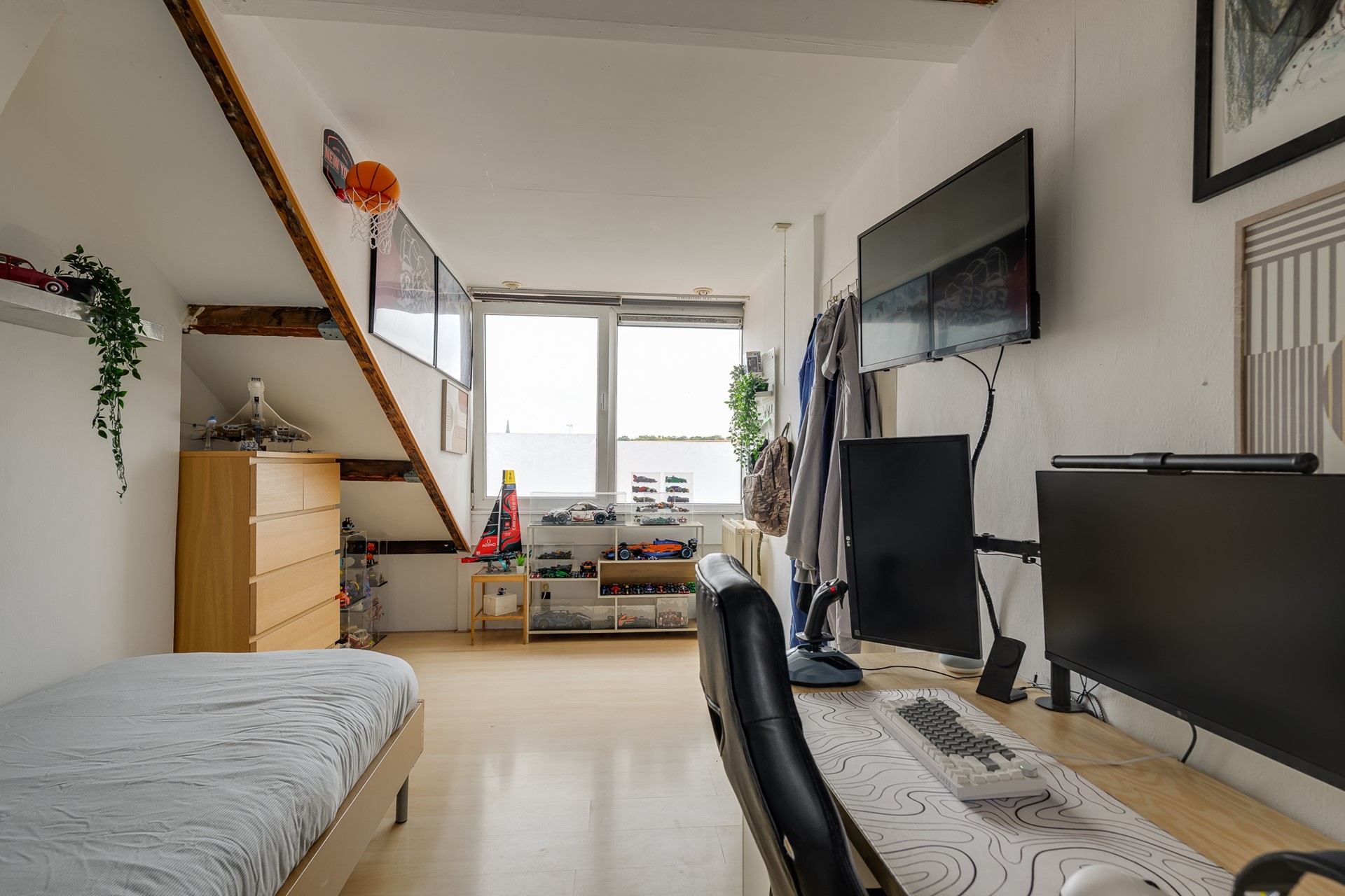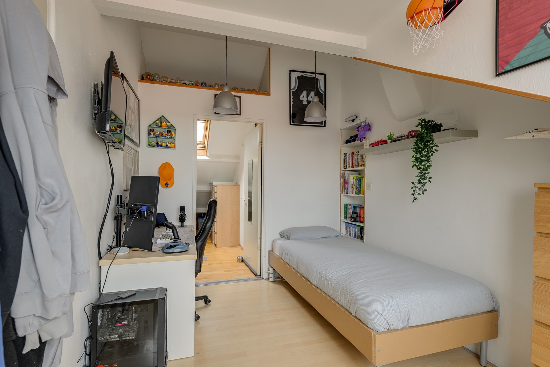 Een vaste trap brengt je naar de tweede woonlaag, waar maar liefst drie slaapkamers op je wachten. Hier heb je de ruimte om je dromen vorm te geven: een masterbedroom met hoge nok en dakramen waar het daglicht naar binnen stroomt, een kinderkamer, een logeerkamer, of juist die walk-in closet waar je altijd al van droomde. De tweede badkamer maakt het plaatje compleet: een ideale indeling voor gezinnen en stellen die ruimte zoeken.