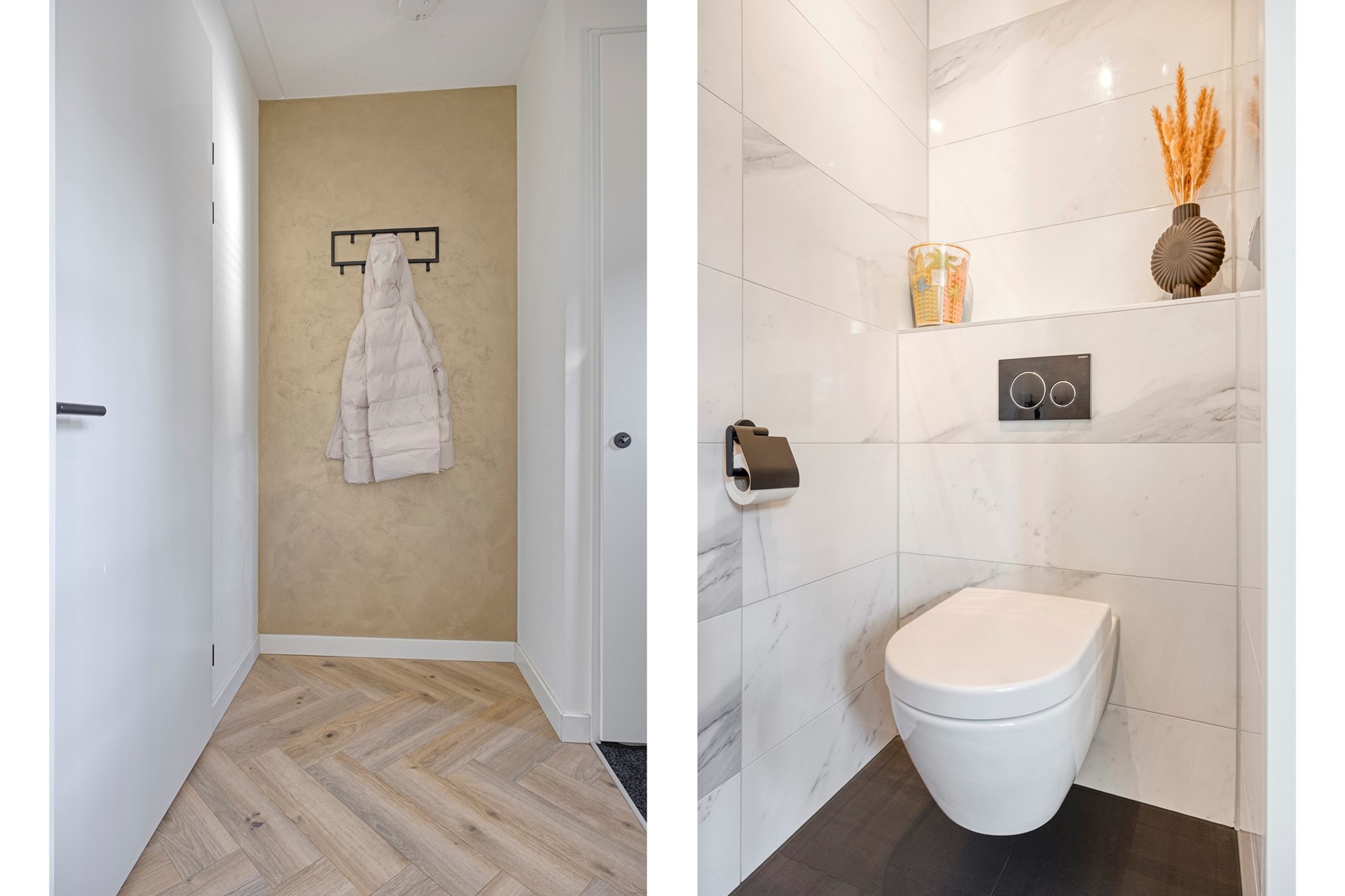 Je komt binnen via de voortuin, waar de verzorgde entree direct de nette en verzorgde uitstraling van het huis laat zien. In de hal vind je de zeer moderne meterkast en het grote toilet is voorzien van een hangend closet.