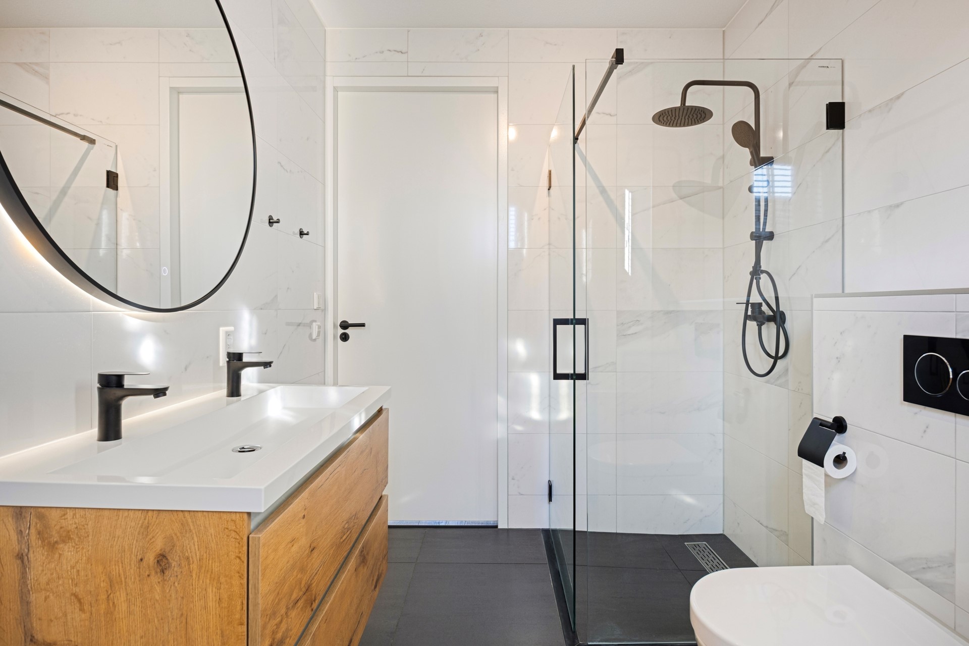 De badkamer is luxe uitgevoerd met een ruime inloopdouche, tweede toilet, bad en een stijlvol wastafelmeubel met bijpassende spiegel. De ruimte is volledig betegeld.