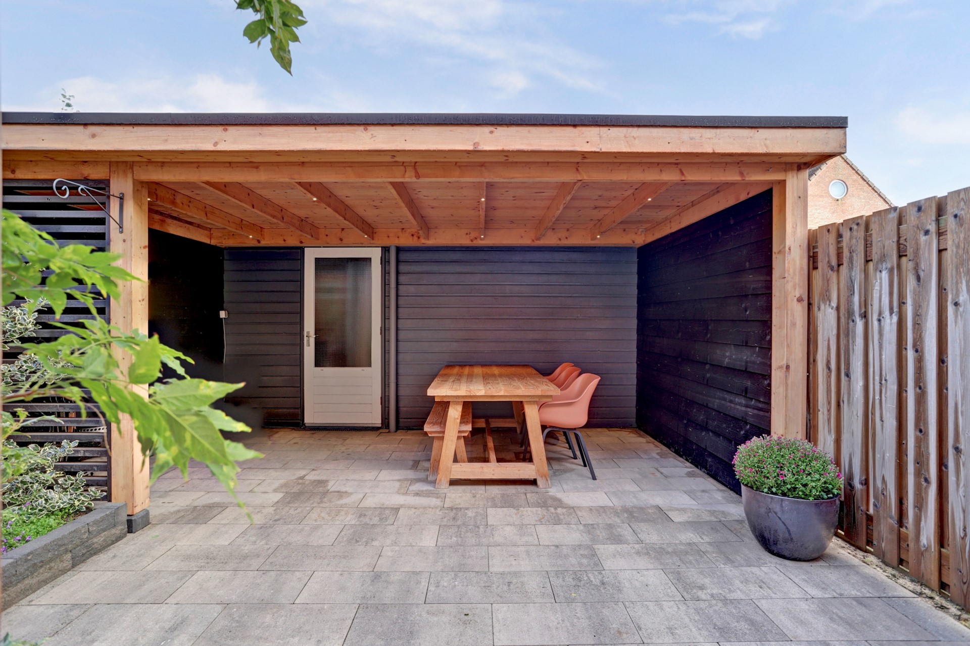 Vanuit de woonkeuken stap je zo de fraai aangelegde achtertuin in. Hier geniet je van het groen en de fijne overkapping, waardoor je ook ’s avonds of bij regen lekker buiten kunt zitten.