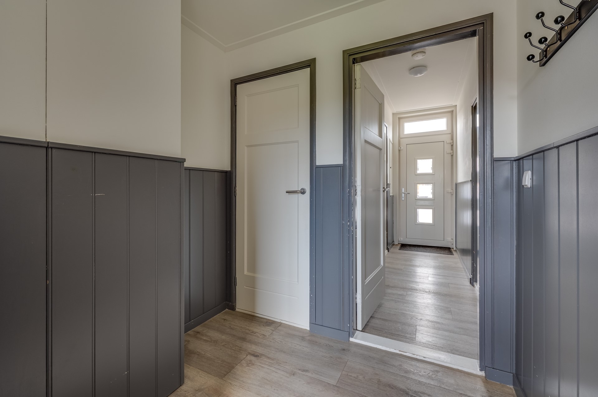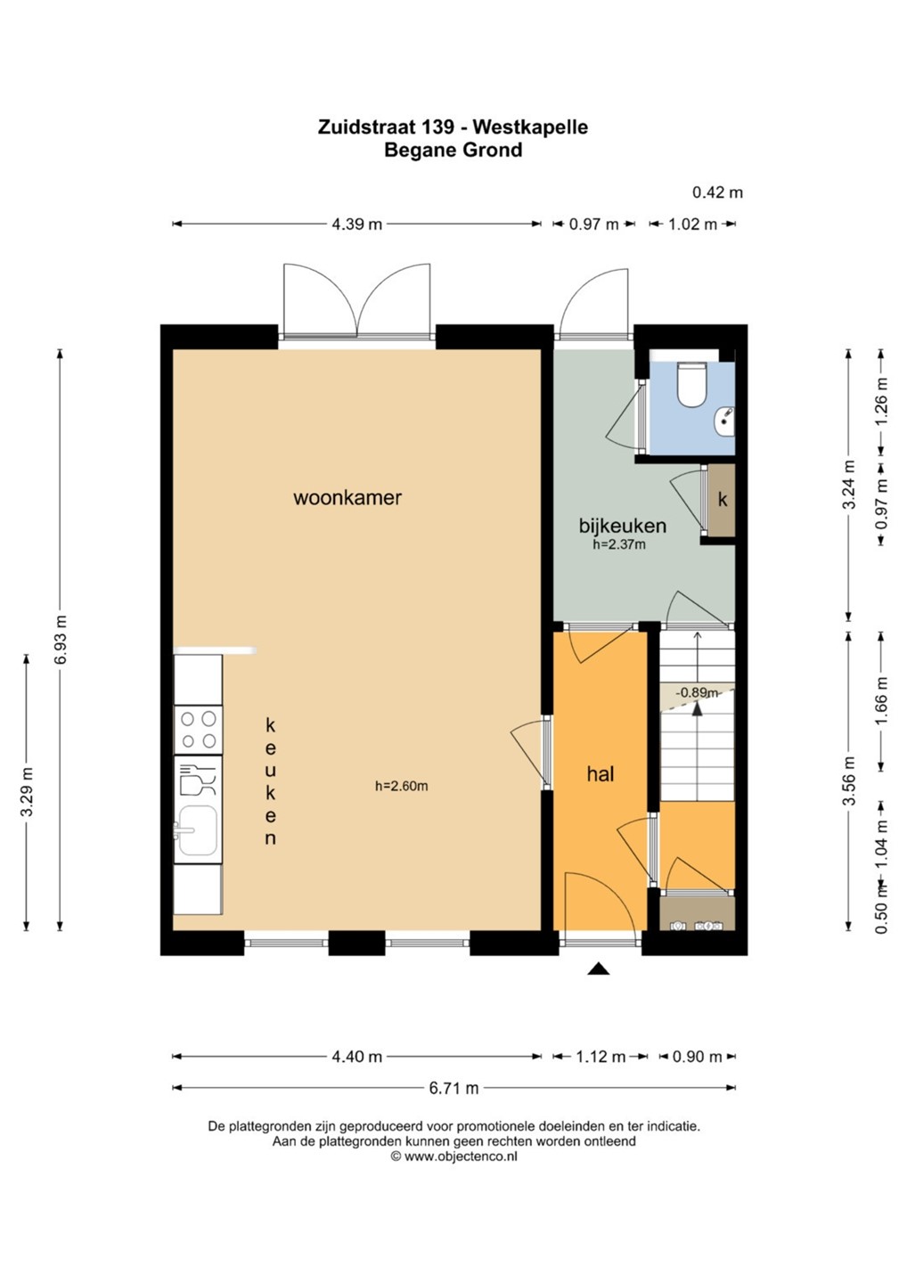 Begane grond, hal met meterkast en vaste trap naar eerste verdieping. Vanuit de hal deur naar de woonkamer en deur naar de bijkeuken. In de bijkeuken ruimte voor wasmachine en droger. Tevens is hier een vaste kast met combiketel opstelling. En achterin de bijkeuken apart toilet.