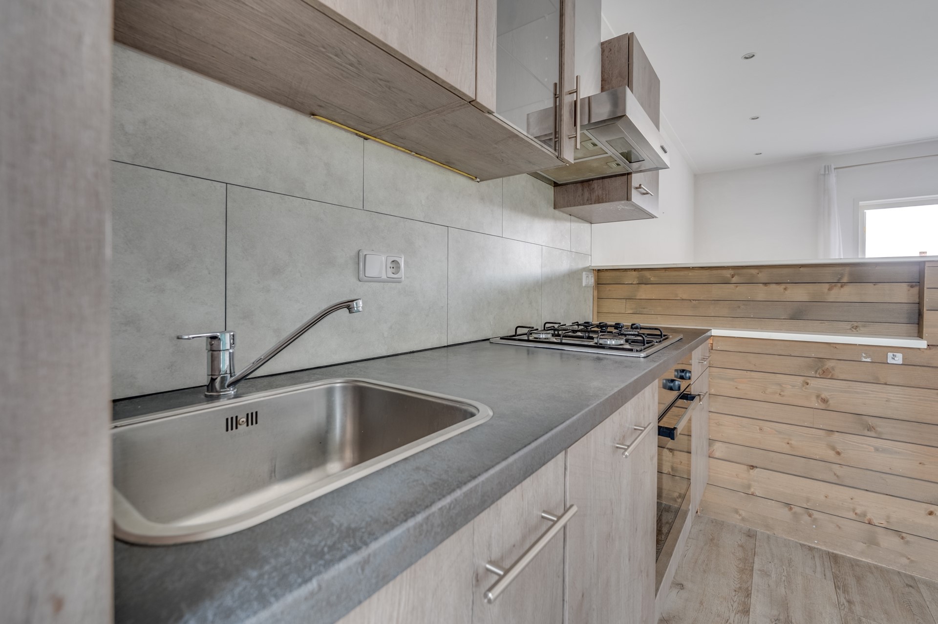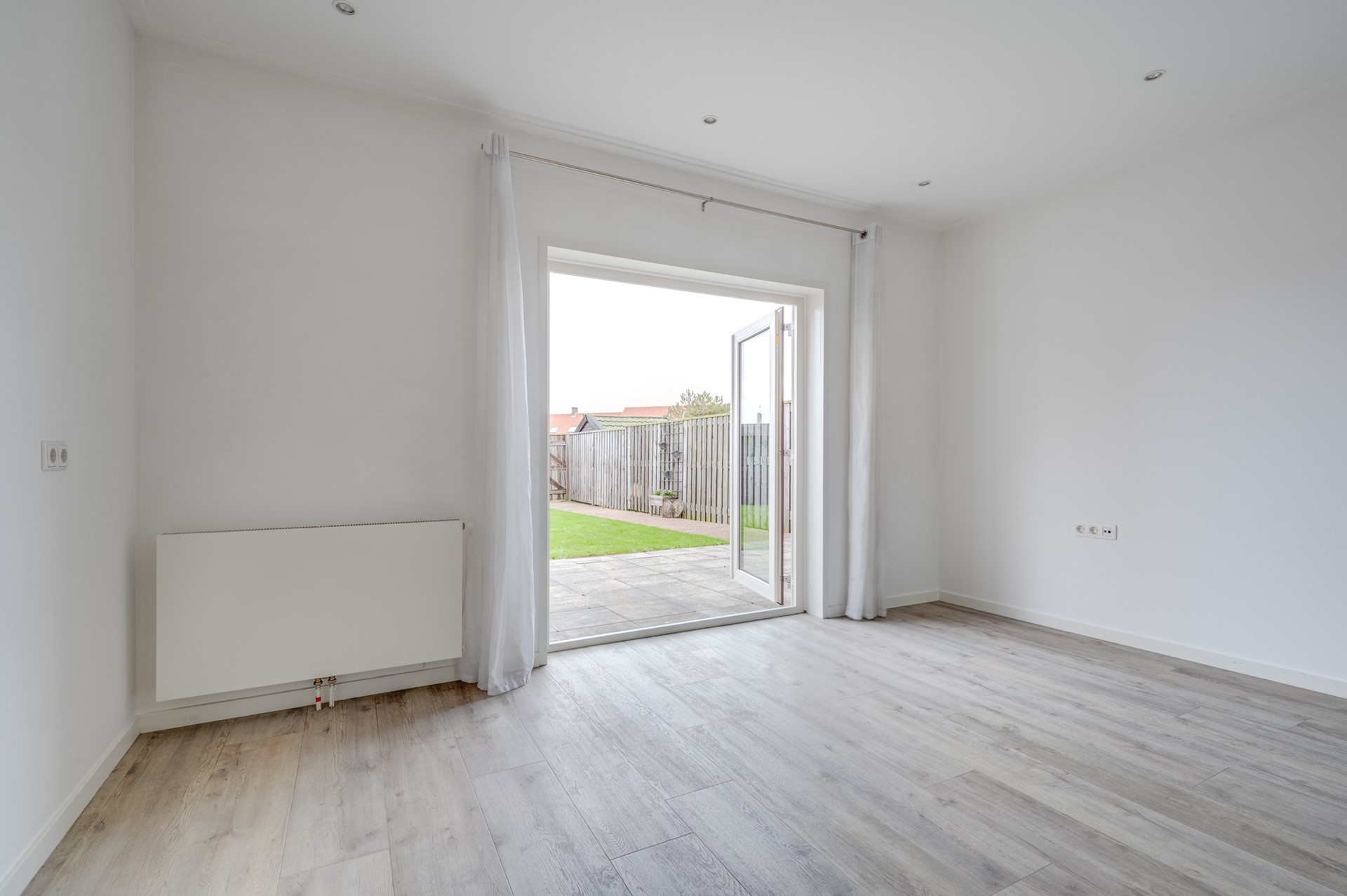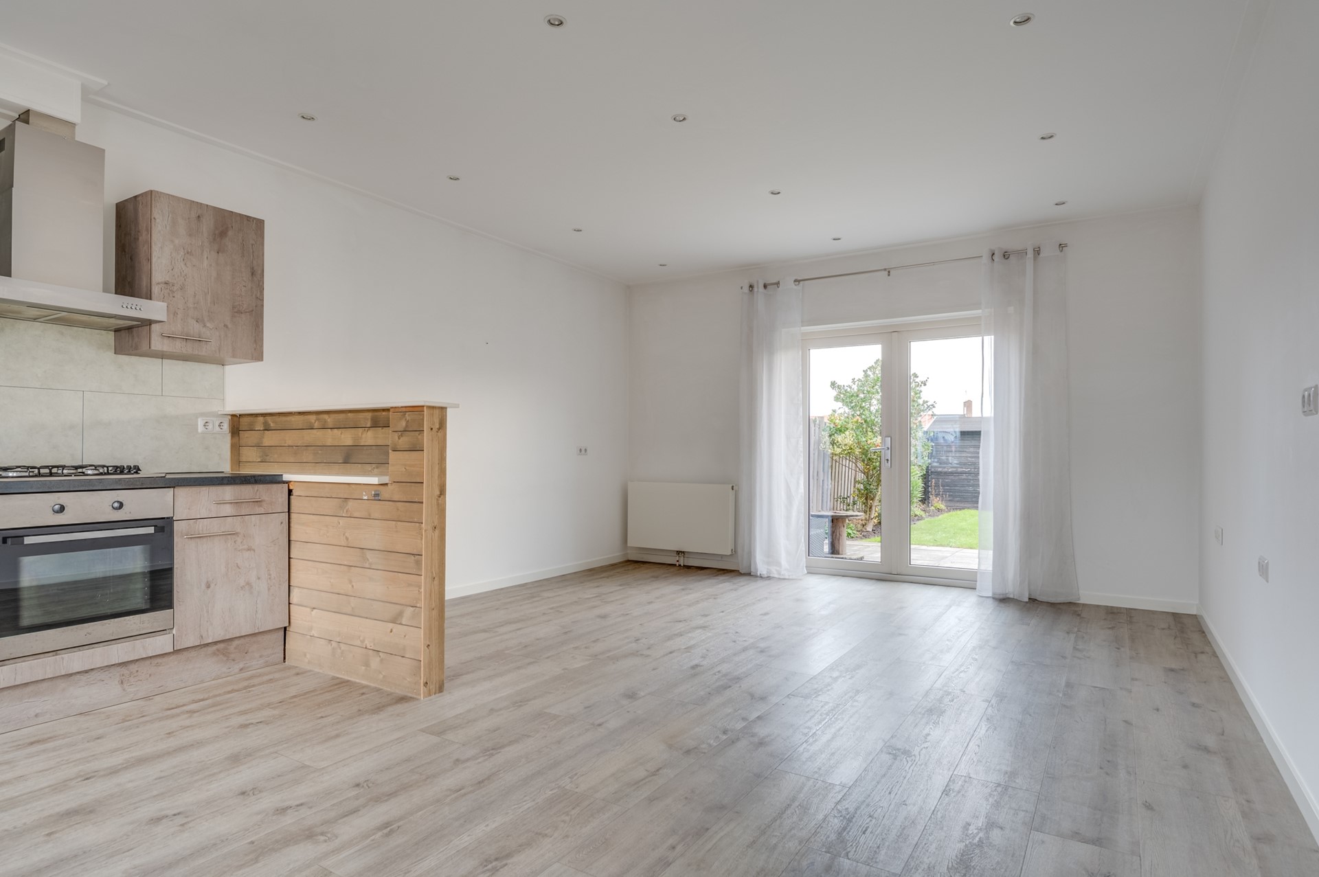 De rechthoekige doorzon woonkamer met open keuken is heerlijk licht. Aan de voorzijde is de nieuwe keuken met inbouwapparatuur. Aan de achterzijde de woonkamer met tuindeuren naar het terras.