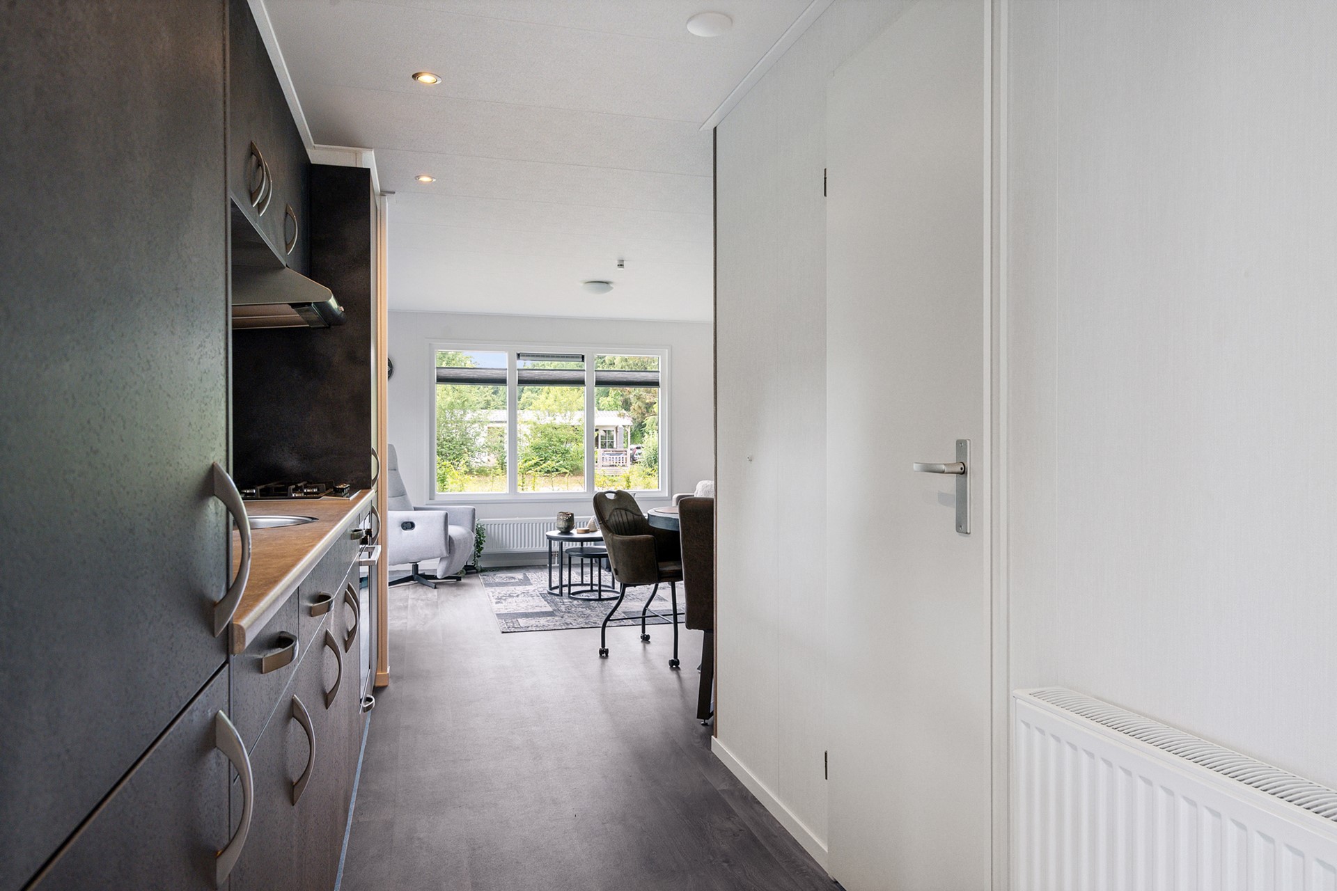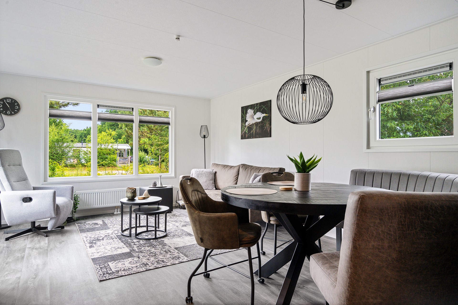 Vanuit de woonkamer stap je zo je terras op via de schuifpui wat ook zorgt voor extra lichtinval. Door de extra isolatie is de chalet winterhard wat voor een comfortabel verblijf zorgt en in de zomer prima koel te houden.