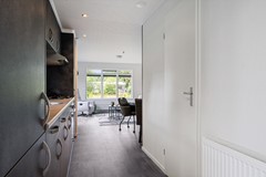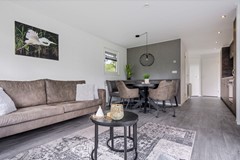 De woon-/eetkamer is van een dusdanige afmeting dat er ruimte is voor zowel een eettafel als een zithoek. Je kunt hier prima met vier tot zes personen aan tafel zitten.