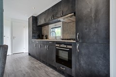 De moderne, over de lengte geplaatste keuken is voorzien van een inbouw kookplaat met afzuigkap, een koelkast, een vaatwasser en een losse magnetron.