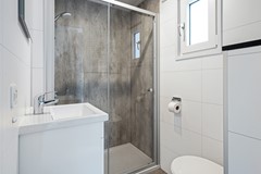 De badkamer bevindt zich aan je rechterhand en is compleet ingericht met een douche voorzien van een glazen scherm over de breedte, een wastafelmeubel en een toilet.