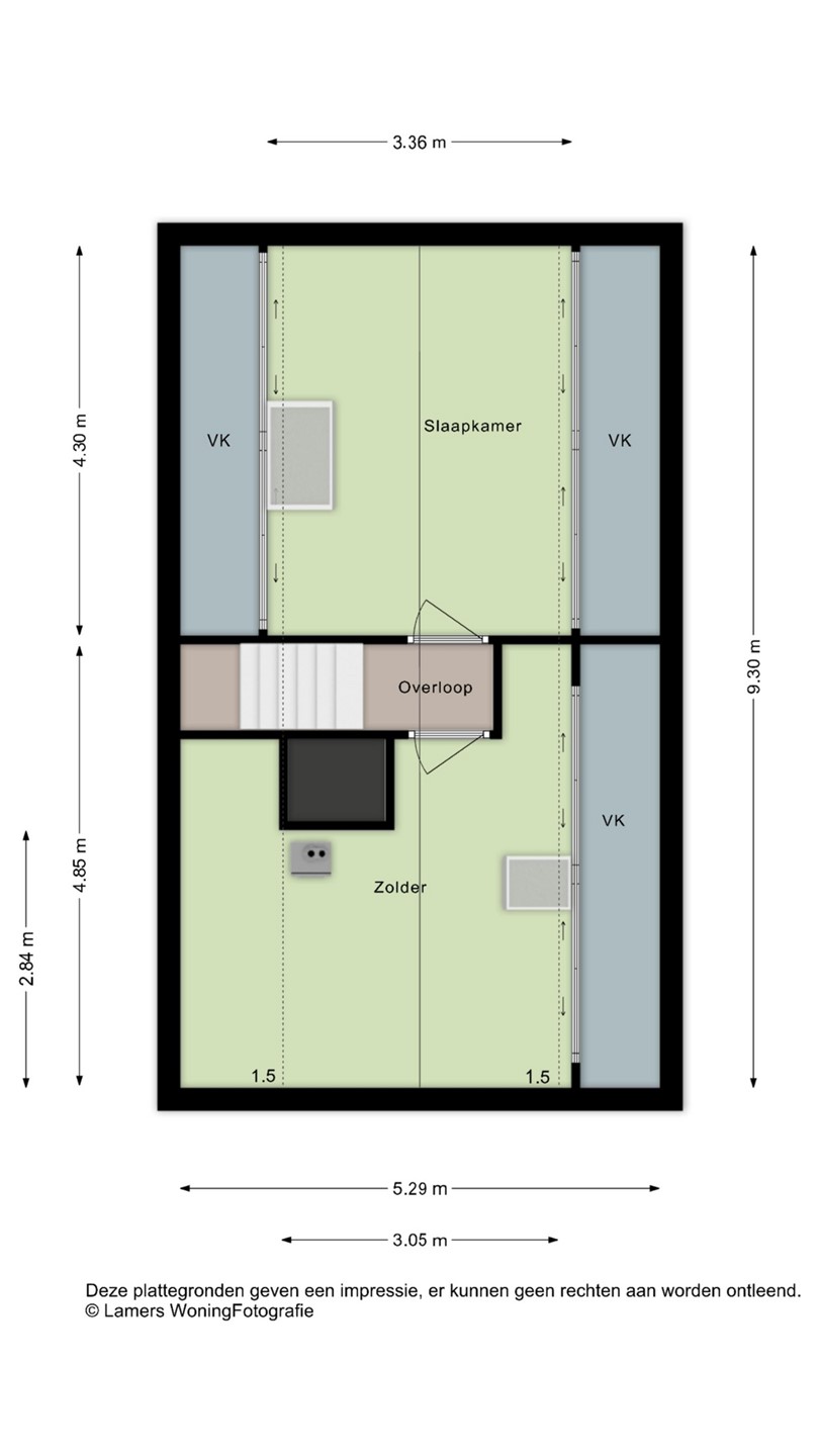 Tweede verdieping: voorzolder met CV-opstelling (CV-ketel, Nefit HR, jaar 2000), zolderkamer. De voorzolder en zolderkamer zijn beide voorzien van een Velux dakraam. Bergruimte achter knieschotten.