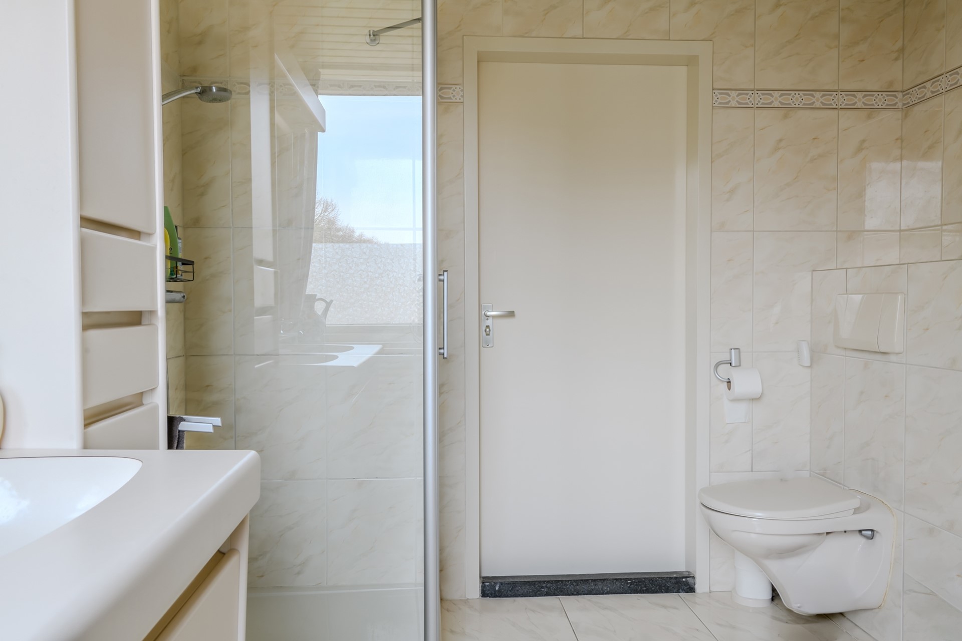 Eerste verdieping: overloop, drie slaapkamers (ouderslaapkamer met airco en balkon), badkamer (1993) met ligbad, douchecabine, toilet en dubbele wastafel.