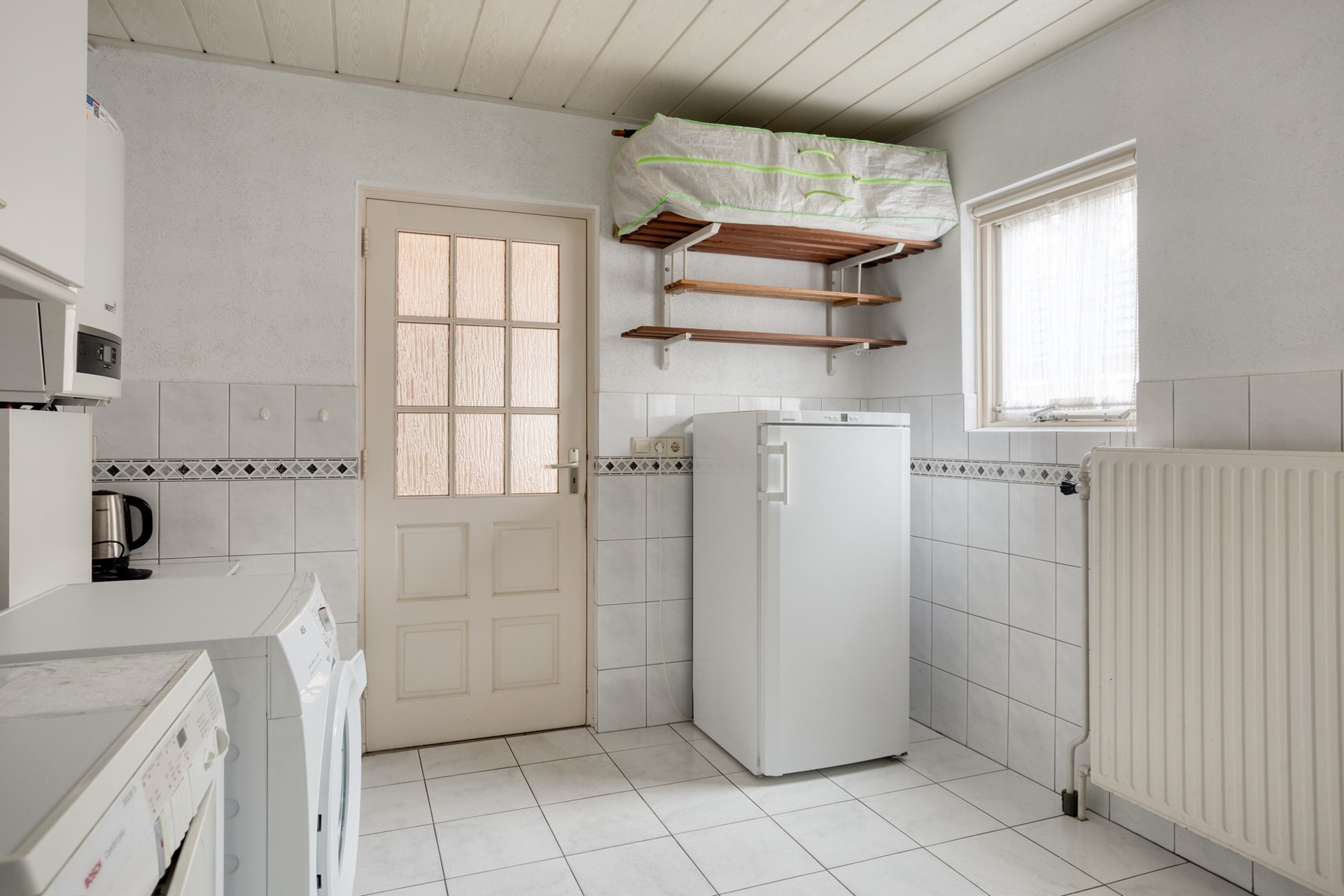 Begane grond: entree, meterkast, trapkast met veel schapruimte voor de provisie. Toilet met fonteintje en trapopgang naar de eerste verdieping. Royale L-vormige woonkamer met veel lichtinval en vrij uitzicht aan de voorzijde. Vanuit de woonkamer komt u in de keuken, wederom is daar veel daglicht door de grote raampartij en vanuit deze leefkeuken heeft u toegang tot de achtertuin en tot de bijkeuken. De keuken is uitgerust met diverse inbouwapparatuur, maar in de bijkeuken is ook royaal plaats voor aanvullende apparatuur zoals bijvoorbeeld een extra koelkast of diepvries. Ook staan hier de wasmachine en de droger en de CV-opstelling.