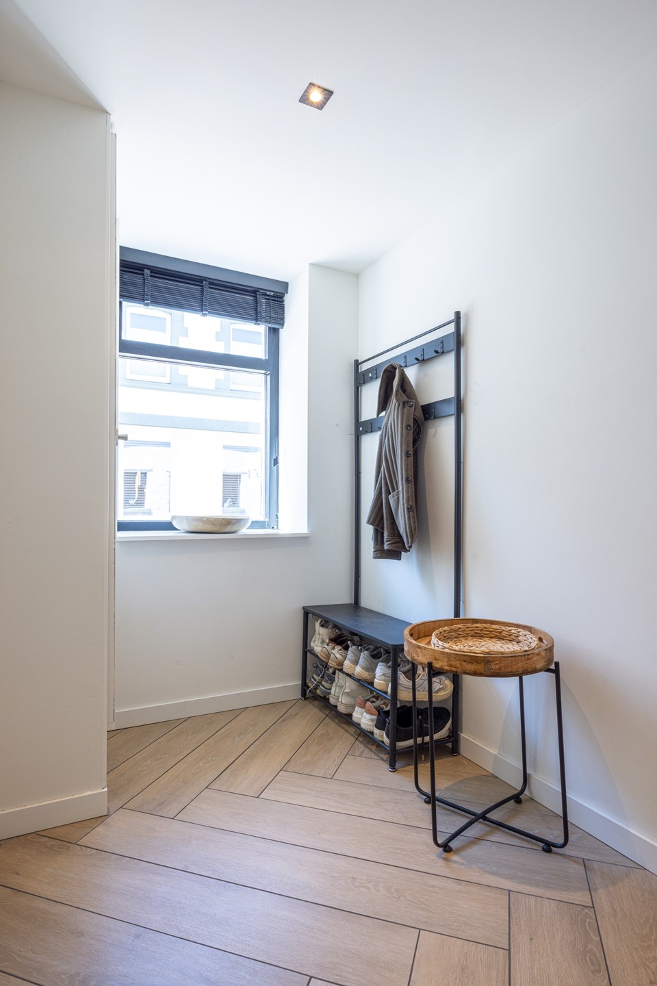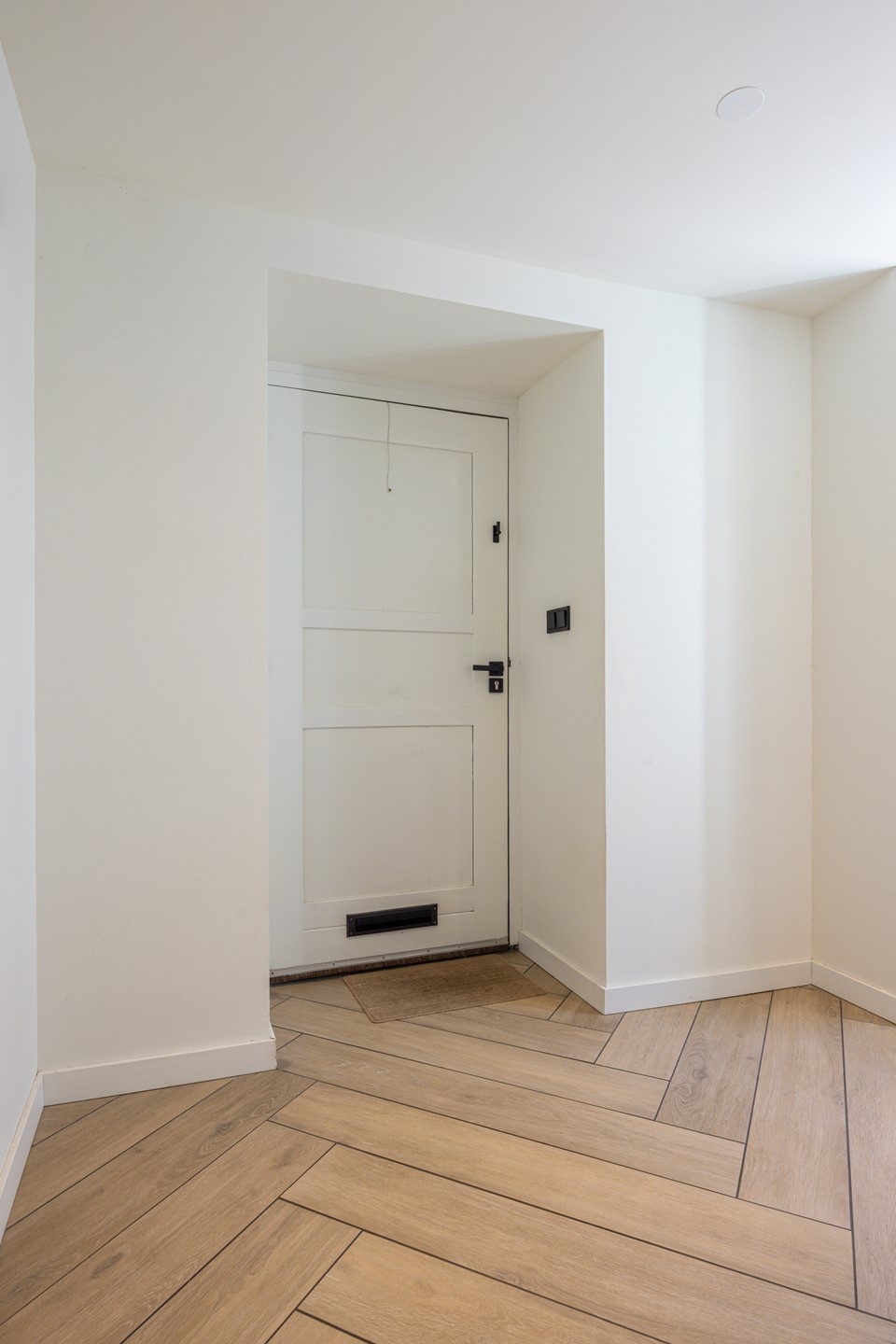 Via het overdekte pad bereik je de entree van de woning. De ontvangsthal is verzorgd afgewerkt met een tegelvloer in visgraatmotief met houtlook en voorzien van vloerverwarming. De hal vormt een nette en binnenkomst met toegang tot de meterkast, het moderne toilet: zwevend closet met fonteintje en een raam met HR++ beglazing voor natuurlijke ventilatie.