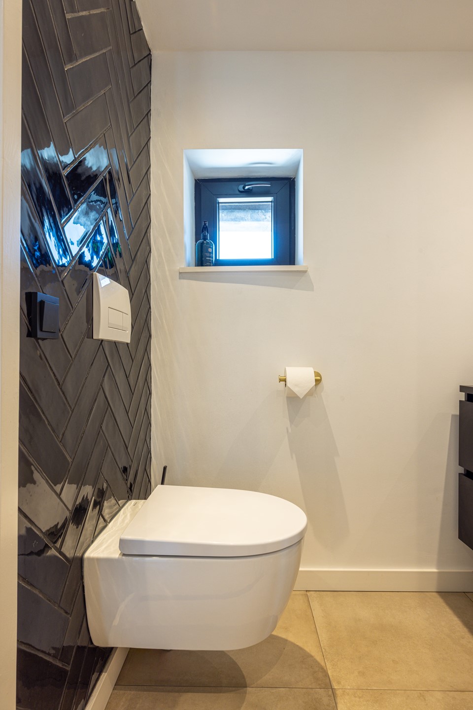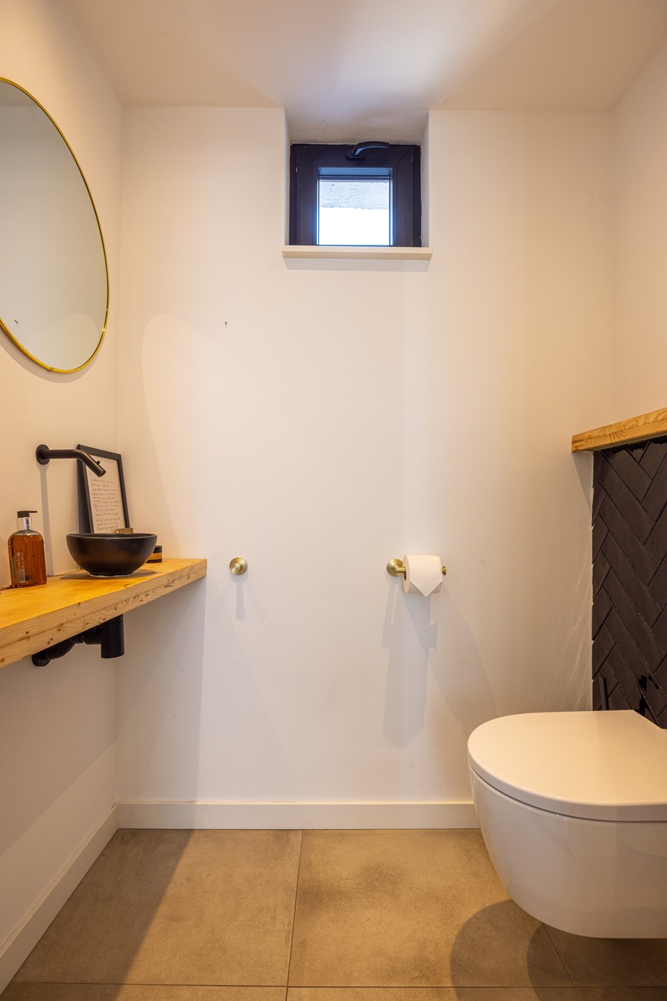 Het separate toilet op deze verdieping is verzorgd uitgevoerd en praktisch in gebruik. De ruimte is voorzien van een tegelvloer, een fonteintje en een raam met HR++ beglazing, wat zorgt voor natuurlijke ventilatie en daglicht.