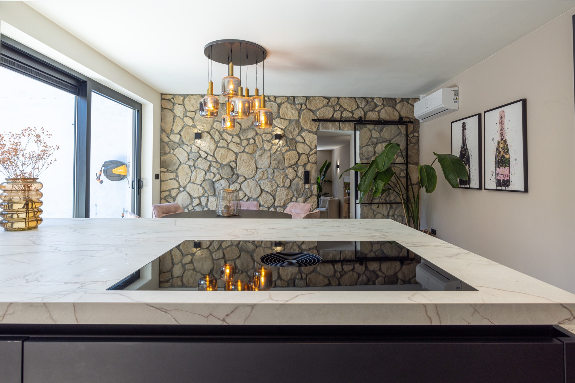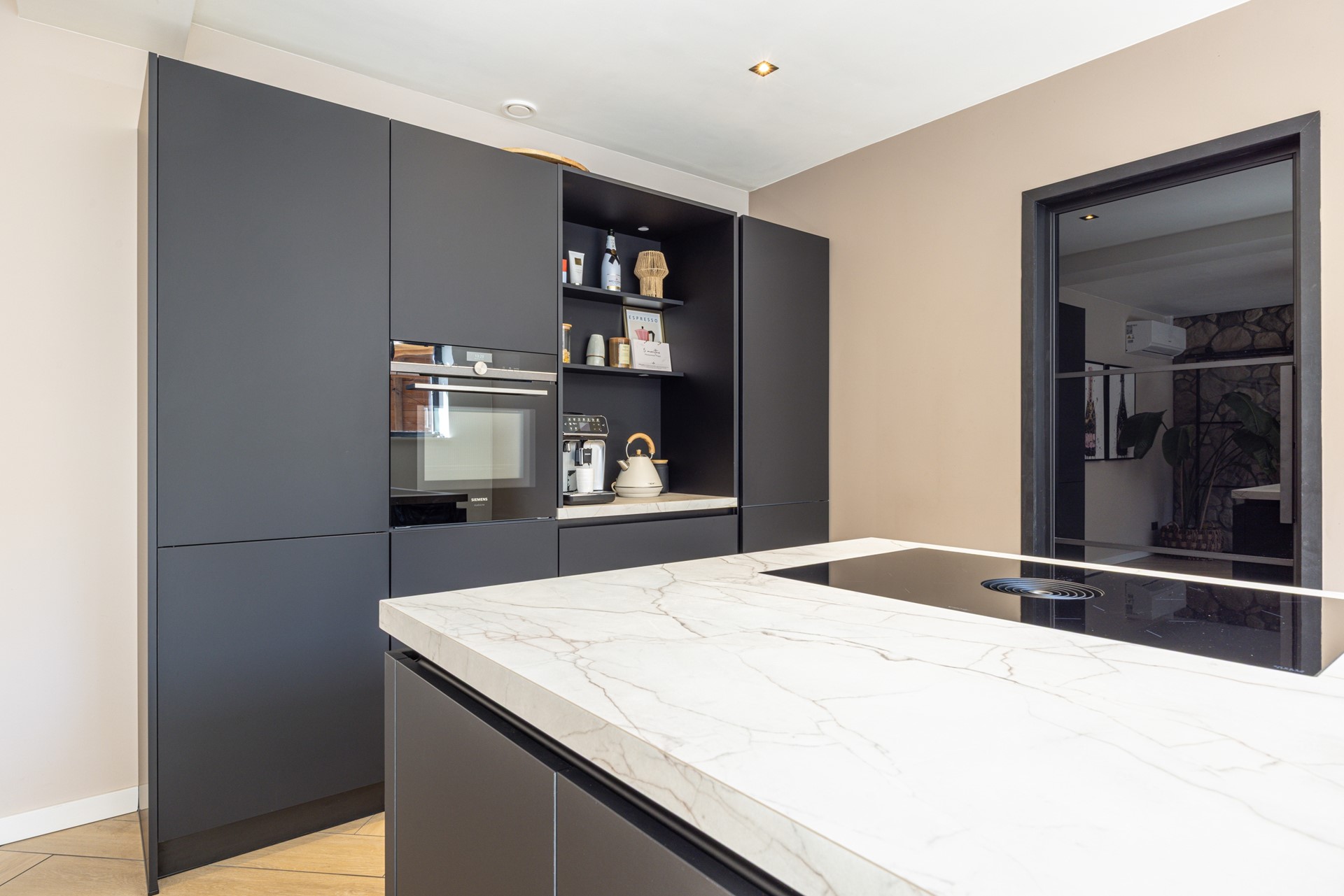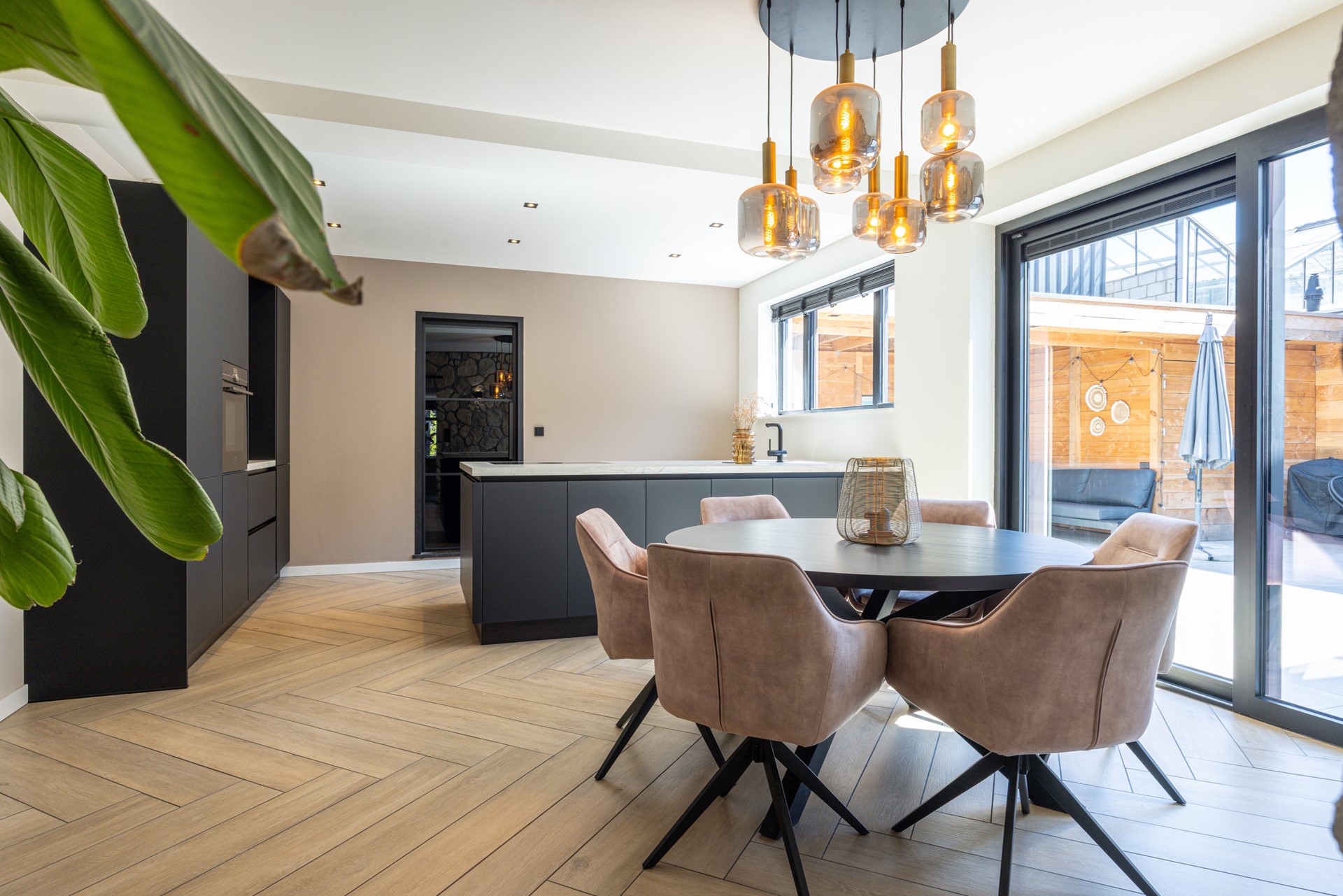 De keuken is afgesloten en uitgevoerd in een moderne, luxe stijl. Ook hier is de ruimte afgewerkt met een tegelvloer in visgraatmotief met houtlook en voorzien van vloerverwarming, waardoor er een mooi geheel ontstaat met de rest van de begane grond. De keuken beschikt over veel kast- en werkruimte en is praktisch ingedeeld, waardoor koken en werken prettig samengaan. De aanwezige inbouwapparatuur bestaat uit een 4-pits inductiekookplaat met geïntegreerde afzuiging, een heteluchtoven, koelkast en vaatwasser. Daarnaast is er een airco-installatie aanwezig, wat bijdraagt aan extra comfort, met name tijdens warme dagen. Via een stalen schuifdeur met enkelglas is er een mooie verbinding met de woonkamer, terwijl de grote schuifpui met kunststof kozijnen met HR++ beglazing zorgt voor direct contact met de tuin en een fijne lichtinval.
