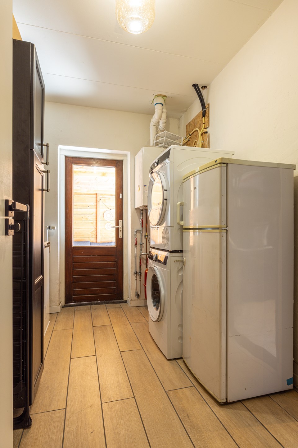 Aansluitend bevindt zich de bijkeuken, een ruimte waar de witgoedaansluitingen en de cv-installatie zijn gesitueerd. Daarnaast biedt deze ruimte extra bergruimte en vormt deze een functionele schakel tussen de keuken, de badkamer en de tuin. Vanuit hier is er directe toegang tot de overkapping buiten.