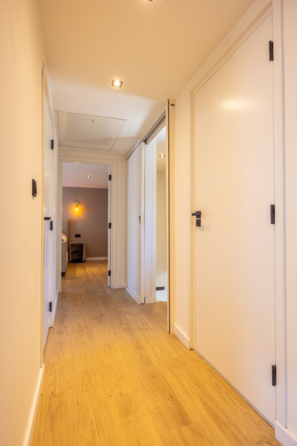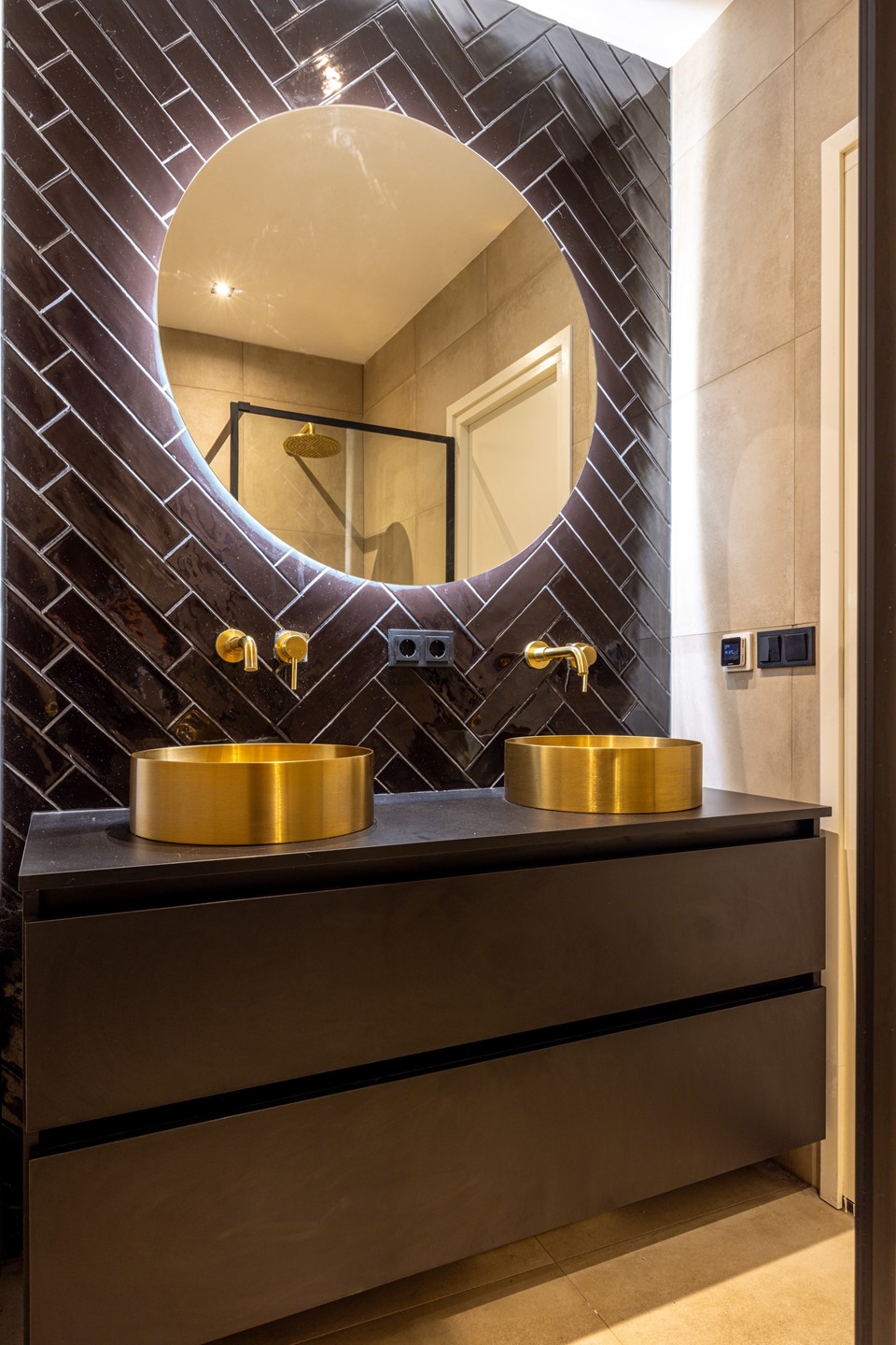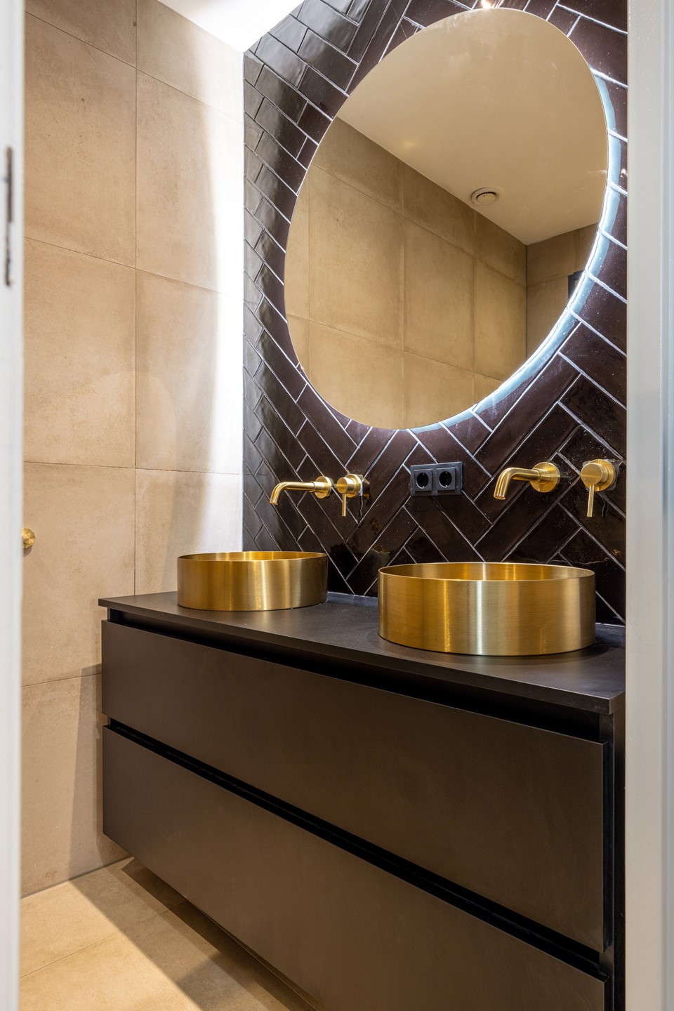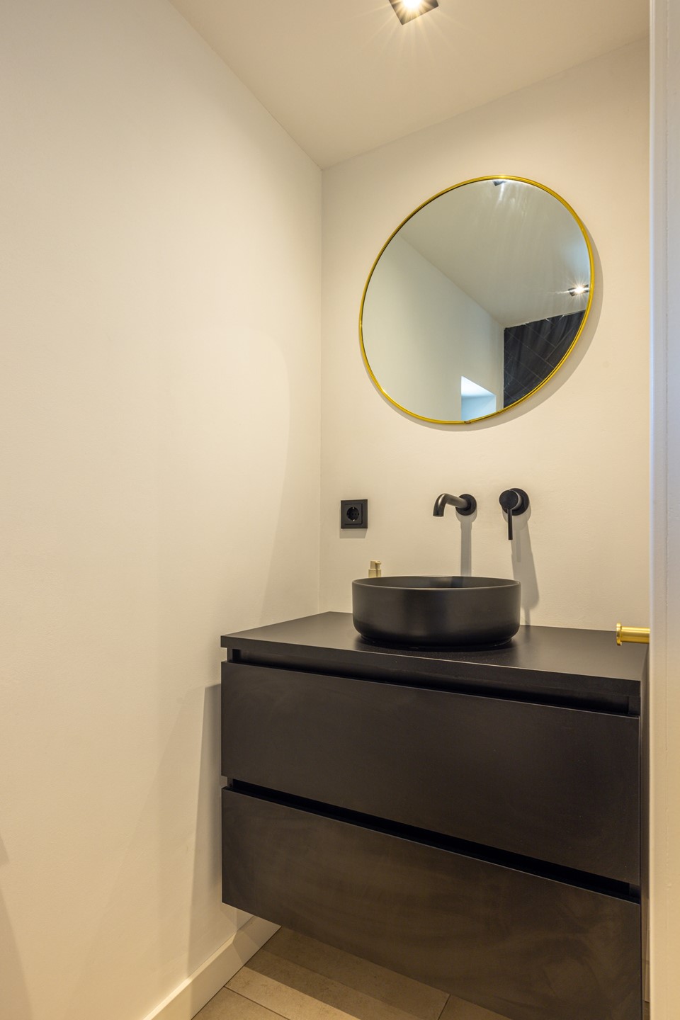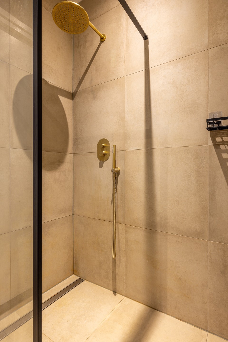 De badkamer vernieuwd in 2023 is modern en stijlvol afgewerkt en sluit goed aan bij de rest van de woning. De ruimte is voorzien van een tegelvloer en elektrische vloerverwarming en beschikt over een inloopdouche met glazen wand en een dubbele wastafel met een verlichte spiegel. De afwerking en materiaalkeuze geven de badkamer een luxe uitstraling, terwijl de indeling zorgt voor een praktisch dagelijks gebruik.