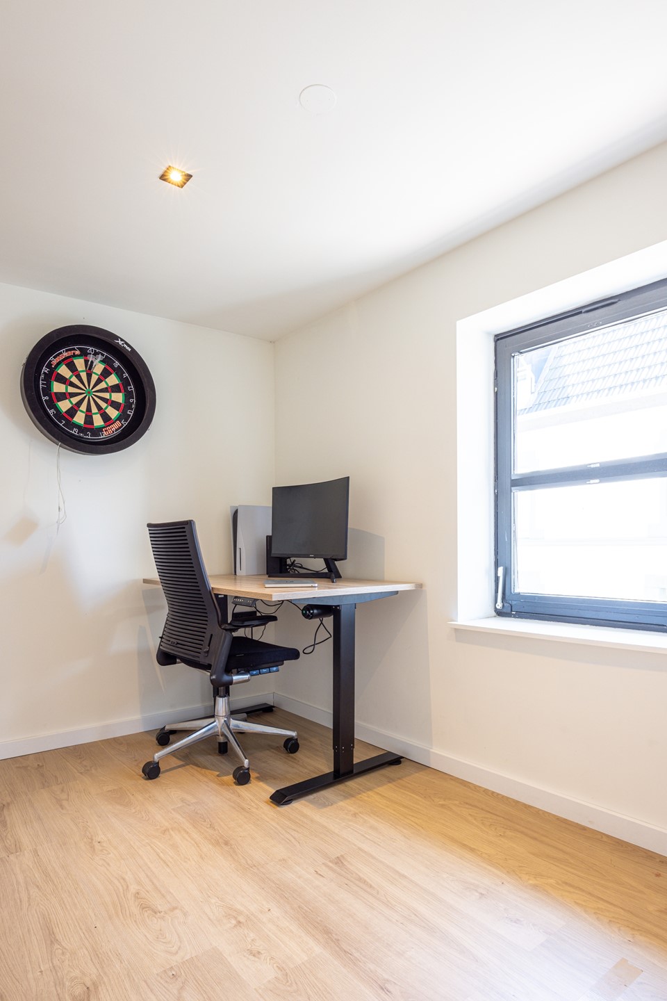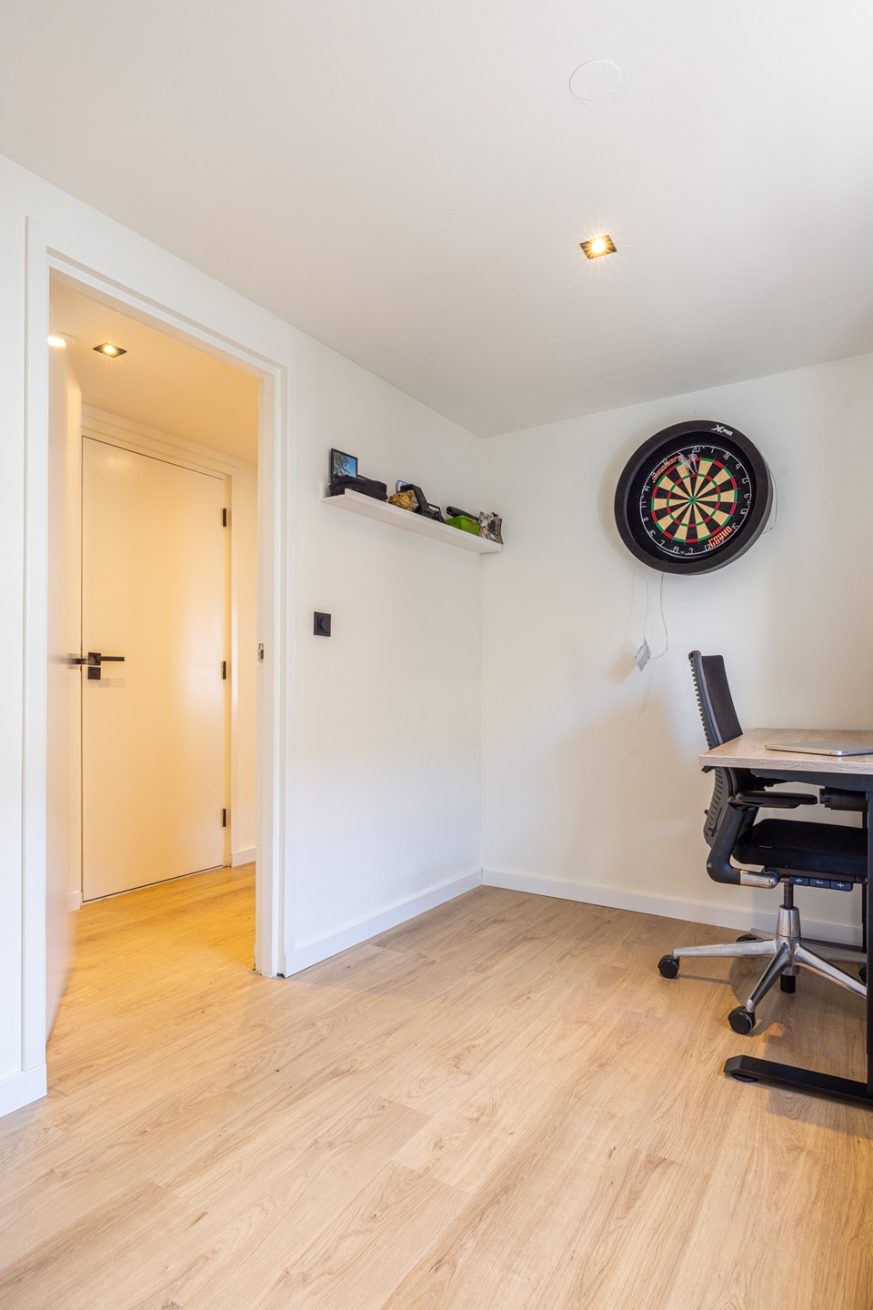 De overloop is afgewerkt met een laminaatvloer en vormt een centrale ruimte op de verdieping, met toegang tot drie slaapkamers, een separaat toilet en de tweede verdieping. Dankzij de aanwezige daglichttoetreding voelt deze ruimte prettig en open aan.