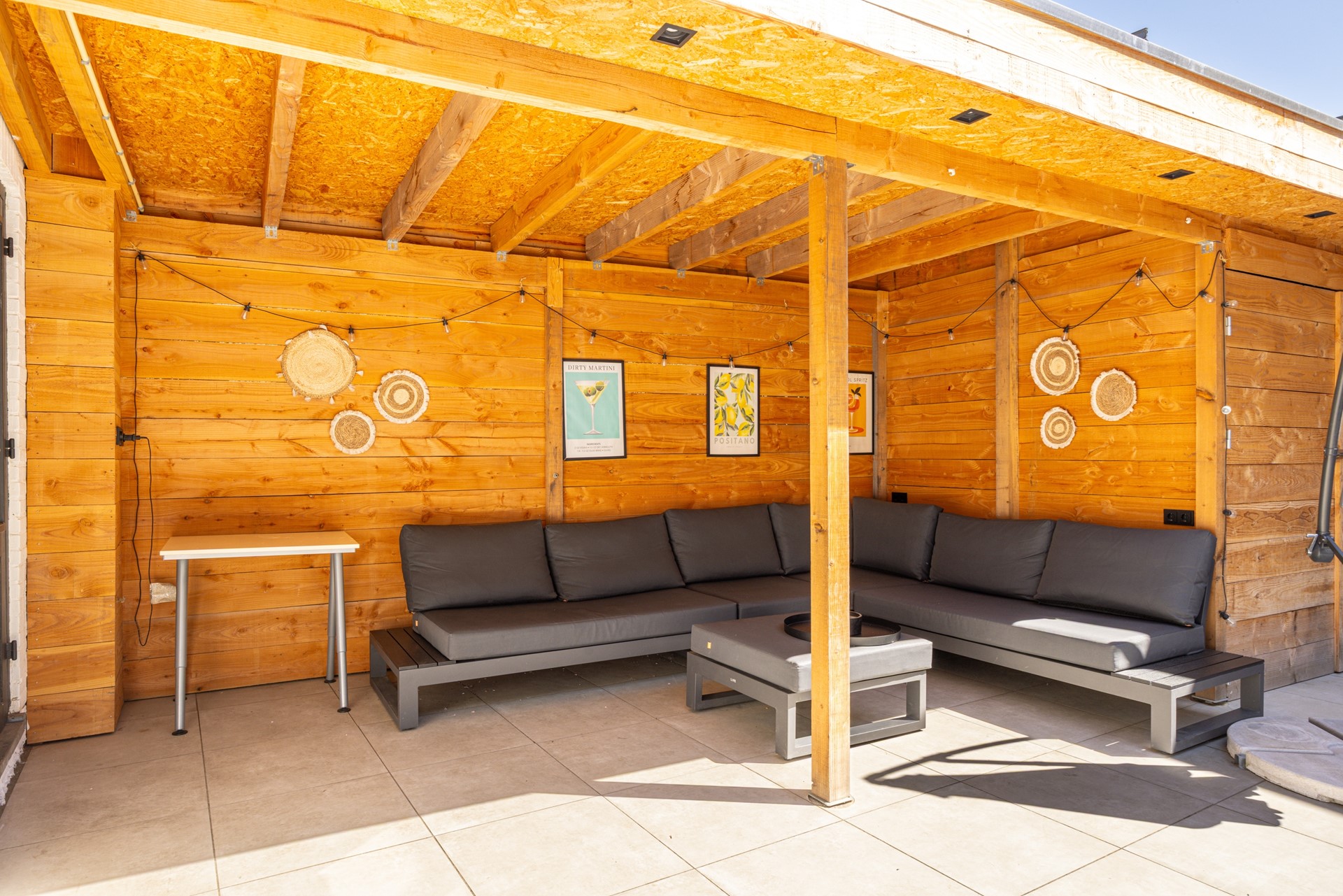 De achtertuin is verzorgd aangelegd en volledig betegeld, wat zorgt voor een onderhoudsvriendelijke en praktische buitenruimte. Dankzij de overzichtelijke indeling is de tuin eenvoudig in gebruik en geschikt voor verschillende doeleinden. Direct achter de woning bevindt zich een ruim overdekt terras, waardoor je hier een groot deel van het jaar comfortabel buiten kunt zitten, ongeacht het weer. Deze overkapping vormt een prettige verlenging van de leefruimte binnen en biedt voldoende plaats voor een zit- of eethoek. Verder beschikt de tuin over een berging, voorzien van elektra en verlichting. Deze ruimte is ideaal voor het opbergen van tuinspullen of gereedschap. Een groot pluspunt is de achterom via het overdekte pad langs de woning, waardoor je de tuin eenvoudig en droog vanaf de straat kunt bereiken. Dit maakt de tuin niet alleen praktisch in dagelijks gebruik, maar ook goed toegankelijk.