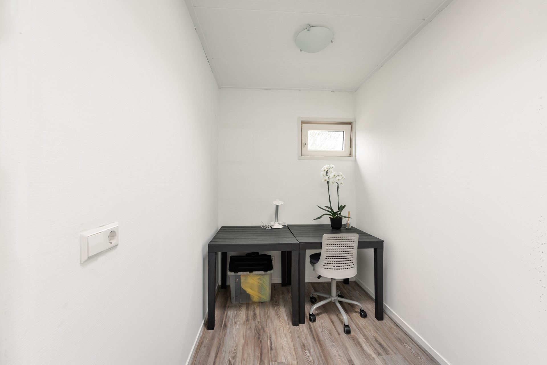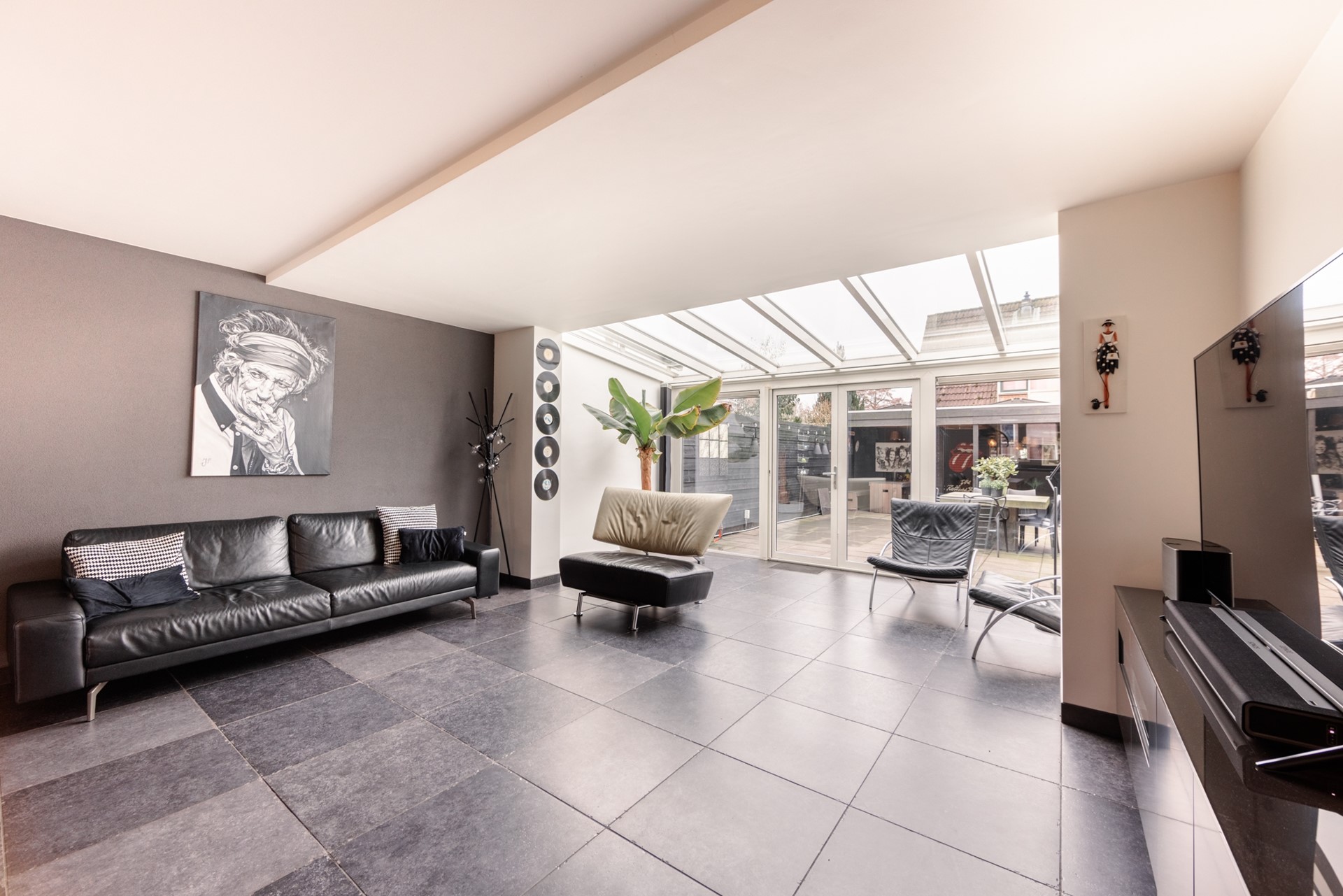 De hal met toilet biedt toegang tot een werkkamer en de woonkamer. Wat gelijk opvalt, is dat de interne berging bij de woonkamer is getrokken en de uitbouw met serre aan de achterzijde. Daardoor is er een enorme klap ruimte bijgekomen.