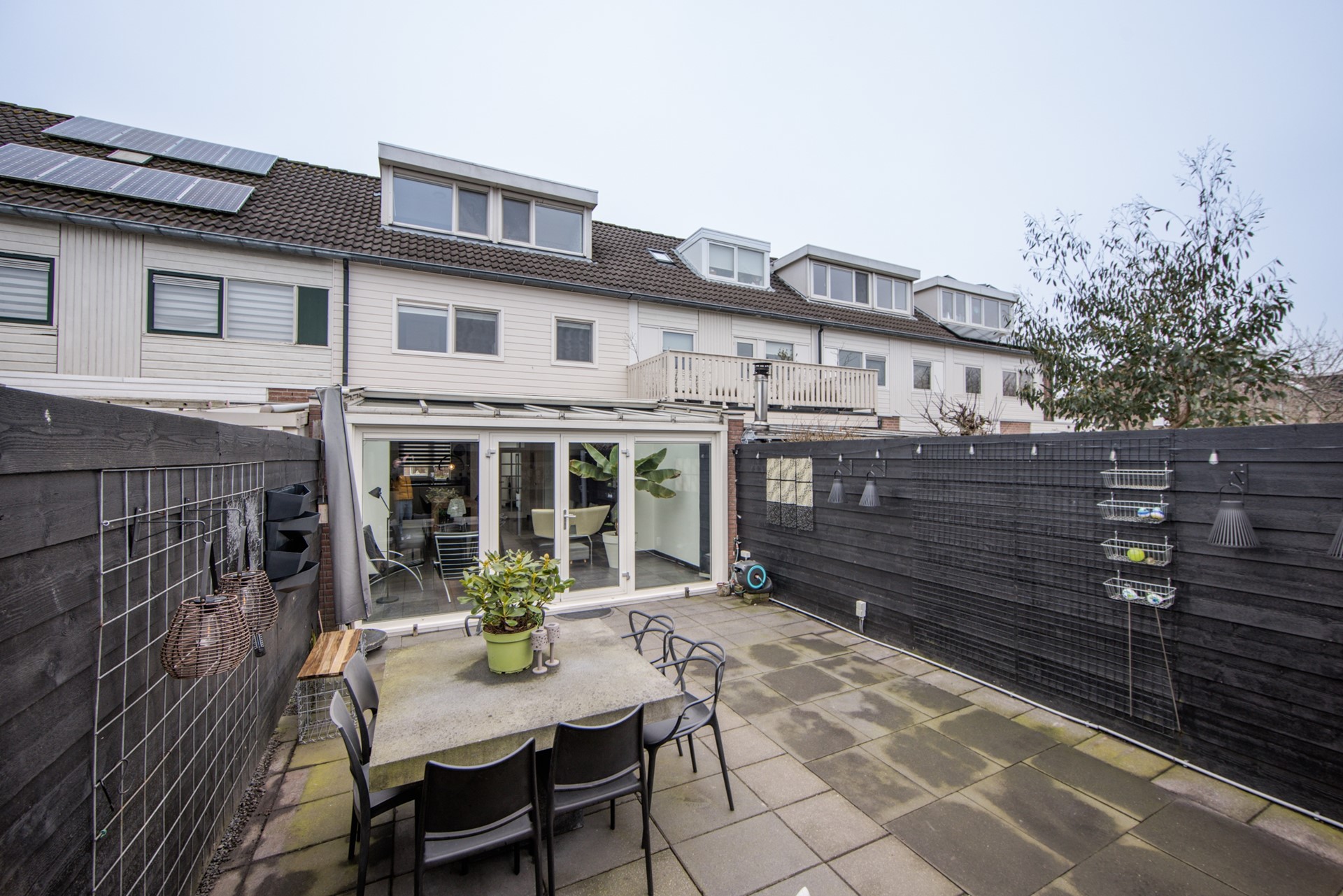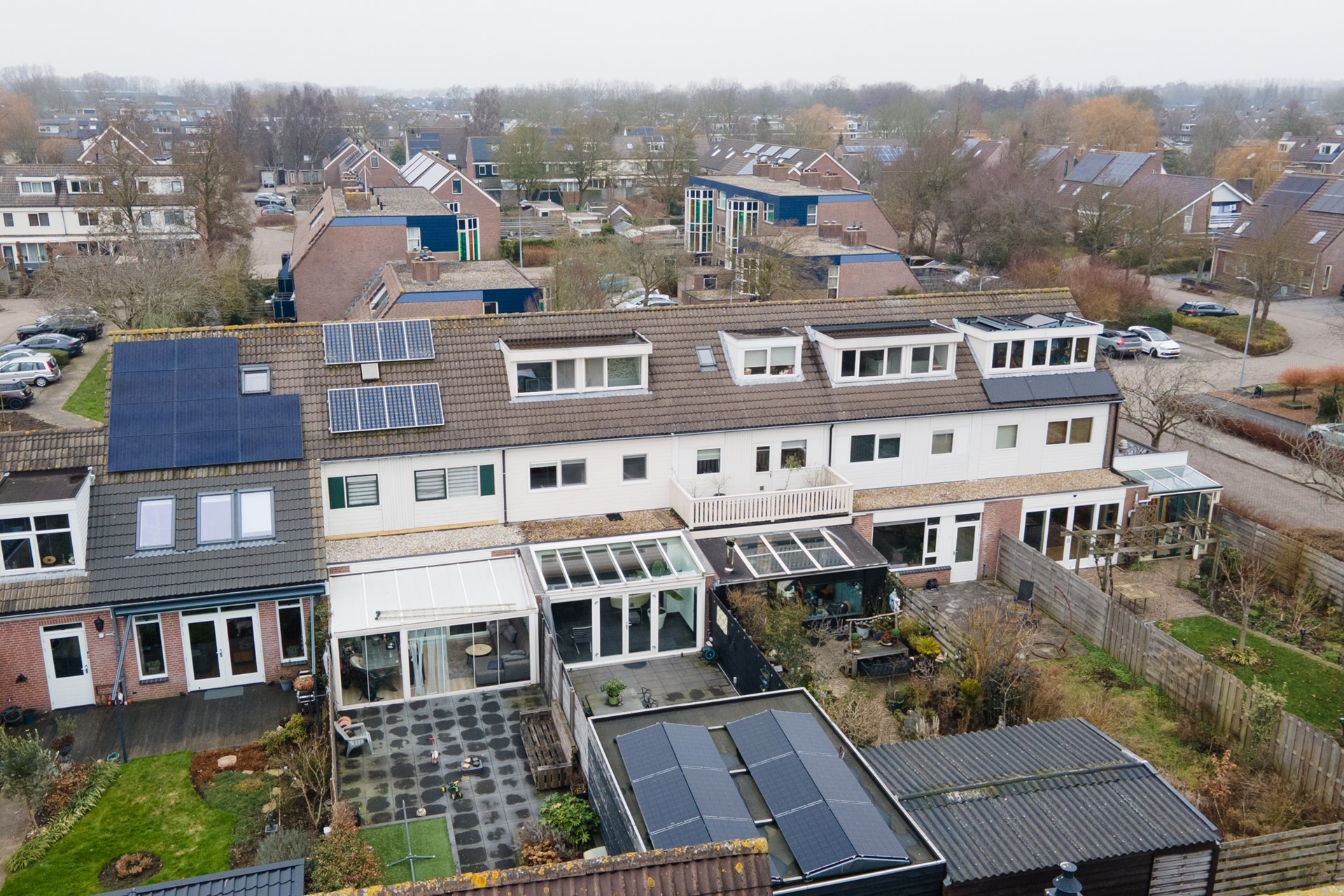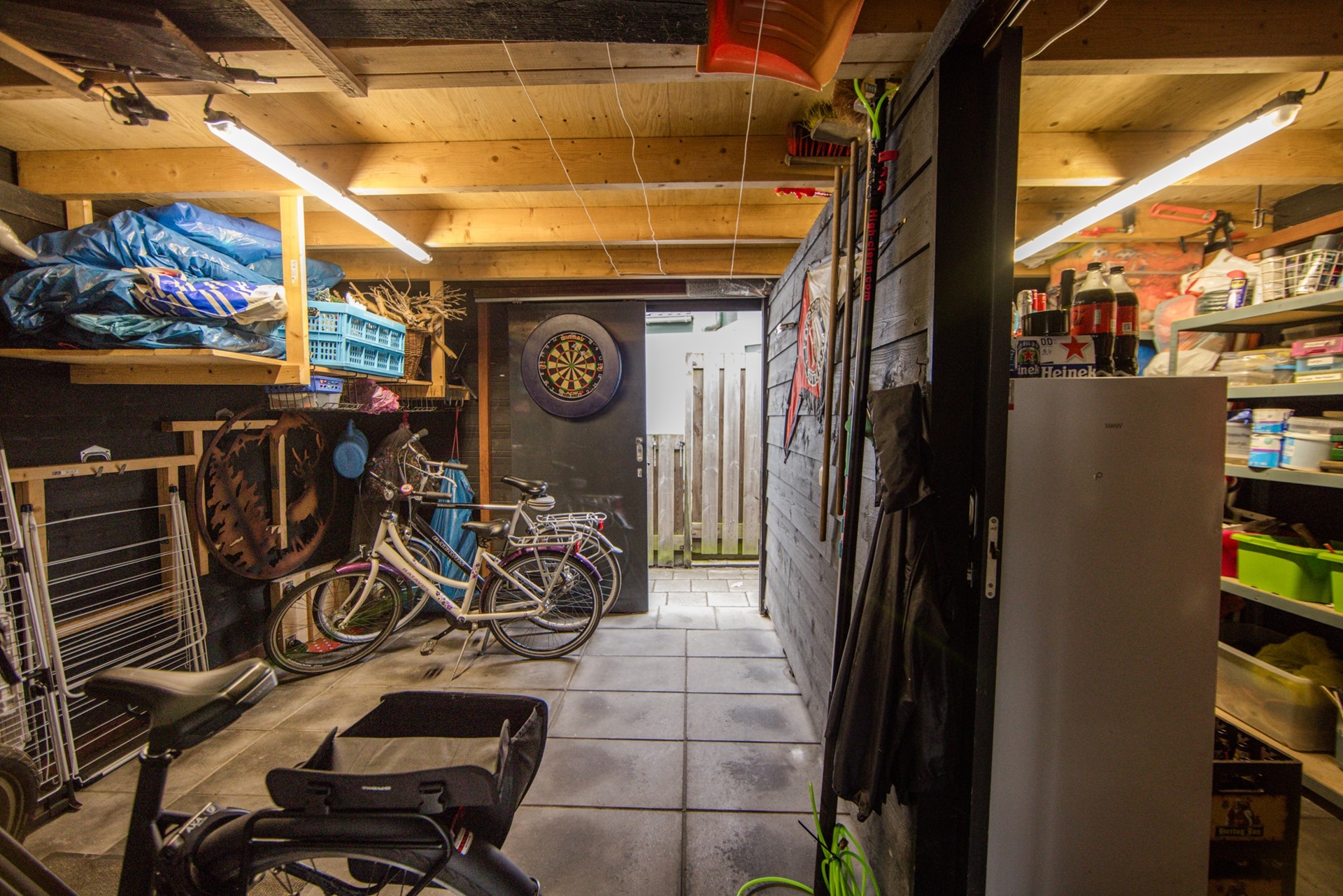 De achtertuin ligt lekker zonnig op het zuiden en is 10 meter diep. Met een achterom en een vrijstaande houten schuur met overkapping en 12 zonnepanelen.