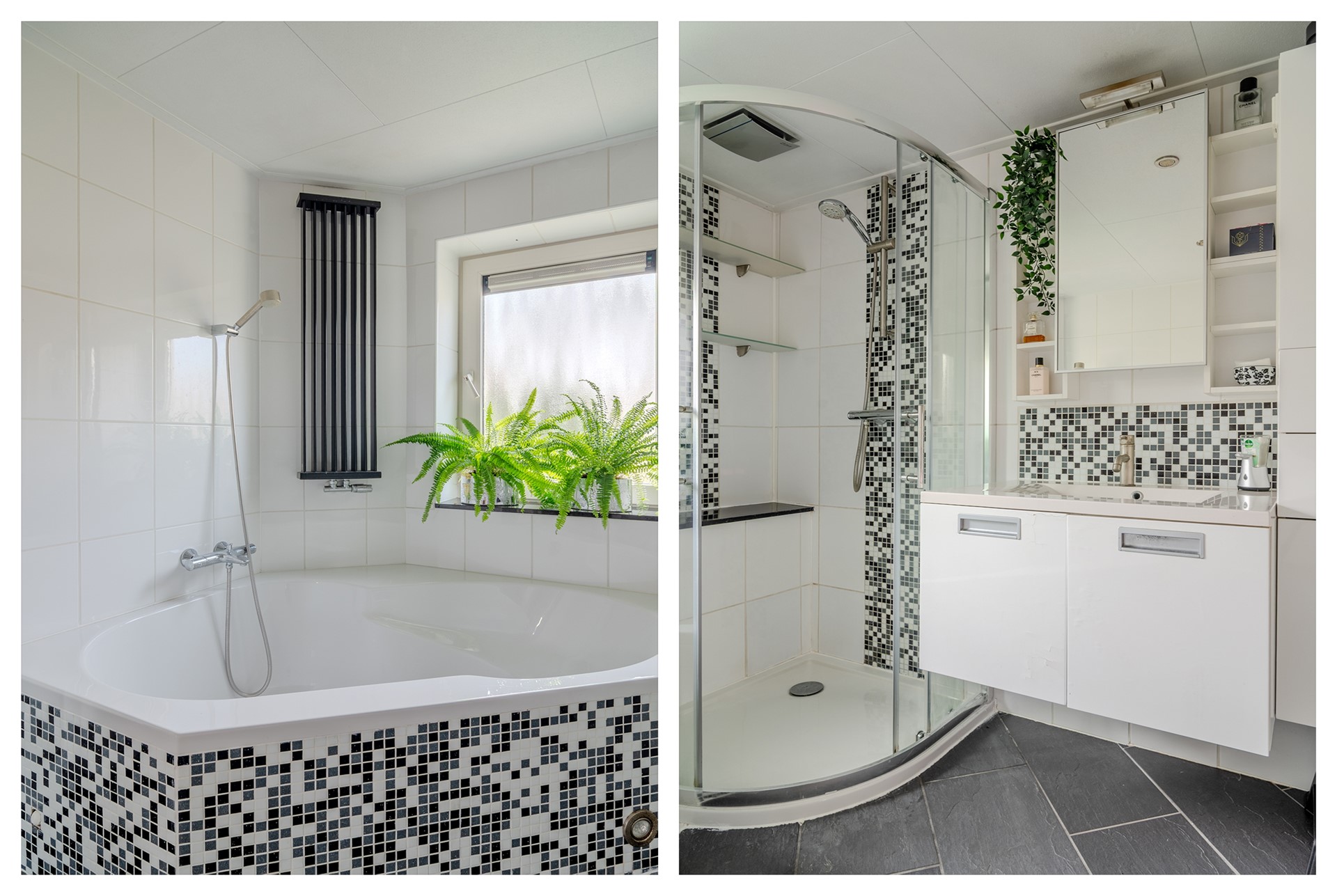 De badkamer, eveneens aan de achterzijde, is ingericht met een wastafelmeubel, toilet, ligbad en een aparte douche.