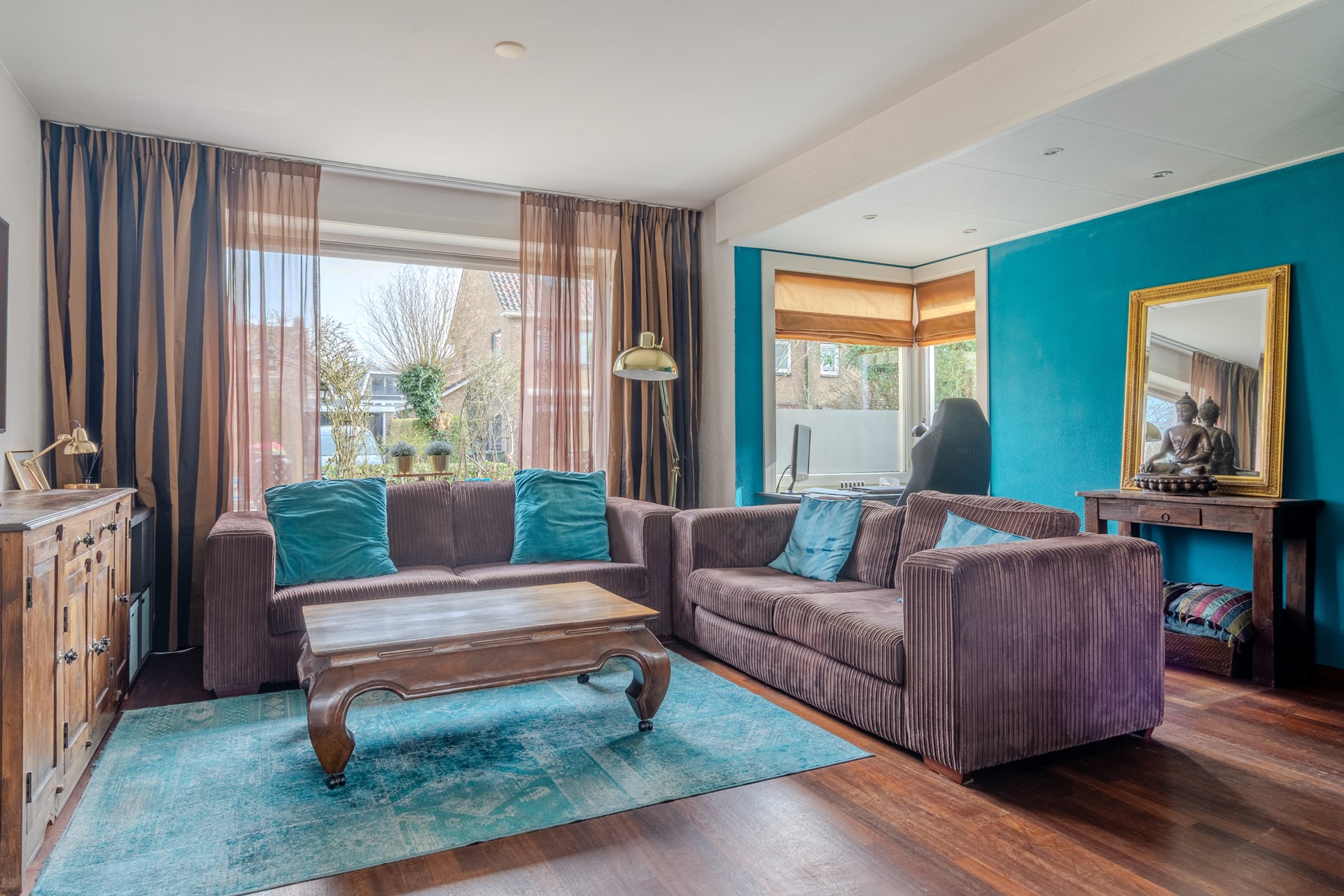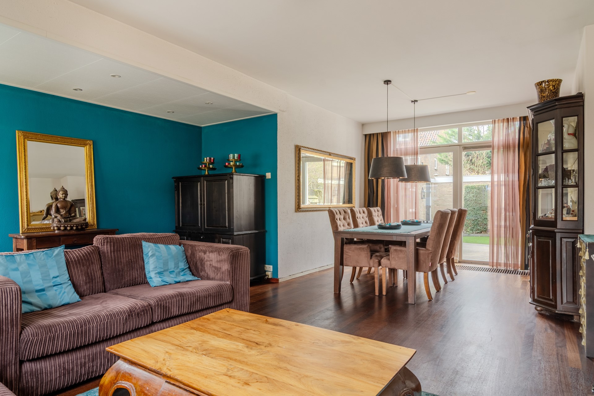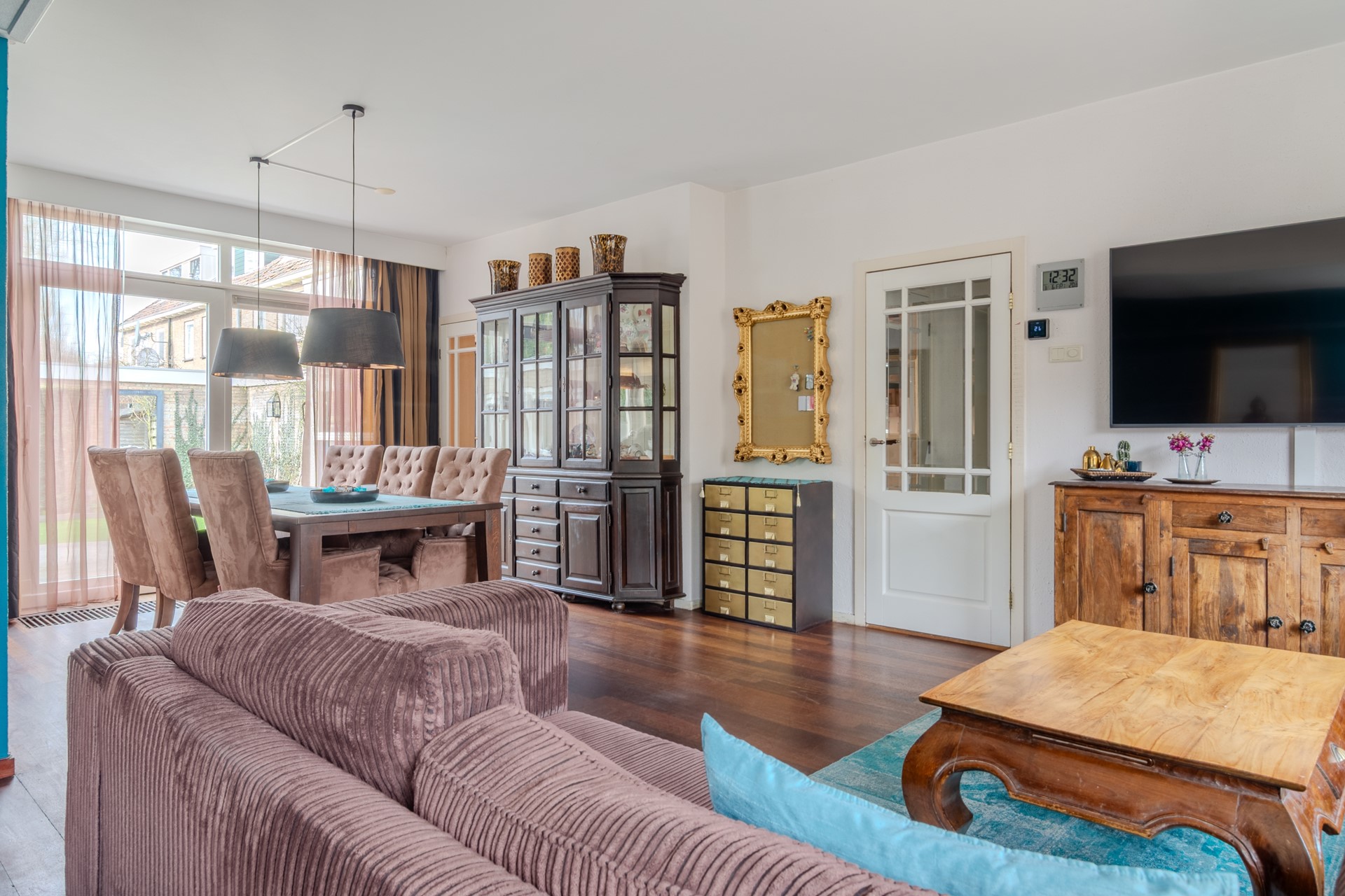 De lichte doorzonwoonkamer van bijna 8 meter lang biedt volop leefruimte en is aan de zijkant vergroot met een uitbouw, waardoor een zeer royale woonkamer is ontstaan. De schuifpui geeft direct toegang tot de achtertuin.