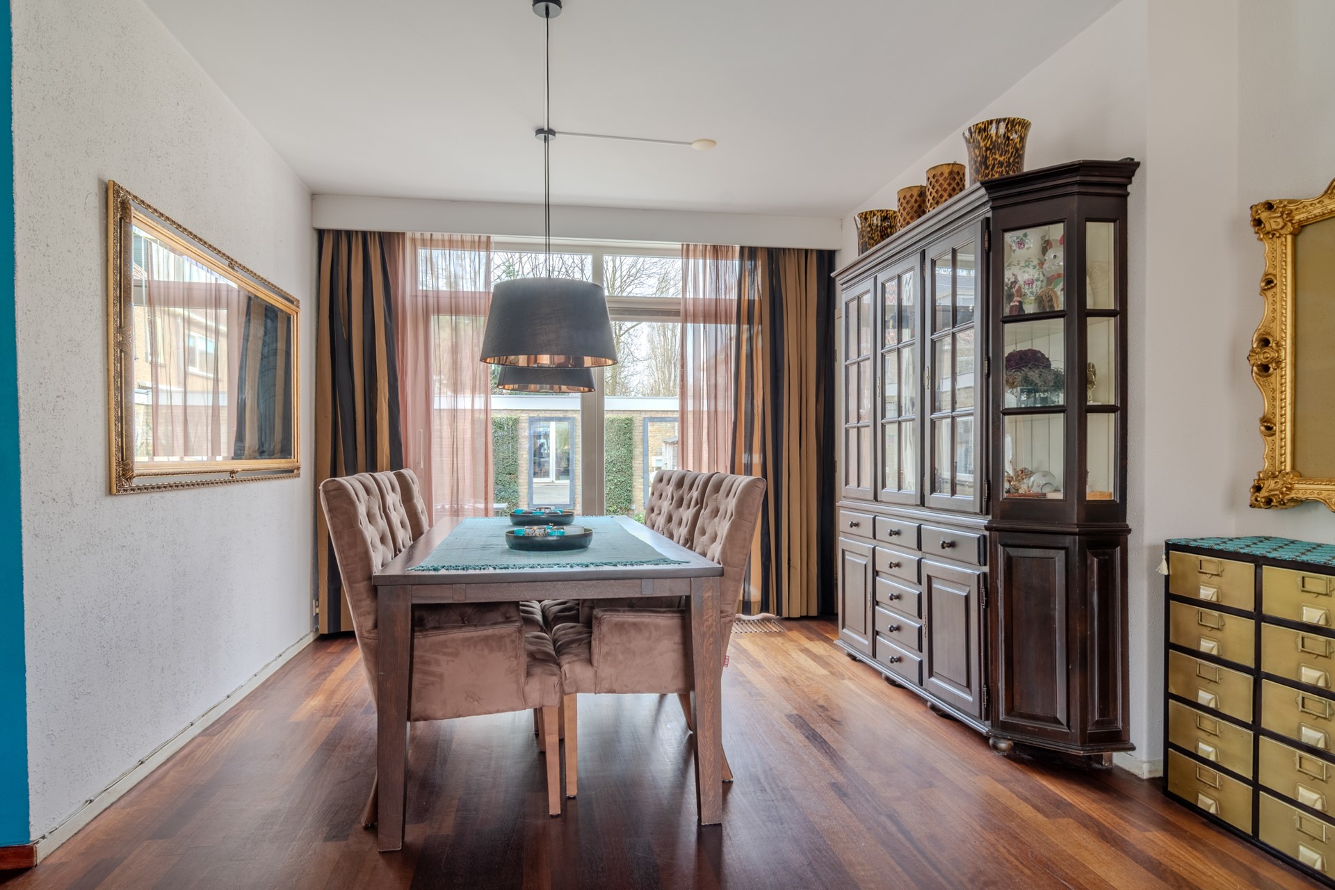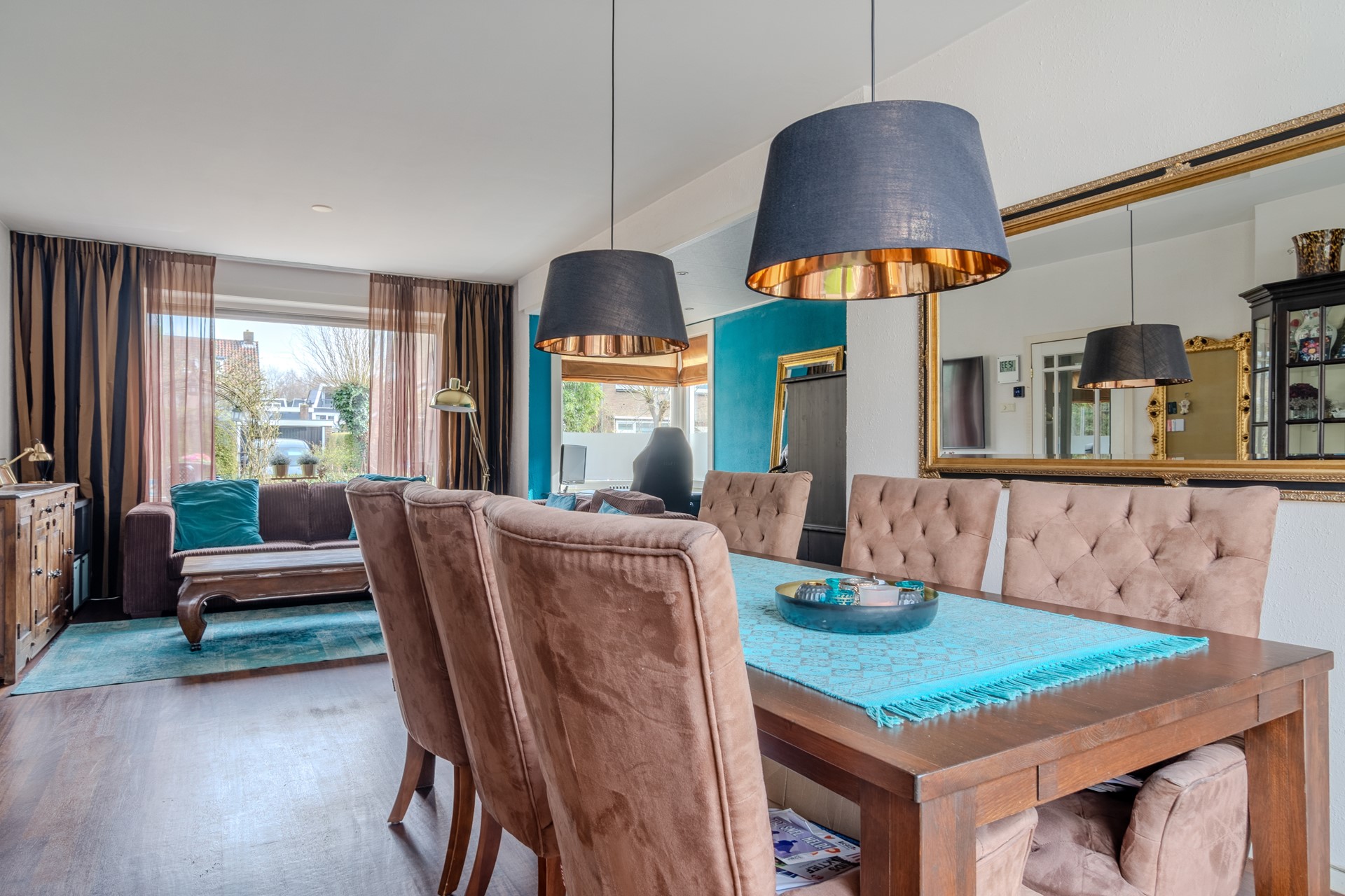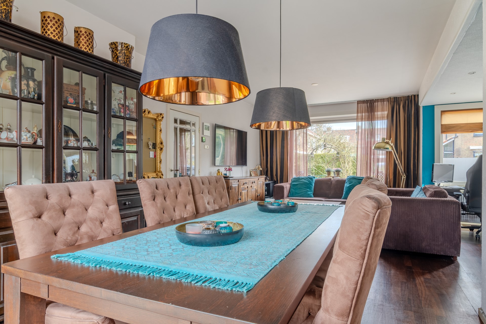 De lichte doorzonwoonkamer van bijna 8 meter lang biedt volop leefruimte en is aan de zijkant vergroot met een uitbouw, waardoor een zeer royale woonkamer is ontstaan. De schuifpui geeft direct toegang tot de achtertuin.