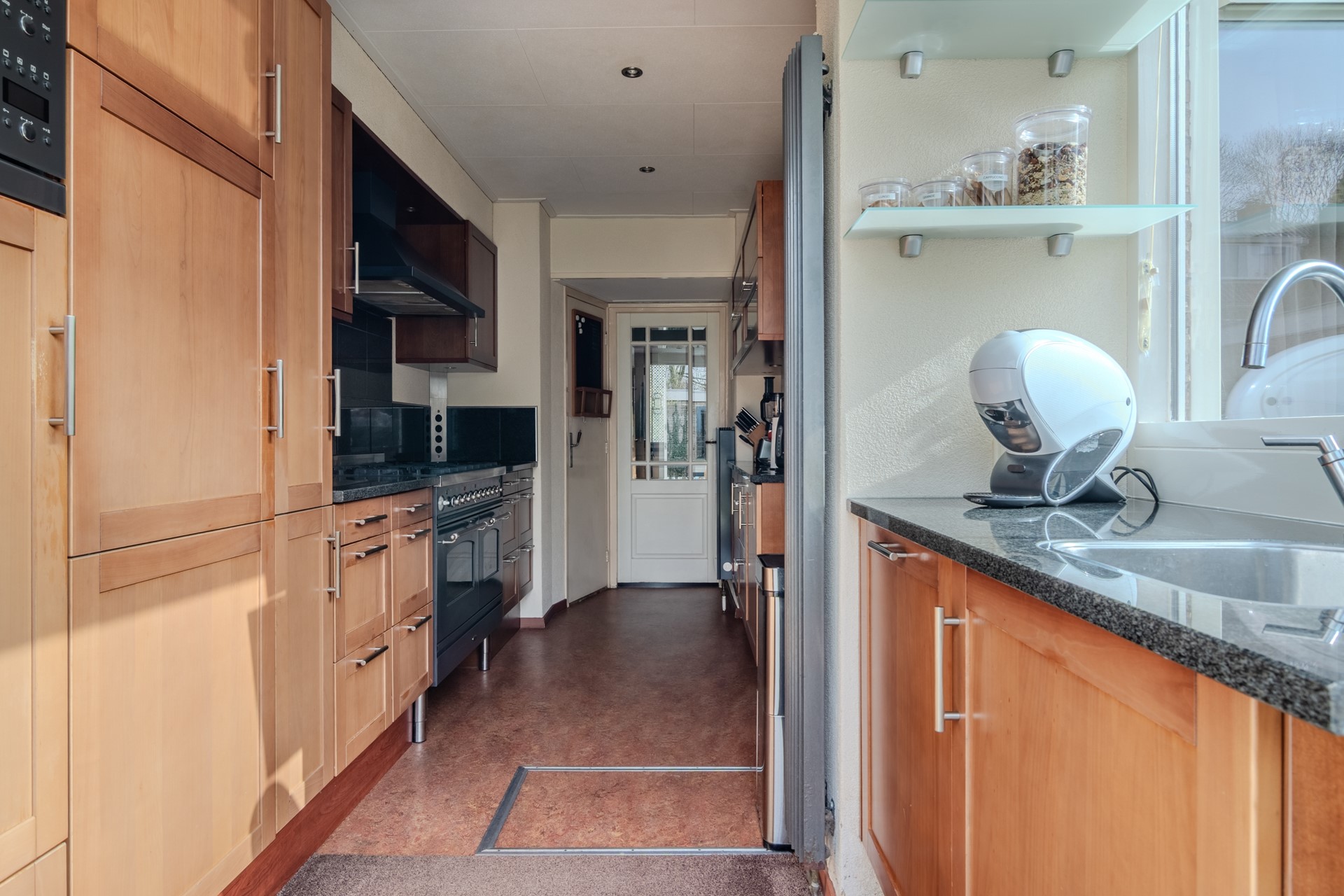 De dichte keuken is zowel vanuit de hal als vanuit de woonkamer bereikbaar en beschikt over een dubbele wandopstelling met granieten aanrechtbladen en diverse inbouwapparatuur. In de keukenuitbouw bevindt zich tevens een tuindeur naar de achtertuin.