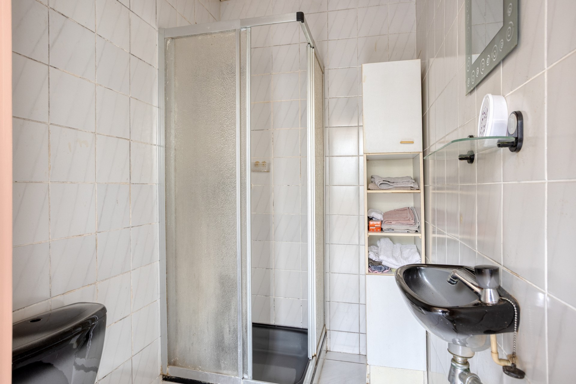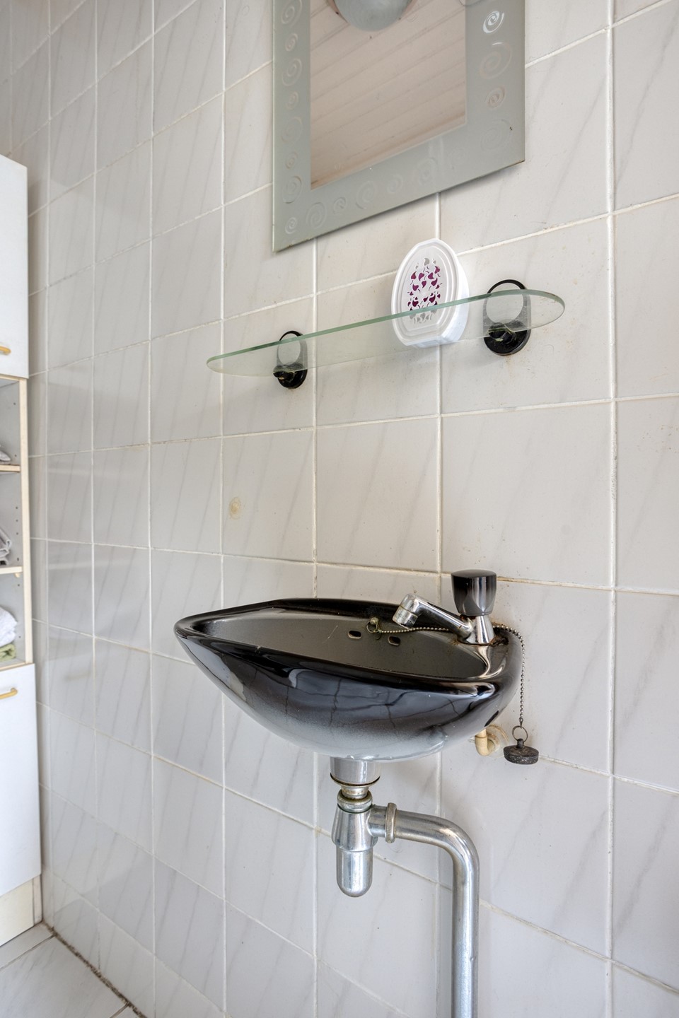De open keuken is voorzien van een vaatwasser, een 4-pits gasfornuis en een koelkast. Tevens bevindt zich hier de kast waarin de cv-installatie is geplaatst, evenals voldoende opbergruimte. De badkamer ligt aan de achterzijde van de woning en is voorzien van een douchecabine, wastafelmeubel, toilet.
