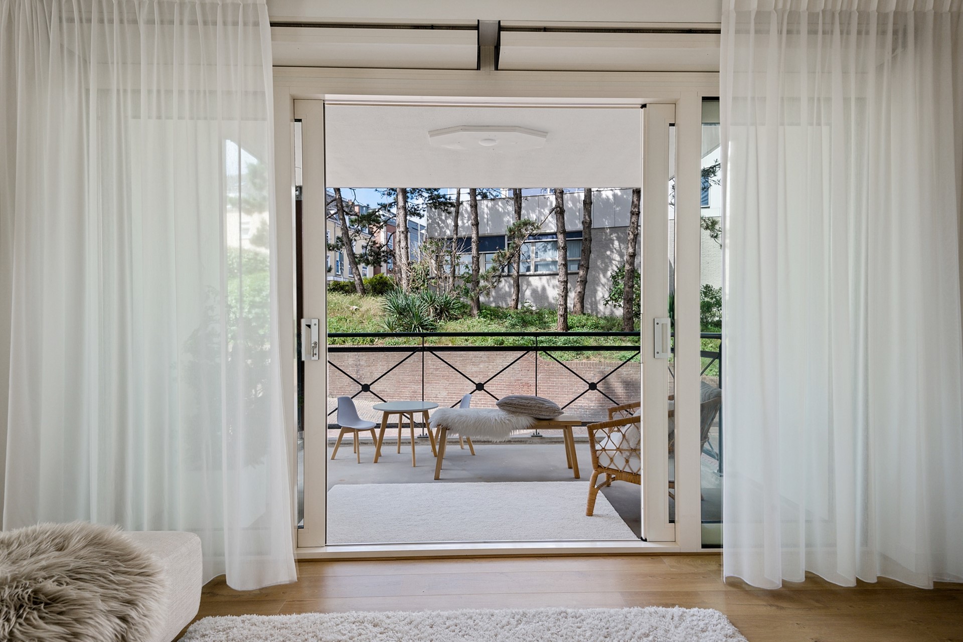 De lichte woonkamer zorgt voor een aangename leefruimte waar je kunt ontspannen en genieten van natuurlijk licht, door de openslaande deuren loop je zo het ruime balkon op.
