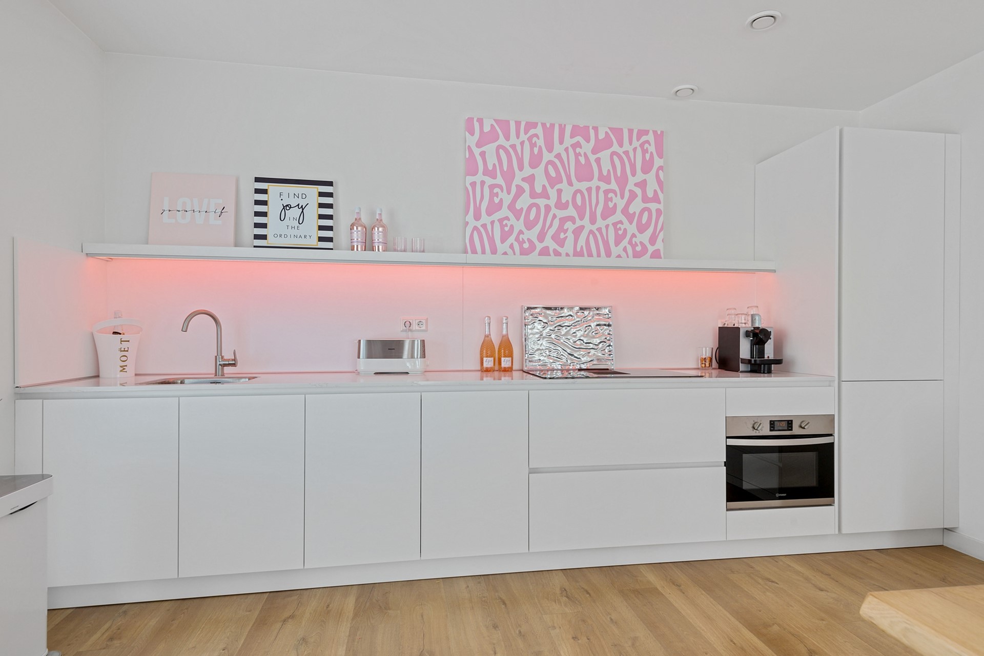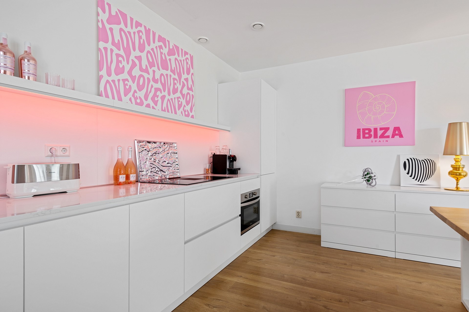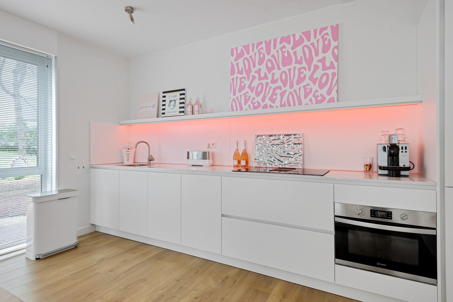 De recent vernieuwde open keuken (2025) is een waar pronkstuk, uitgerust met een, inductiekookplaat met geïntegreerde afzuiger en alle benodigde apparatuur voor een plezierige kookervaring.