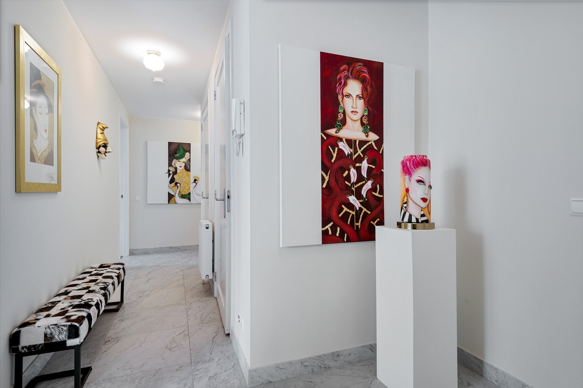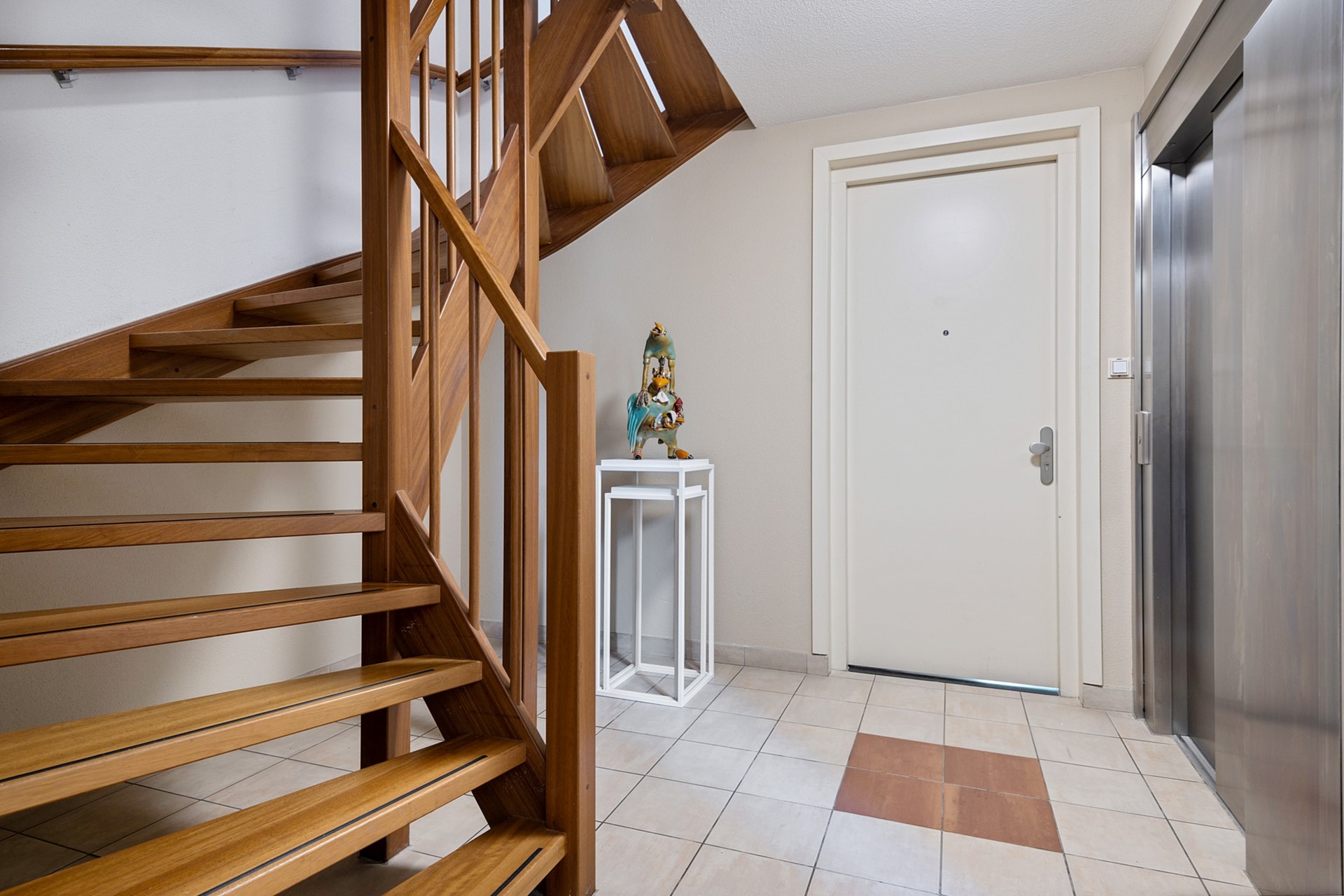 Na binnenkomst in de afgesloten centrale entree komt je bij de voordeur van het appartement. In deze entree vind je ook de trap en de lift van het complex, deze kun je gebruiken om bij de eigen parkeerplaats en de inpandige berging te komen.
