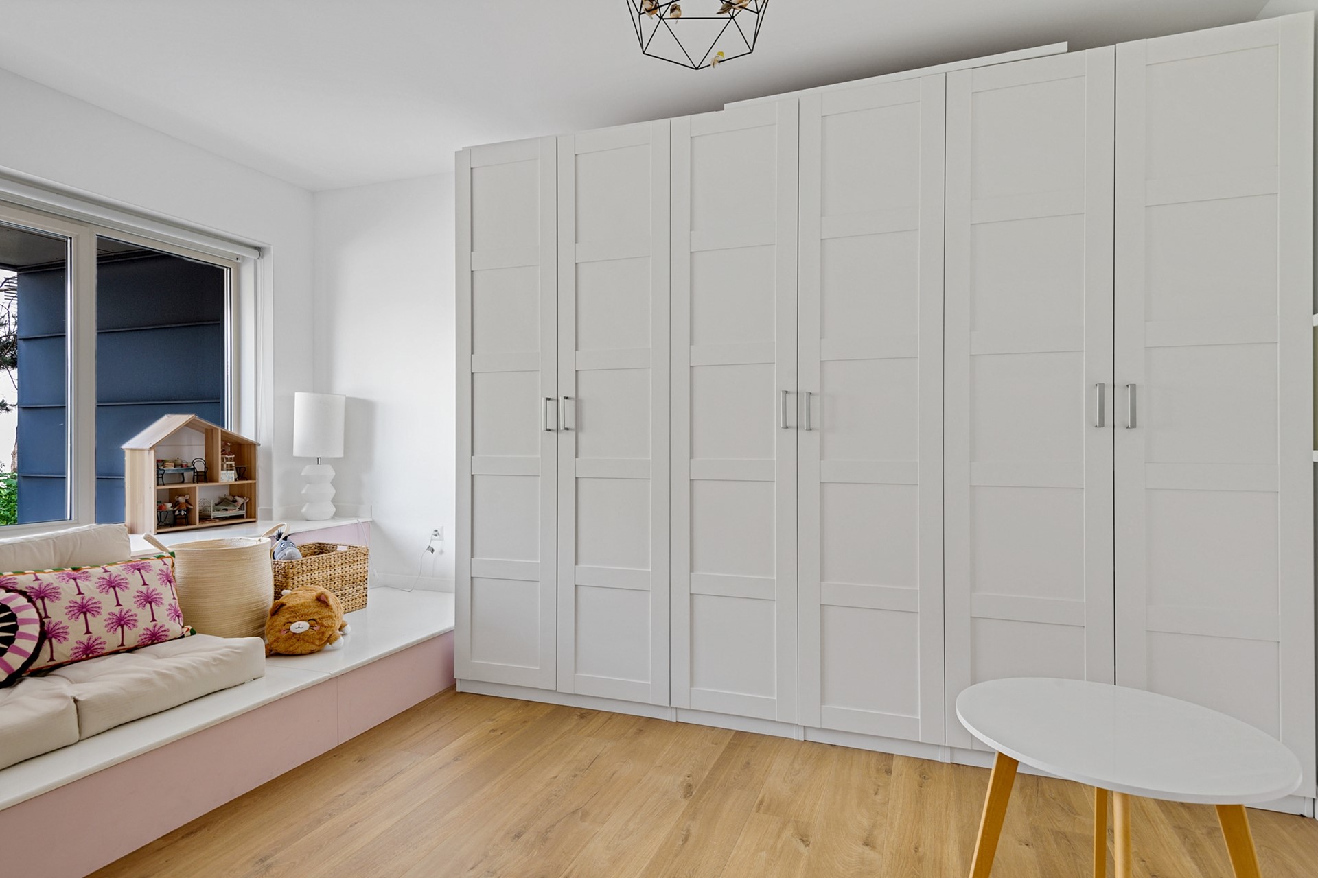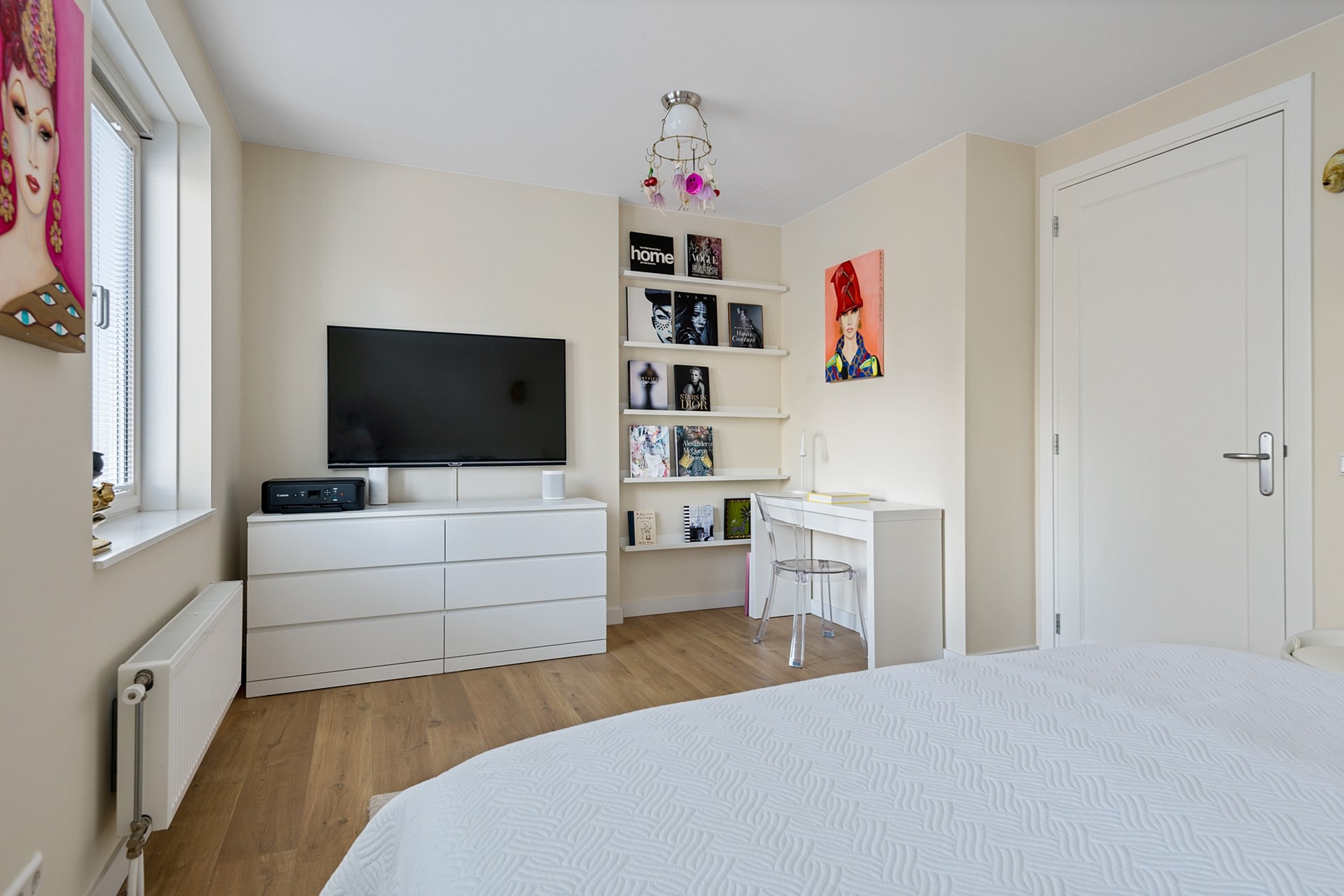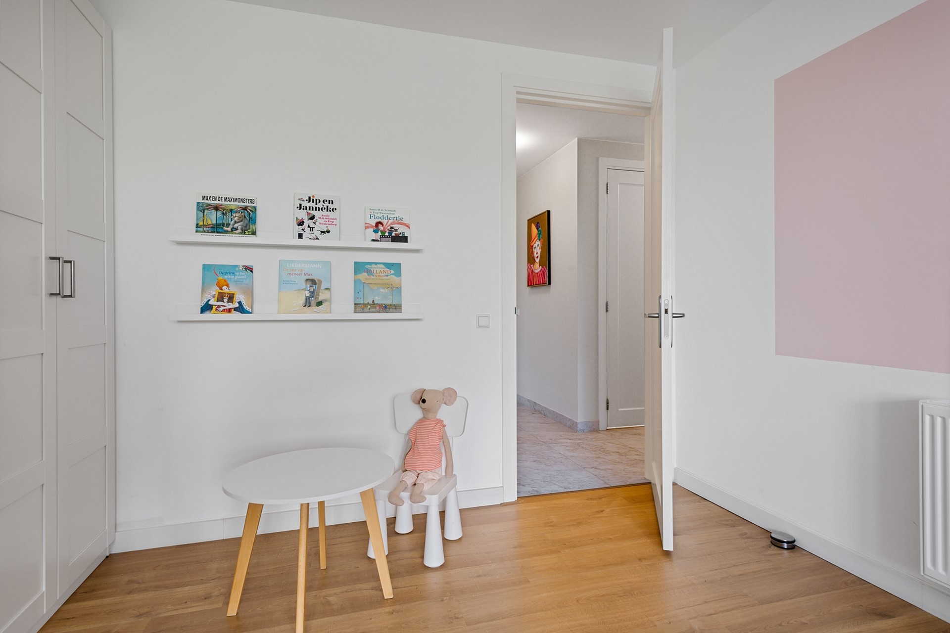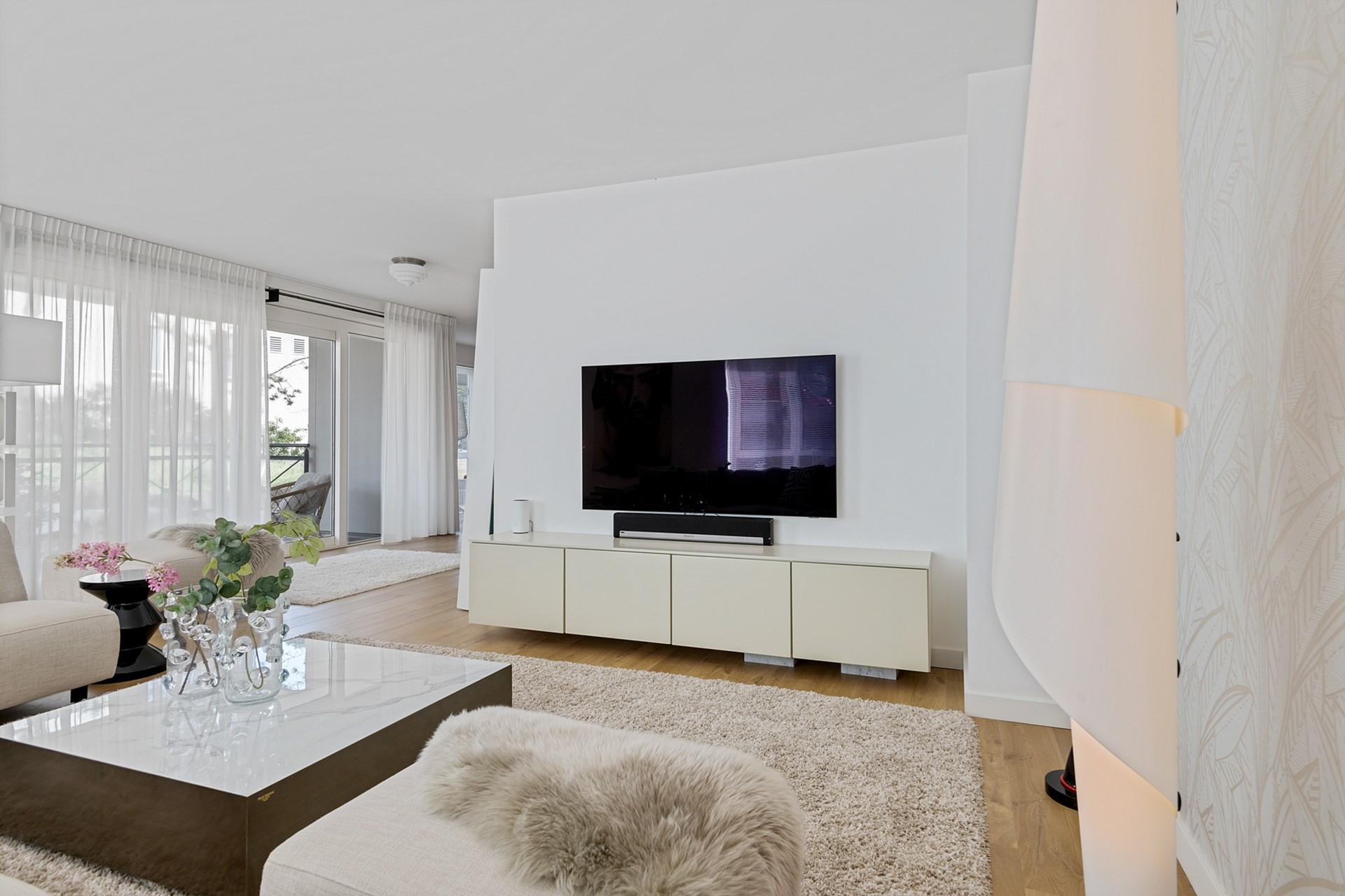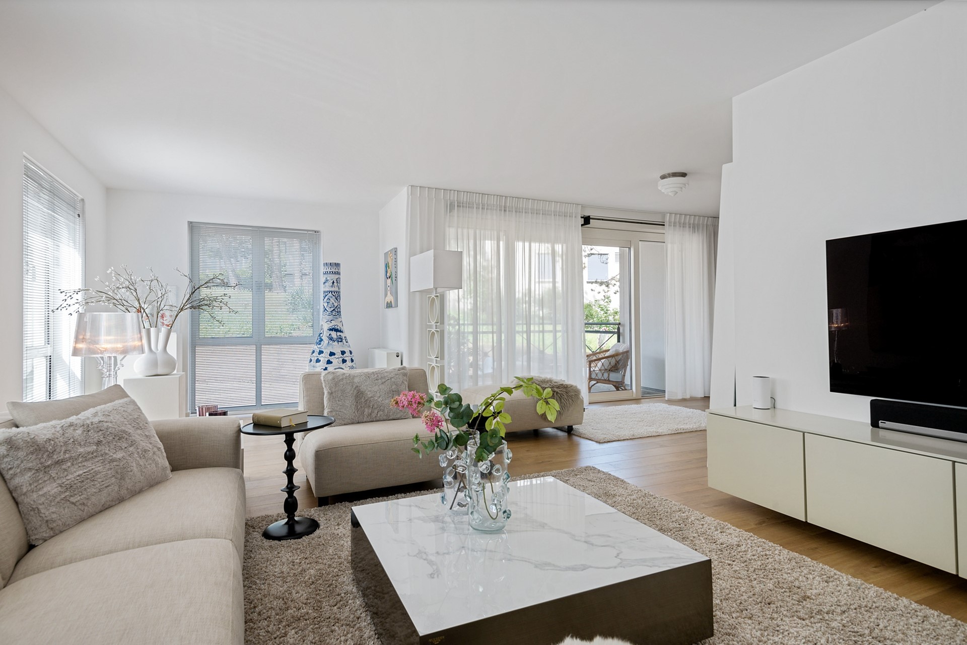 De lichte woonkamer zorgt voor een aangename leefruimte waar je kunt ontspannen en genieten van natuurlijk licht, door de openslaande deuren loop je zo het ruime balkon op.