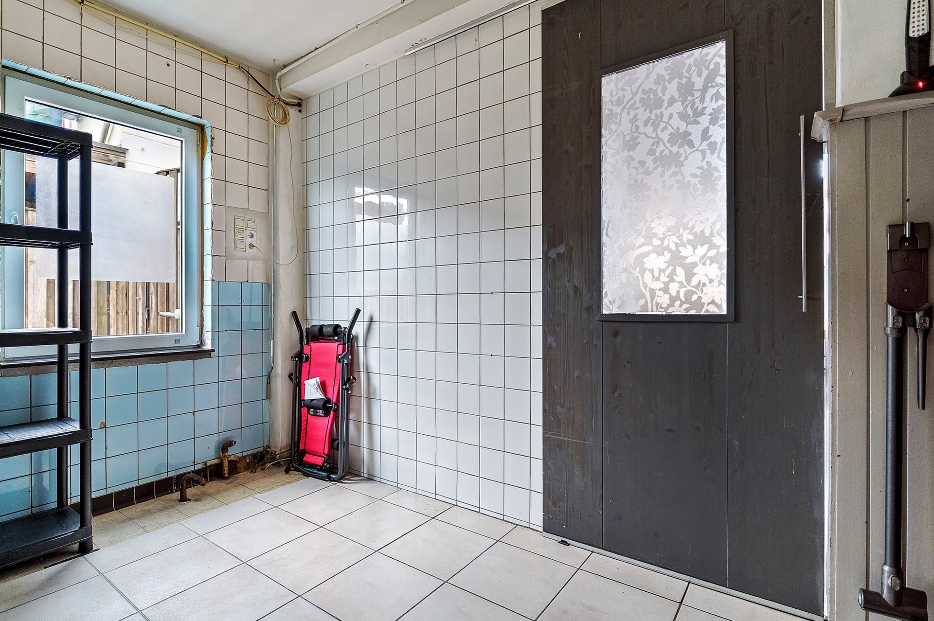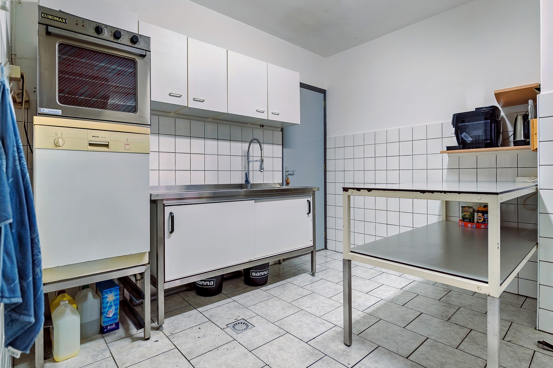 Vanuit de woonkamer komen we in een bijkeuken en via deze bijkeuken is de keuken bereikbaar. Deze voormalige horecakeuken is riant te noemen en geeft toegang tot de kelder, eerste verdieping, wasruimte en slaapkamer met badkamer ensuite. Vanuit de wasruimte is de tuin te bereiken.
