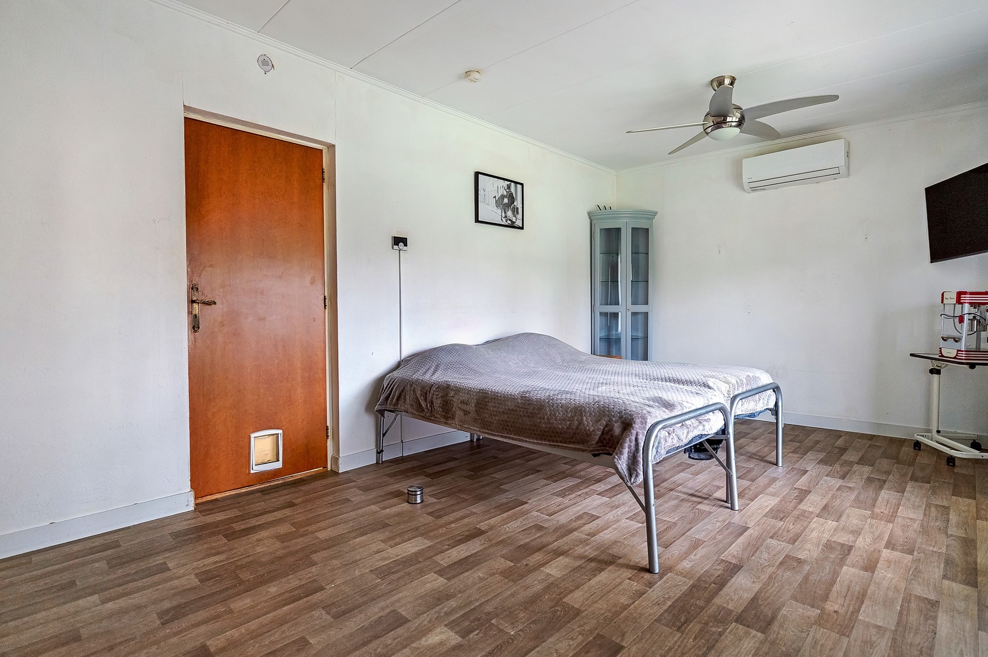 Vanuit de slaapkamer is via de tuindeuren de veranda en achtertuin te bereiken.