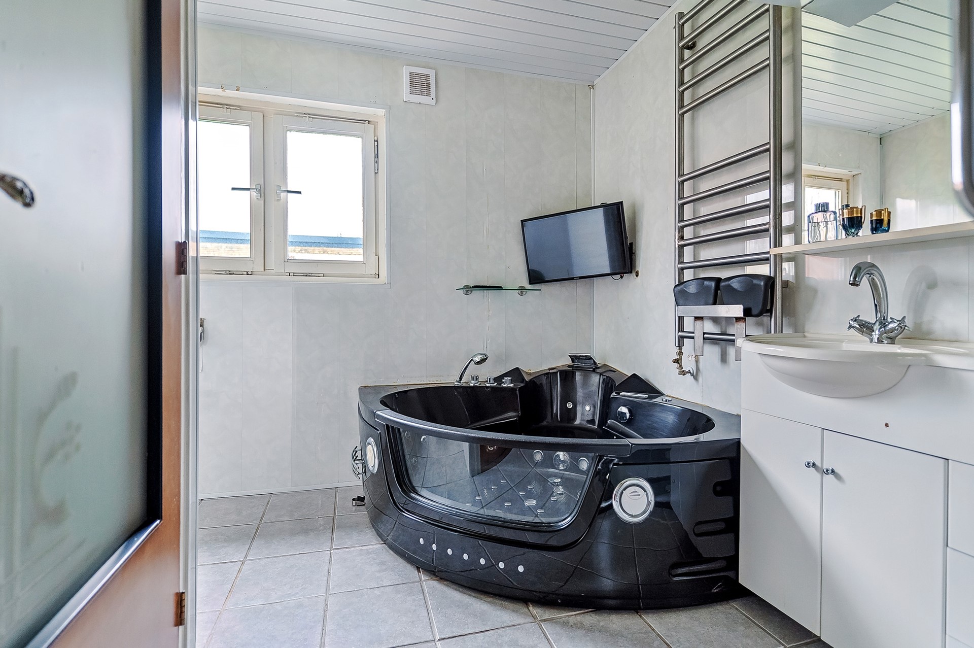 De slaapkamer op de begane grond beschikt over een airco en een badkamer ensuite. Deze badkamer is voorzien van hangend toilet, whirlpool bad, wastafelmeubel en inloopdouche.