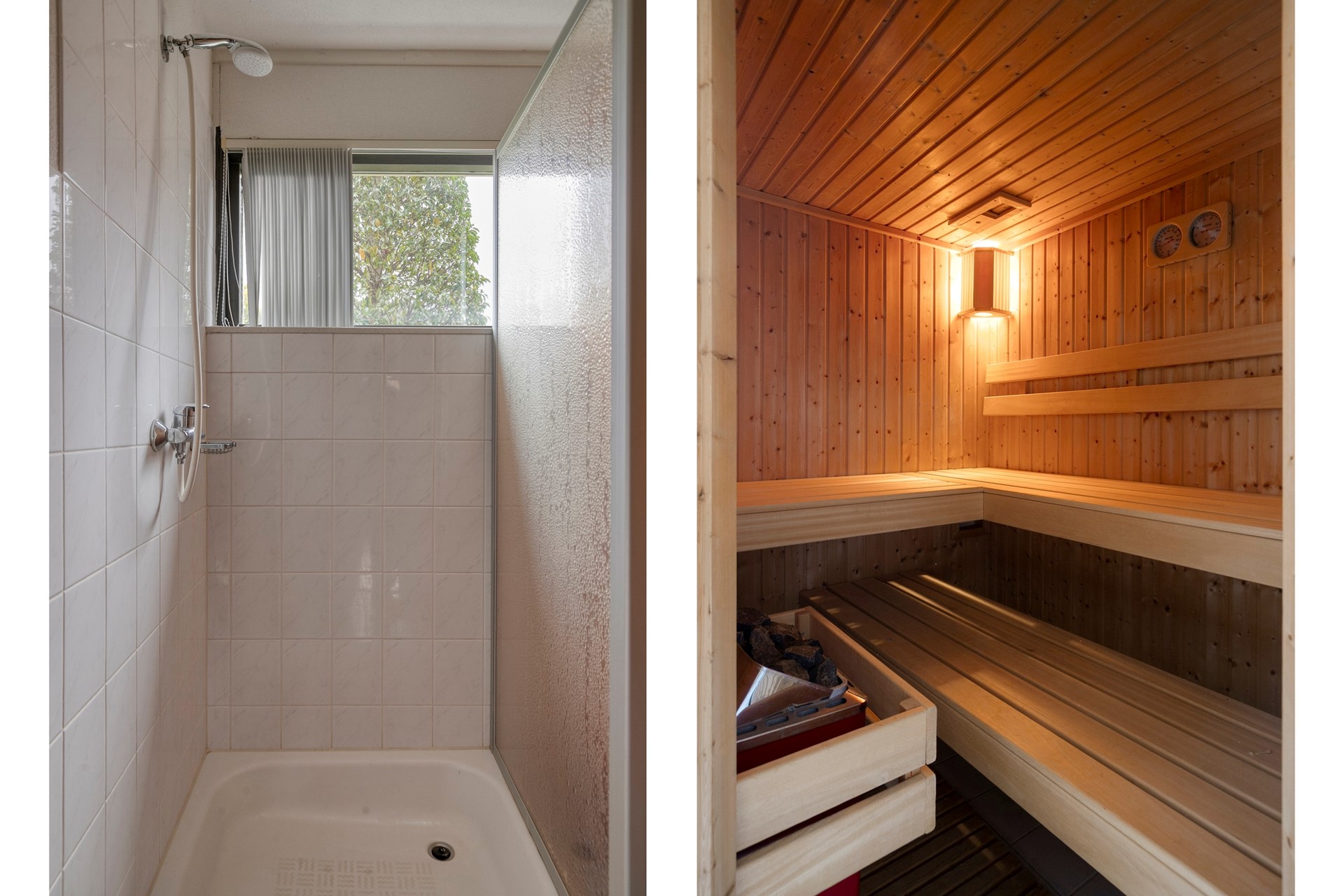 Je komt binnen in de hal met toilet en trapopgang. De speels ingedeelde woonkamer is heerlijk licht dankzij de schuifpui naar de tuin, maar ook aan voorzijde een grote raampartij. De houten vloer geeft direct een warme uitstraling. De open keuken in U-opstelling is voorzien van alle moderne inbouwapparatuur als gaskoken, oven, magnetron, afzuigkap, vaatwasser en koelkast met drie separate vriesladen. Prettig is de werk-/slaapkamer met vaste kastenwand met doorloop naar een extra bijzonderheid: een kamer waarin de sauna staat opgesteld met daarnaast een douche.